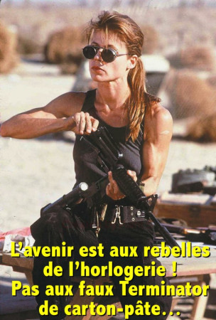« Mon nom est Kyle Reese. Je suis là pour te sauver : Force d’intervention, matricule 38416, chargé de ta protection. Tu es la cible du Terminator »Le 09 / 11 / 2024 à 07:00 Par Le sniper de Business Montres186e épisode de nos « pictochroniques » qui racontent la vie rêvée des montres et le quotidien de l’industrie horlogère : histoire de mieux connaître et de mieux comprendre le microcosme horloger, voici une dizaine de pictofictions – aussi sérieuses sur le fond qu’elles ne se prennent pas au sérieux sur la forme. Merci à l’immense James Cameron pour la citation de « Terminator » (1984 : dialogue entre Kyle Reese et Sarah Connor) qui compose le titre de notre pictochronique. C’est intéressant, le relief que ça pourrait prendre si on reliait cette pensée à l’actualité de l’horlogerie. Non, vous ne trouvez pas ? Allez, cherchez bien ! Il suffit pour ça d’un peu d’imagination, comme le chantait Charles Trenet dans son « Jardin imaginaire »…