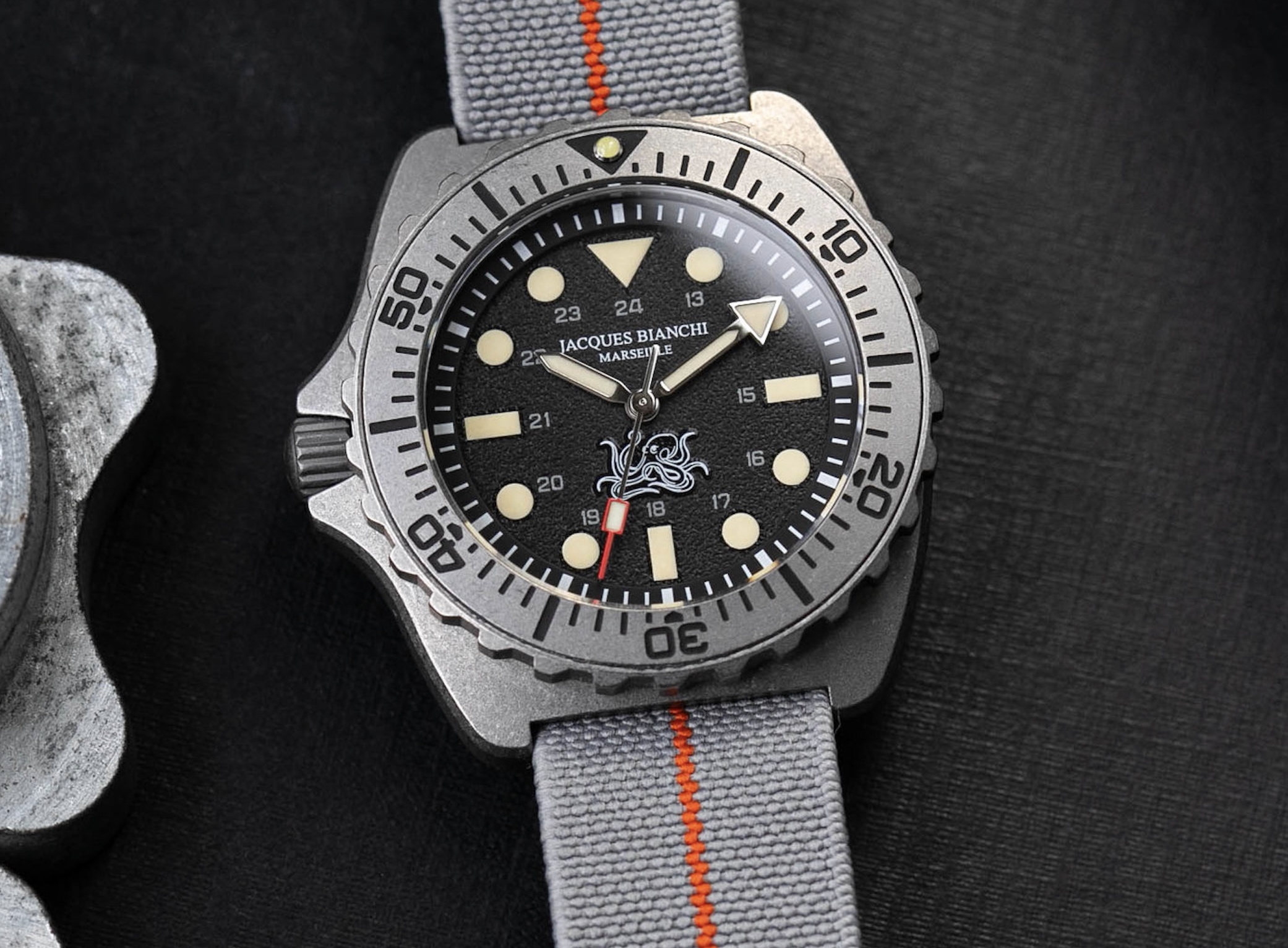 Leader dans l’industrie horlogère française, Jacques Bianchi Marseille continue de repousser les limites de l’innovation avec laJB300. Héritière des montres de plongée militaires des années 1990, la JB300 réunit à la perfection l’esprit robuste et la modernité des lignes contemporaines. Fidèle à son passé, elle conserve l’âme des montres de plongée professionnelles avec sa lunette surdimensionnée et son cadran ultra-lisible la JB300 honore son héritage militaire, séduisant aussi bien les passionnés de plongée que les collectionneurs de montres. Millésimée 2025, la JB300 Poulpro adopte le boîtier de laJB300 Profonde, un container technique usiné en titane grade 5, pensé pour l’eau, l’usage réel et la durée. La boîte est traitée par microbillage successif « stonewashed ». Un processus volontairement long, ajusté par itérations, pour atteindre un équilibre précis : surface mate, nonuniforme, faible réflectivité, absorption des micro-chocs, patine assumée. Ici, le titane ne cherche pas la neutralité. Il revendique un rendu d’outil. Brut. Vivant. Marin. Le titane grade 5 stonewashed donne à la montre un rendu vivant, mat et profond. Il capte moins la lumière,marque moins l’usage et renforce le caractère d’outil de la JB300 Poulpro. Le travail sur la boîte a été poussé plus loin. Les lignes sont plus nettes, les arêtes plus franches, les volumes affinés. La JB300 Poulpro est plus tendue, plus précise, plus engagée visuellement. Depuis 2023, la JB200 Poulpro s’est imposée comme une signature. Une montre adoptée pour ce qu’elle est : lisible, sérieuse, expressive, sans compromis.