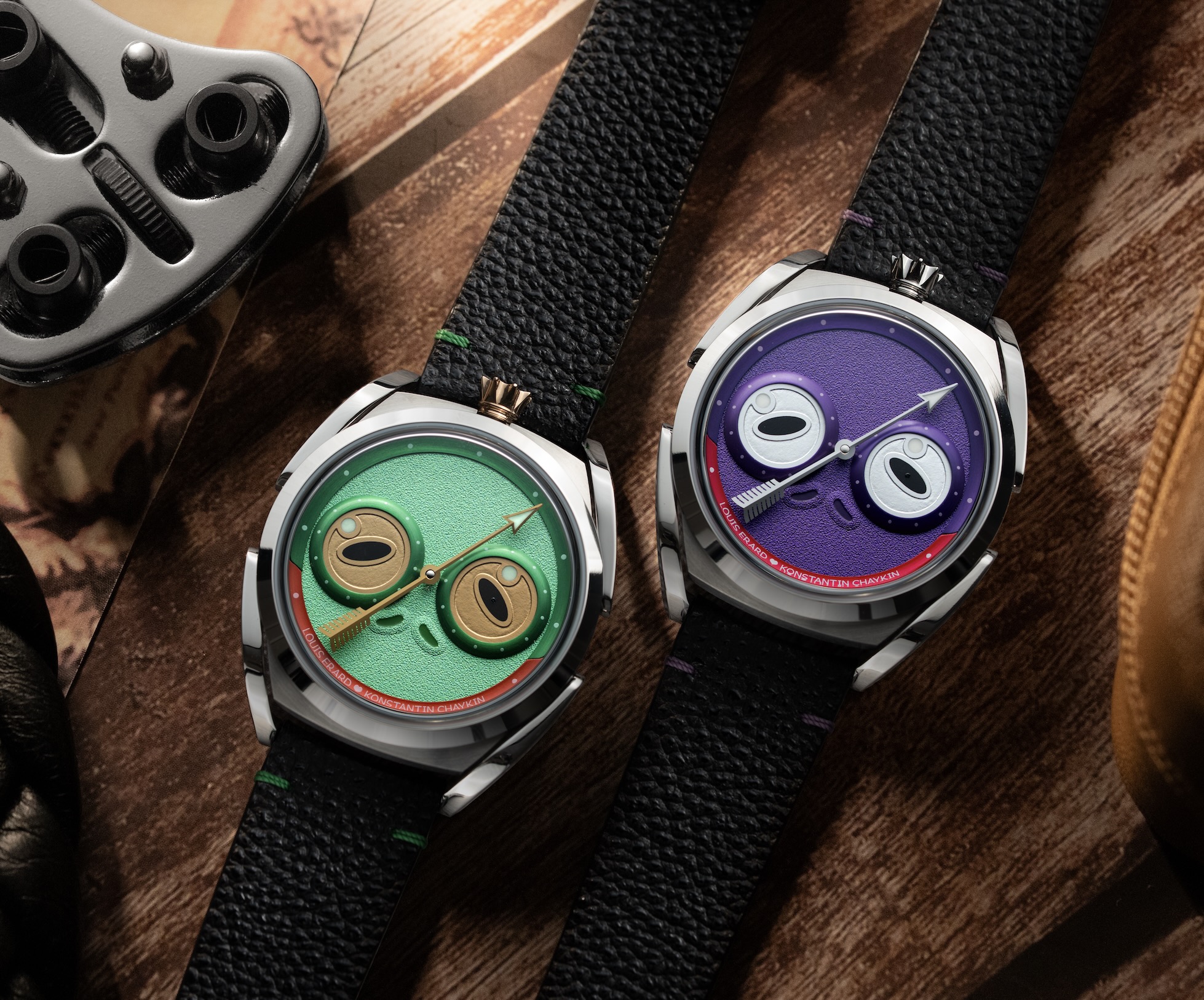 UN COMMENTAIRE ? L’horloger indépendant russe Konstantin Chaykin est la nouvelle coqueluche des amateurs de montres qui ressembleraient toujours à des montres, mais qu’on pourrait qualifier de « rebelles » par rapport au mainstream des maisons horlogères ouest-européennes. Si les créations de Konstantin Chaykin sont effectivement imprégnées d’un vrai esprit de haute horlogerie, elles témoignent aussi d’une liberté créative sans barrières conformistes. Quand l’étincelle Chaykin fait parler la poudre Louis Érard [une autre maison disruptive, mais sous pavillon suisse], on peut s’attendre à tout. Cette fois, c’est Unfrogettable – jeu de mots qui admet la participation d’une grenouille, celle des contes traditionnels russes où le batracien cache le plus souvent une princesse déguisée qui sait porter bonheur quand on la traite avec respect. Regardez les pupilles de cette batracienne de noble extraction horlogère : à gauche, les heures ; à droite, les secondes ; au centre, la fatale flèche des minutes [ceux qui connaissent les contes de la Grenouille comprendront]. Le concept du « régulateur » cher à Louis Érard [séparation de l’affichage des trois dimensions du temps] a donc été respecté par Konstantin Chaykin dans ce boîtier en titane de 40 mm x 12,5 mm d’épaisseur, avec une couronne en… couronne à midi, un mouvement automatique suisse disposant de 38 heures de réserve de marche et un bracelet en cuir japonais, grainé comme une peau de… crapaud et doublé de… lapin vert – le tout en série limitée de 178 pièces ! Unfrogettable, indeed ! Ce qu’il y a de merveilleux avec ce type de cadran, c’est que le jeu des pupilles et de la flèche le rend perpétuellement différent, mais toujours souriant grâce au tour des minutes qui rigole en rouge : une irrévérence de plus de ce M. Chaykin, qui est décidément trop facétieux et trop pertinent dans l’impertinence pour ne pas être un horloger très sérieux…