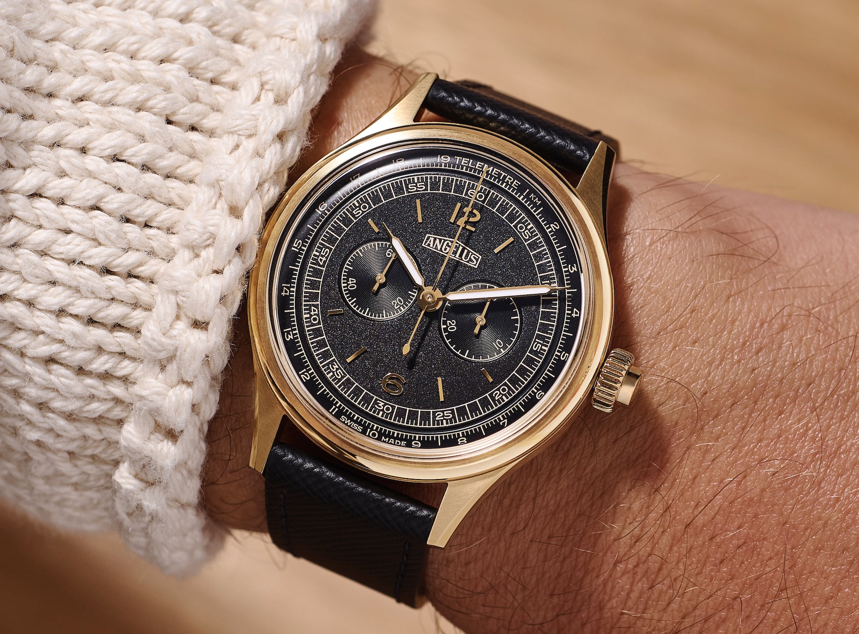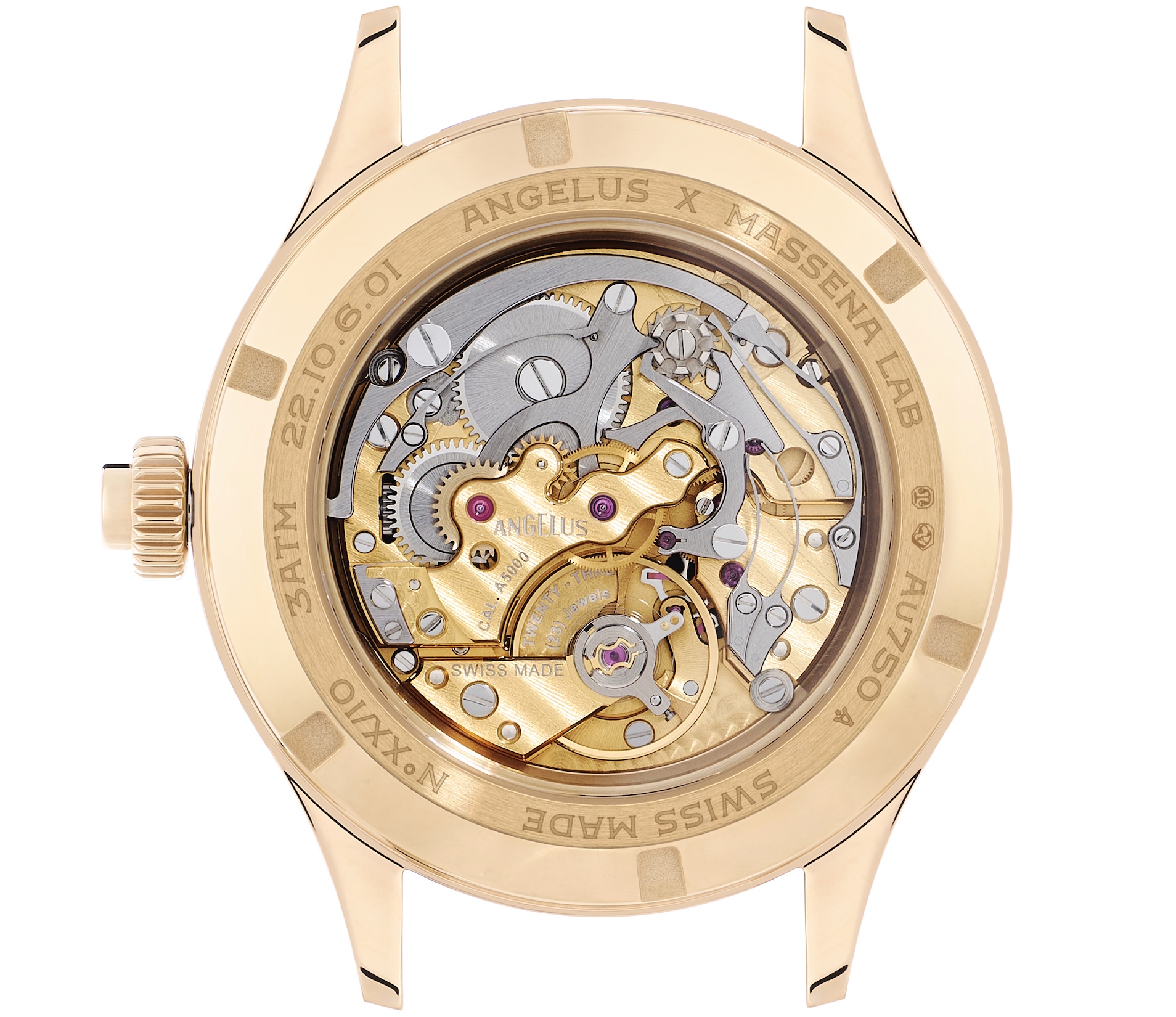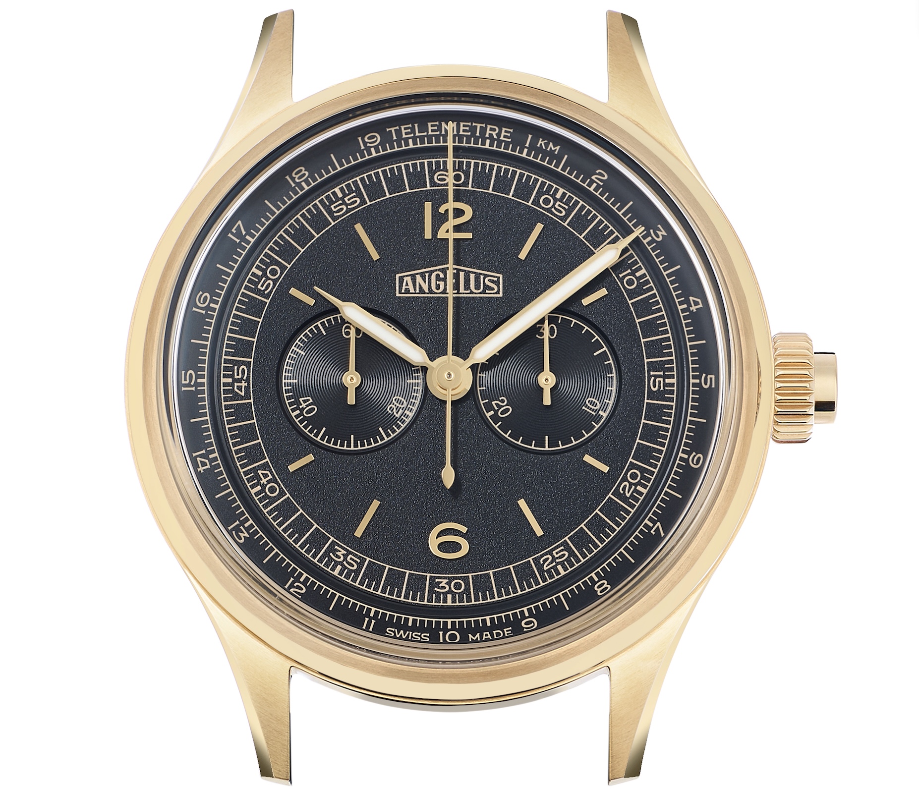 Pour cette série limitée proposée à seulement 10 exemplaires, Angelus et Massena Lab ont fait le choix de placer un cadran noir bombé à l’ancienne sous la glace « box » en saphir. Cette couleur noire, inspirée d’un chronographe vintage en acier de la collection personnelle de William Massena, est rare chez Angelus et offre une qualité de lecture optimale et révèle en majesté l’or du fin boîtier. Son centre grené évite les effets de surbrillance susceptibles de compromettre une lecture instinctive. Ses compteurs azurés garantissent de bien distinguer les trotteuses destinées à indiquer à 9h les secondes permanentes et à 3h les temps du chronographe jusqu’à 30 minutes. Le rehaut satiné reprend la finition du boîtier et contraste avec l’effet grené du centre du cadran. Dans le même esprit de démarcation, l’échelle tachymétrique et le chemin de fer des secondes sont sublimés par un filet diamanté qui sépare élégamment les deux zones. Les index et les chiffres arabes appliqués sont dorés 3N tout comme les aiguilles qui sont ajoutées de Super-LumiNova. Une fonctionnalité utile : initialement inventée pour les militaires de l’infanterie, l’échelle télémétrique a pour objet de permettre la mesure de la distance séparant le porteur de la montre d’un événement produisant un éclat lumineux et un son. On l’aura compris, l’idée était de permettre de mesurer la distance séparant l’émetteur (le canon) du récepteur (le cratère d’impact) en sachant que la vitesse de déplacement du son dans l’air est de l’ordre de 360 mètres à la seconde (exactement 1240 km/h). Cet outil se révèle également précieux en cas d’orage, permettant de déterminer si le phénomène se rapproche ou s’éloigne grâce à la mesure de la distance des impacts de foudre. Il suffit pour cela d’enclencher le chronographe au moment où l’éclair apparaît, puis de l’arrêter dès que le tonnerre se fait entendre. Le télémètre fait partie des échelles de mesure associées à la trotteuse du chronographe. On y retrouve également les échelles pulsométriques, tachymétriques, décimales et asthmométriques — cette dernière figurant déjà sur le Chronographe Médical x Massena Lab. Cette première collaboration avait marqué les débuts de la gamme Angelus La Fabrique en 2023.