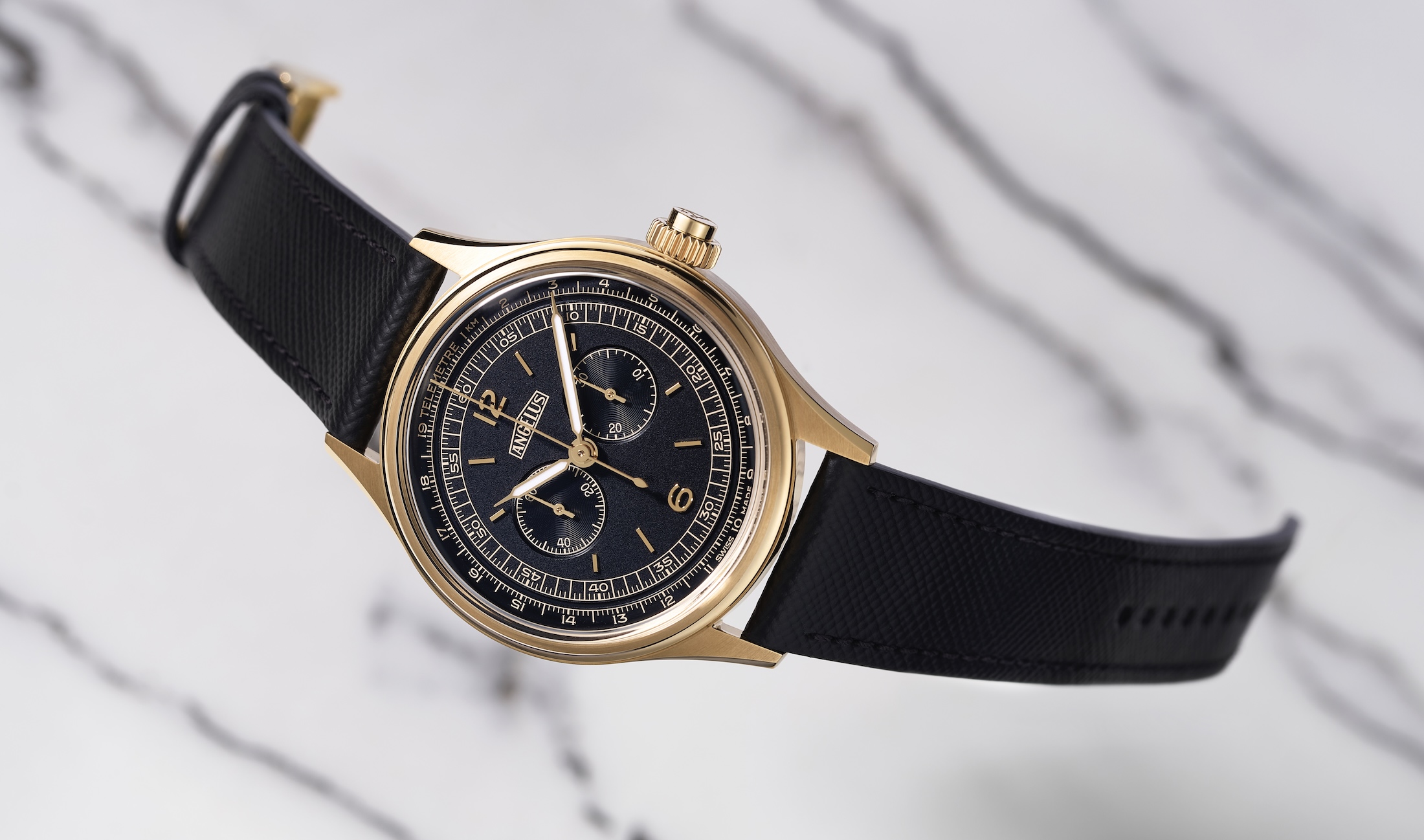 La Maison Angelus, fondée en 1891 par les frères Stolz, lance un Chronographe Télémètre réalisé en collaboration avec Massena Lab. Habillée d’un boîtier en or jaune 18 carats, cette pièce au dessin intemporel est proposée en édition limitée à seulement 10 exemplaires. De 37 mm de diamètre et équipé d’un calibre « vintage » à remontage manuel, l’instrument est doté d’un seul poussoir inscrit dans la couronne de remontoir. Paré pour l’occasion d’un cadran noir fort rare dans la production de la Maison, il séduira les adeptes de garde-tempsd’exception au design élégant et un brin rétro. Un boîtier de taille raisonnable : avec ses 37 mm de diamètre et seulement 9,25 mm d’épaisseur, le Chronographe Télémètre est le plus compact des modèles contemporains d’Angelus, maison horlogère reconnue par les professionnels pour son expertise dans la création de chronographes techniques. La carrure classique est en or jaune (3N) 18 carats. Dans l’esprit des instruments créés par Angelus dans la première moitié du siècle dernier, elle présente une fine lunette permettant d’offrir à la pièce une grande surface de lecture. Ses lignes tendues si typiques des années 1930-40 sont adoucies par la présence d’un profond galbe qui, courant de corne à corne, assure un agrément de port exceptionnel au poignet. Ses arêtes polies, plongeantes sur le dessus, en torsion sur le flanc, soulignent le dessin inspiré de ses attaches. Tous ces détails,sublimés par l’expertise de Massena LAB — spécialisée dans la mise en valeur des créations horlogères grâce à une recherche approfondie de leurs atouts — insufflent une dynamique à cet instrument de mesure des temps courts, tout en affirmant la signature vintage propre à la collection La Fabrique. Dans le but de conserver cet esprit, ce chrono fin et typé se porte sur un bracelet en cuir Saffiano noir et se ferme au poignet à l’aide d’une classique boucle ardillon en or jaune.