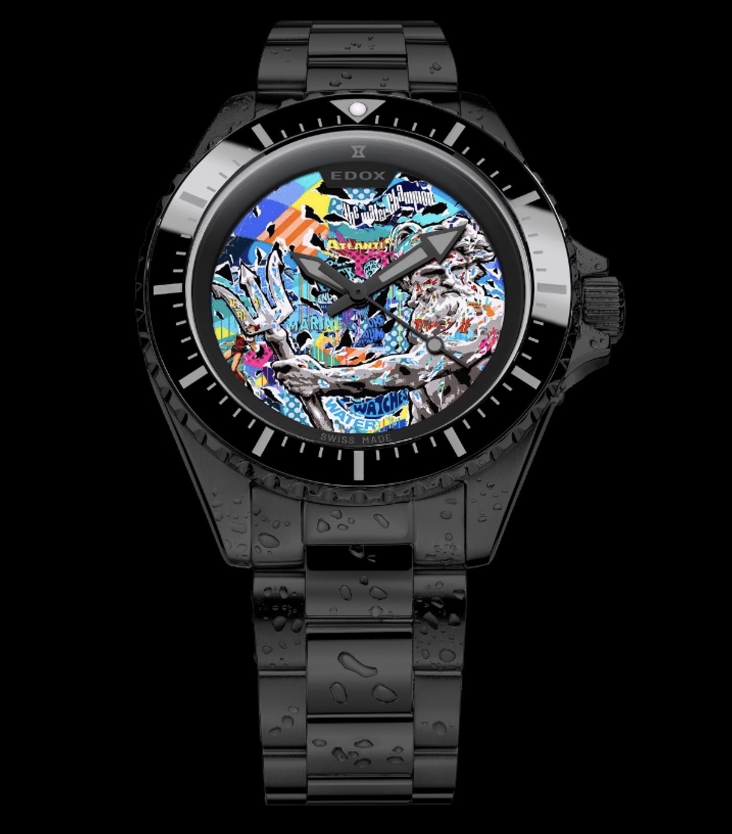 La Edox Pop Neptunian est éditée à seulement 100 exemplairesdans le monde, chacune incarnant la parfaite fusion entre l’art etl’horlogerie. Et pour quelques privilégiés, l’expérience va encore plus loin : dix écrins exclusifs ont été personnalisés à la main par Jo Di Bona lui-même, transformant chaque boîte en une véritable pièce de collection unique. Fidèle à l’héritage de plongée d’Edox, la Pop Neptunian conserve les caractéristiques emblématiques de la marque :lunette en céramique, couronne vissée et verre saphir de 3 mm d’épaisseur. Dans cette réinterprétation, ces éléments techniquesdépassent leur fonction première sous-marine pour devenir des symboles de qualité, de durabilité et de design affirmé dans un univers urbain contemporain. Sous le cadran expressif bat un mouvement automatique suisse SW200, logé dans un boîtier en acier inoxydable de 42 mm revêtu de PVD noir mat. Le cadran reproduit l’œuvre Pop Neptunian de Jo Di Bona grâce à une technique de polyfrappage de haute précision, capturant les contrastes vifs et les textures superposées de la pièce originale. Des éléments en Super-LumiNova blanc s’illuminent dans l’obscurité, révélant des détails inattendus et conférant à l’œuvre une présence dynamique, presque aquatique. Le fond de boîte porte la signature de Jo Di Bona, subtilement mise en relief brillante sur un fond mat. Née d’un élan artistique et d’une volonté commune d’explorer de nouveaux territoires créatifs, Pop Neptunian redéfinit avec audace les codes de la montre de plongéecontemporaine.