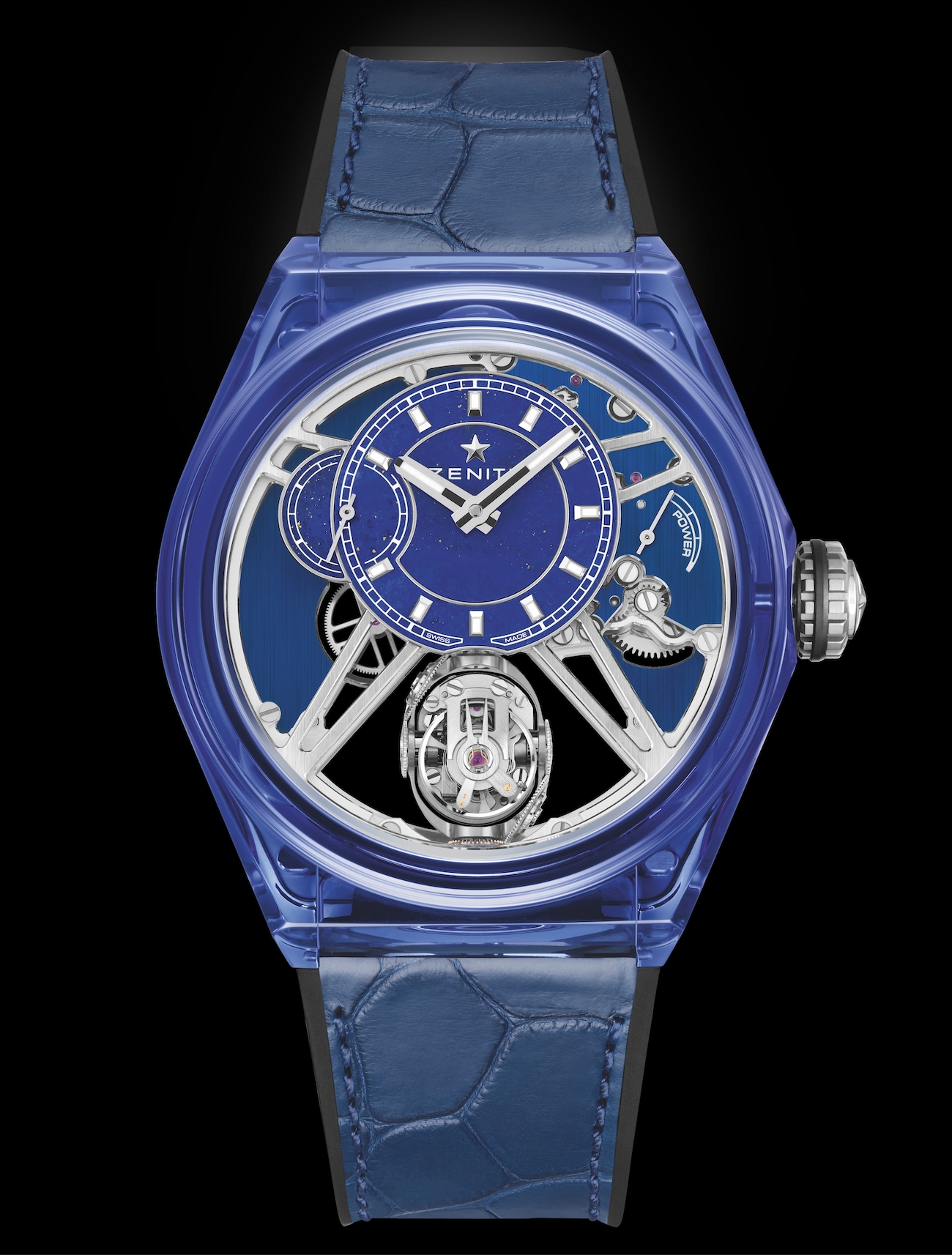 Présentée en 2008, la Zenith Zero G a été perfectionnée en 2018 avec un module « Gravity Control » 70 % plus compact. Ce dernier, composé de 139 éléments, tient dans un volume de seulement 1,3 cm³ (13,40 mm x 10,90 mm x 8,84 mm), et intègre pas moins de 9 roulements à billes en céramique, antimagnétiques et sans lubrification.En 2021, Zenith a réinterprété ce calibre de haute horlogerie, en repensant son architecture pour un affichage plus ouvert et spectaculaire, le tout encapsulé dans un boîtier en saphir transparent qui révèle le mécanisme sous tous les angles. Pour célébrer son 160ᵉ anniversaire, la Manufacture présente deux nouvelles éditions limitées Defy Zero G, dans des boîtiers de 46 mm façonnés en saphir bleu ou transparent. La carrure, la lunette et le fond sont taillés dans des blocs de saphir, un matériau presque aussi dur et résistant aux rayures que le diamant. Dans la continuité de ce thème anniversaire, les heures, minutes et secondes décentrées se lisent sur un cadran en lapis-lazuli, ponctué d’index facettés luminescents. Son bleu profond, parsemé d’inclusions dorées de pyrite, évoque un ciel étoilé, conférant à chaque pièce un caractère unique. La réserve de marche de 50 heures s’affiche à 3 h. Visible recto-verso, le calibre El Primero 8812S à remontage manuel et ajouré met en scène ses ponts élancés aux reflets clairs, évoquant des étoiles. Son architecture aérienne offre une vue fascinante sur le module Zero Gravity à 6 h, qui pivote pour rester en position horizontale. L’échappement en silicium est associé à une ancre en nickel-silicium, tandis que le balancier adopte un régulateur à double flèche, hommage à l’horloger Zenith Charles Fleck. Animé à 5 Hz, le calibre garantit une précision extrême. Le contrepoids du module est orné d’une gravure rappelant un astre céleste. Les Defy Zero G Sapphire sont proposées avec un bracelet intégré en alligator bleu, assorti d’une boucle déployante. Produites chacune à seulement 10 exemplaires, les Defy Zero G en saphir sont disponibles dans les boutiques Zenith, en ligne et chez les détaillants agréés à travers le monde.