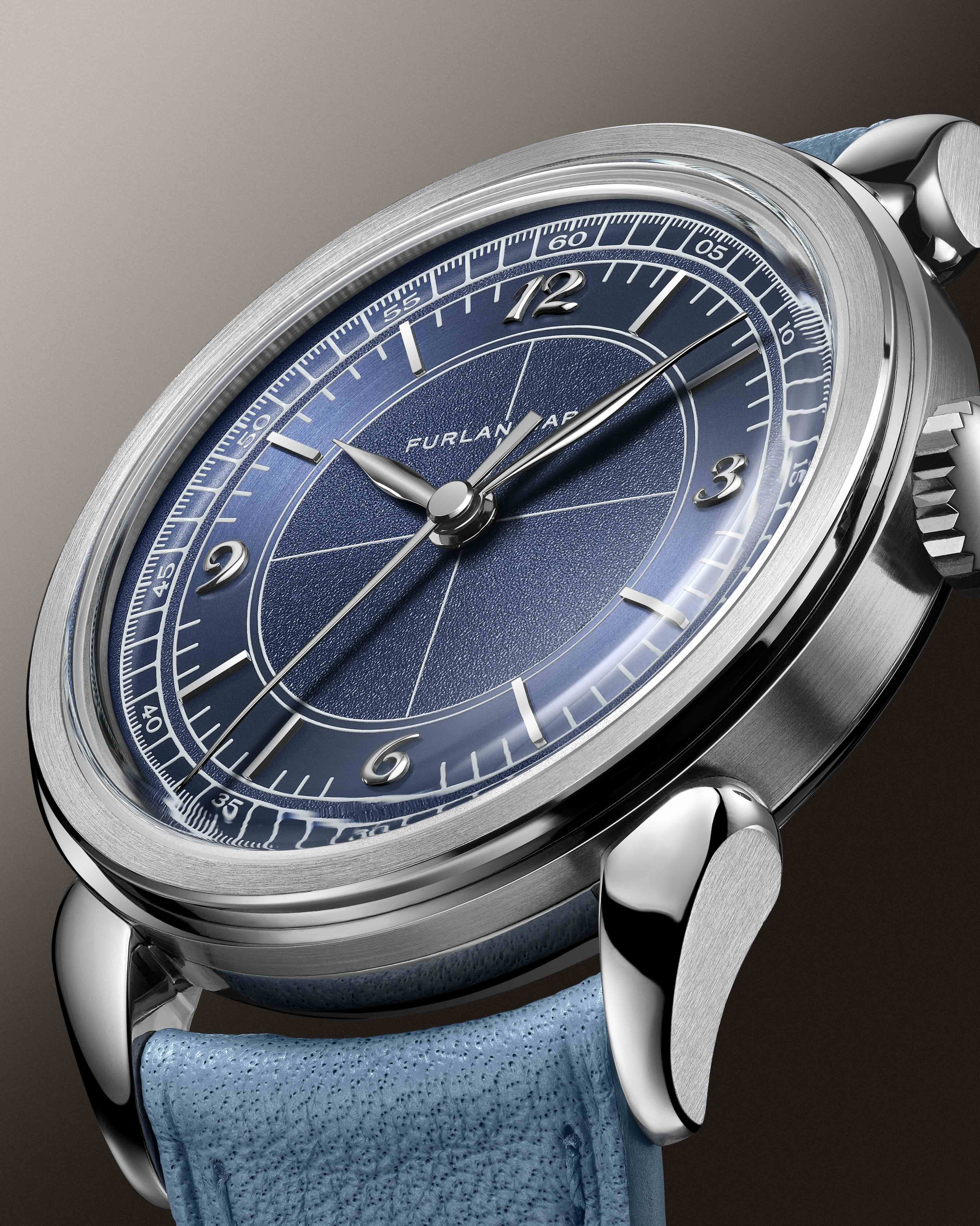 Furlan Marri présente la collection Cornes de Vache, composée de trois références automatiques, chacune reconnaissable à son cadran secteur unique : White Sector, Salmon Sector et Blue Sector. Introduit pour la première fois dans les années 1930, le cadran secteur sedistingue par ses cercles concentriques et ses lignes radiales, renforçant la lisibilité et apportant équilibre et harmonie. Aujourd’hui encore, il demeure un design intemporel, à la croisée entre fonctionnalité et élégance vintage. Furlan Marri réinterprète ce design à travers trois références : White Sector, Salmon Sector et Blue Sector. Tous trois partagent les mêmes codes : une structure sectorisée, desindications réalisées par double impression et des index appliqués de style Breguet, qui apportent relief et profondeur. Ce qui les distingue se trouve dans les détails : surface finement grenée, aiguilles en PVD gunmetal ou en acier bleui, autant de variations qui illustrent la diversité des finitions de la collection. Chaque référence est dotée d’un verre en saphir traité avec plusieurs couches antireflet et anti-traces, garantissant la protection du cadran. Le boîtier en acier inoxydable est façonné en plusieurs étapes. Un soin particulier est apporté aux cornes, dont les finitions sont réalisées séparément avant l’assemblage, puis reliées par un pont visible à six et douze heures. Inspirées des montres des années 1940, les « cornes de vache » sont reconnaissables par leur forme courbée et leur construction rapportée — un design emblématique qui a donné son nom à la collection. Fidèle à notre souci du détail, elles sont dotées de deux positions de barrette, assurant unajustement parfait du bracelet, qu’il soit droit ou courbé.