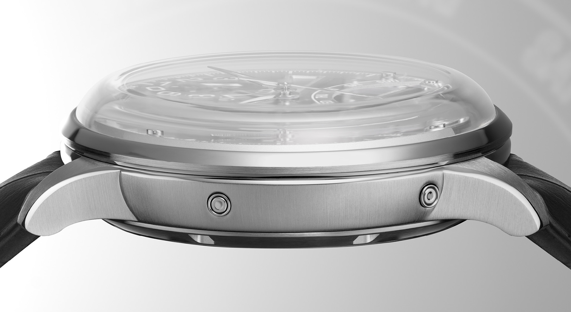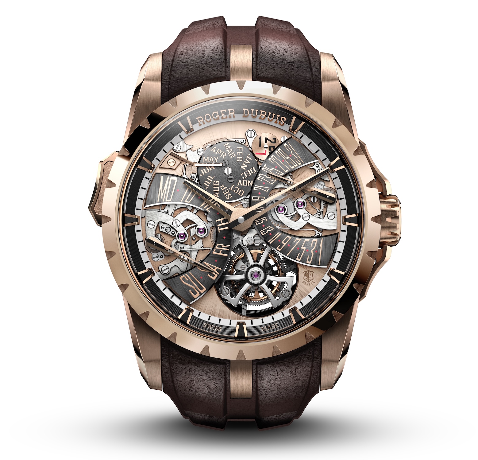 UN COMMENTAIRE ? On peut parler d’involution plutôt que d’évolution. Après des années où elle a failli perdre son âme dans des productions baroques et boursouflées dont les épaisseurs sont aujourd’hui totalement démonétisées par la vogue des montres vintage qui en reviennent aux formes ultra-minces des années 1960, la maison Roger Dubuis renoue avec l’héritage d’un de ses fondateurs, le génial maître-horloger Roger Dubuis, virtuose des mécaniques bi-rétrogrades, si furieusement tendance à la fin des années 1990. Le paradoxe et qu’on a collé cet affichage, si à l’aise dans des boîtiers tonneaux, dans un boîtier rond où il faut le déformer pour qu’il tienne. Si les pièces de ces huit pièces uniques peuvent varier selon le métal du boîtier et son enrichissement joaillier, il ne s’en situera pas moins aux alentours de 800 000 euros, ce qui le réservera à une catégorie très spéciale d’opulents oligarques qui n’ont plus forcément la tête à ces compilations de complications mécaniques (boîtier massif en or non moins massif de 45 mm x 17,4 mm, étanche à 50 m et animé par un mouvement automatique donné pour 60 heures de réserve de marche). Dommage que la montre soit si « brutale » dans son allure : ce mouvement méritait un peu plus d’élégance fonctionnelle…