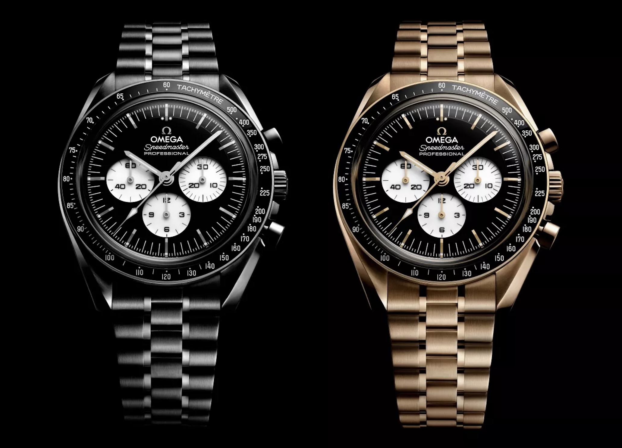 Les deux modèles de 42 mm de la gamme comprennent une version en acier inoxydable. Toutes les aiguilles et tous les index sont rhodiés et recouverts de Super-LumiNova blanc. Également, une version en or Moonshine 18 carats, l'alliage d'or jaune durable propre à Omega. Le cadran comprend des aiguilles des heures et des minutes, des aiguilles de sous-cadrans et des index, tous en or Moonshine 18 carats avec Super-LumiNova blanc, ainsi qu'une aiguille centrale de chronographe en or Moonshine PVD. Ces montres Speedmaster Moonwatch Professional sont toutes équipées du calibre Omega Co-Axial Master Chronometer 3861, l'évolution la plus avancée du célèbre calibre 321 auquel les astronautes de la NASA ont fait confiance sur la Lune. Cette qualité mécanique permet aux montres de bénéficier d'une garantie de 5 ans, ainsi que de la certification Master Chronometer qui garantit le plus haut niveau de précision, de performance et de résistance magnétique de l'industrie horlogère suisse.