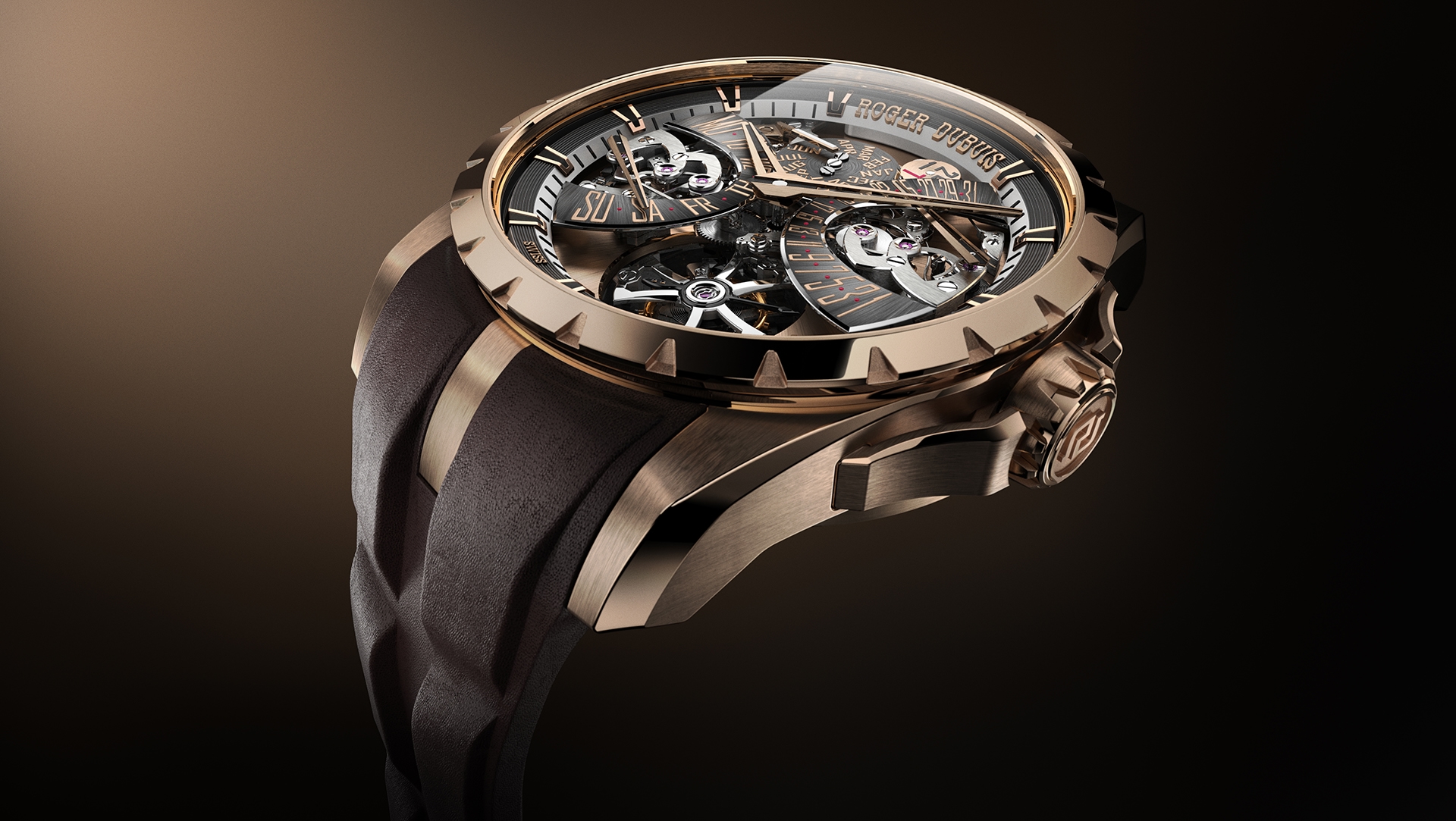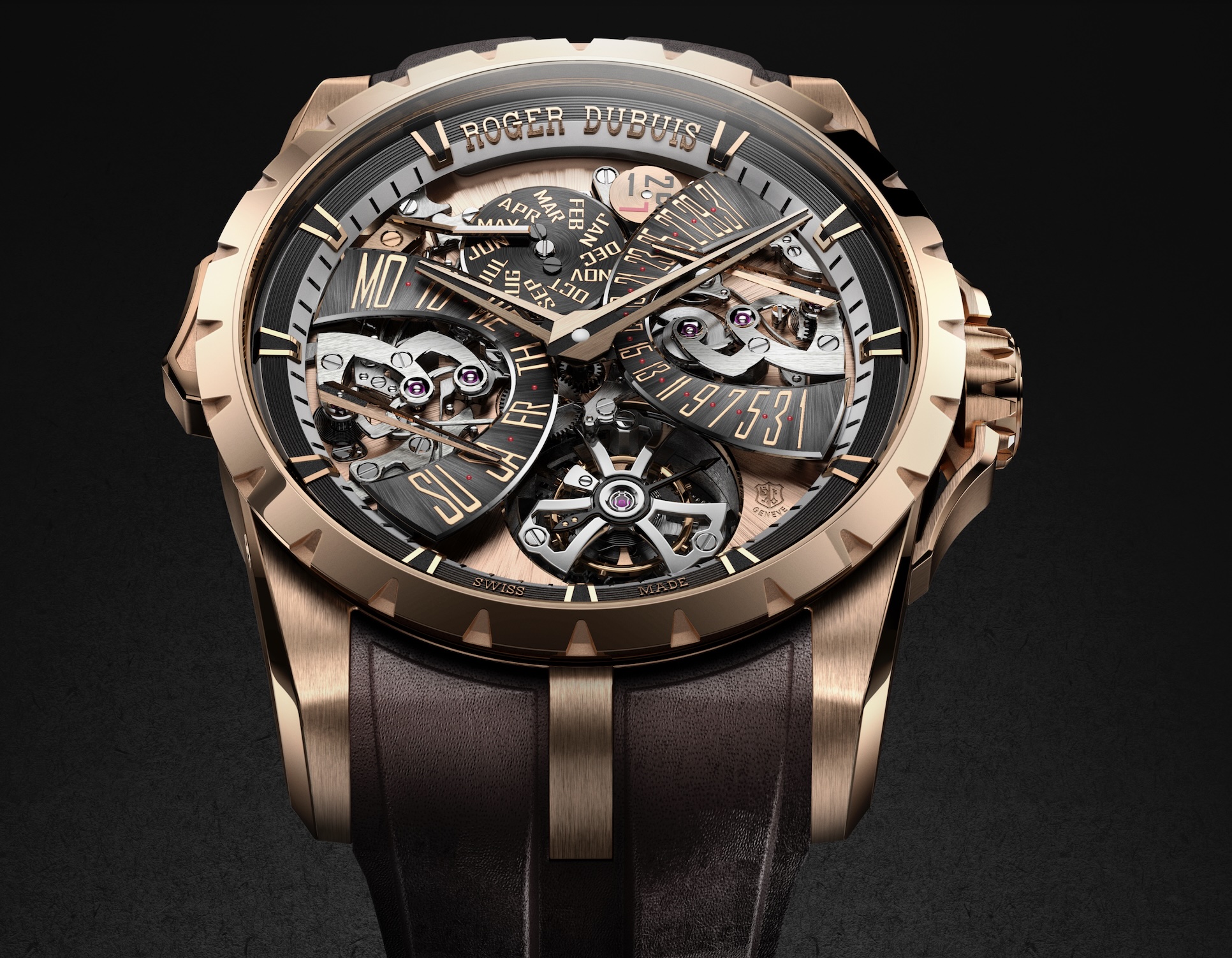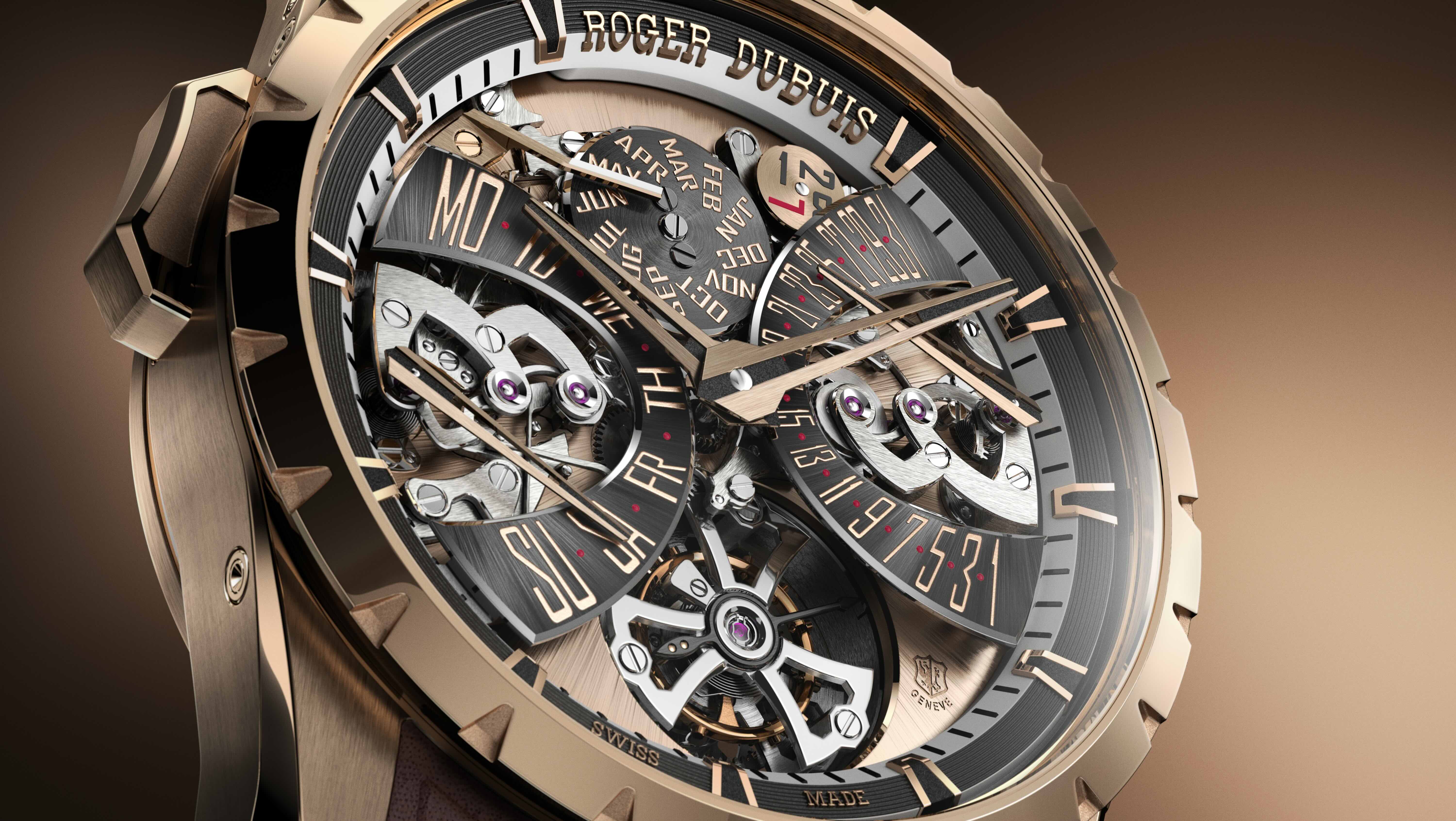 Façonner un calendrier perpétuel n’est pas une tâche aisée. Cependant, pour Roger Dubuis, la difficulté faisait toute la beauté du défi. Cette complication était sa préférée, et, en horloger particulièrement patient, il éprouvait un grand plaisir à consacrer des heures à la fabrication complexe du mécanisme. M. Dubuis savait que le calendrier perpétuel était très difficile à maîtriser et qu’il « faisait peur à tout le monde ». Son approche unique consistait précisément à ne pas se laisser intimider par ses émotions, mais à les écouter pour les mettre au profit de sa créativité. Le travail de toute sa vie est empreint de cette passion et de cette détermination. La fabrication d’un calendrier perpétuel nécessite en effet un niveau constant de persévérance dans la conception. Pour rendre compte de la complexité du calendrier grégorien, il doit être doté d’une mémoire mécanique irréprochable, afin de garantir sa précision pour des décennies. Cela inclut les calculs automatiques de la durée des mois, avec 28, 30 ou 31 jours, ainsi que l’ajustement des années bissextiles, qui ont lieu tous les quatre ans. L’Excalibur Grande Complication répond à ces exigences aussi nécessaires que complexes, et ne requiert aucune correction manuelle jusqu’en 2100, intervention dont l’effet durera 100 ans. Les performances de ce calendrier perpétuel vont encore plus loin, en présentant ses informations sur un affichage bi-rétrograde. Cette complication permet aux aiguilles du calendrier de se déplacer le long des échelles de dates semi-circulaires, avant de revenir immédiatement à zéro à la fin de leur cycle. Si la carrière de Roger Dubuis est pavée d’innovations significatives, le développement de l’affichage bi-rétrograde est sans doute l’une des plus marquantes. Dans les années 1980, il travaille aux côtés de Jean-Marc Wiederrect. Ensemble, ils créent de nombreux calibres et déposent plusieurs brevets véritablement novateurs pour l’époque. Parmi eux, le système d’affichage rétrograde, que les deux horlogers ont optimisé et modernisé avec tout leur talent.En 1995, Roger Dubuis utilise ce brevet conjoint pour créer sa toute première montre. Aujourd’hui, l’affichage bi-rétrograde de l’Excalibur Grande Complication inclut deux échelles individuelles, une pour le jour de la semaine et une autre pour le jour du mois. Toutes deux sont équipées des aiguilles squelettées de la collection Excalibur à saut semi-instantané. Ces deux échelles sont accompagnées d’un disque des mois placé entre 11 et 12 heures, et d’une petite indication des années bissextiles sur le côté. Dès le début des années 1980, M. Dubuis déploie toute sa créativité pour réinventer les codes esthétiques et les défis techniques de l’affichage bi-rétrograde. Ce nouveau garde-temps incarne la continuité et l’évolution de cet héritage. Héritage auquel la montre rend hommage en empruntant plusieurs codes esthétiques de Roger Dubuis, notamment la police historique et la forme expressive des échelles, larges sur l’extérieur et plus étroites au centre. Elle reprend ainsi le style traditionnel exact de la montre originale de la Maison de 1995. Autre touche caractéristique, le positionnement équilibré des complications sur le cadran. Bien que légèrement incliné d’un degré, l’alignement symétrique du calendrier perpétuel et du tourbillon automatique est un clin d’œil graphique aux créations passées de Roger Dubuis, comme la montre de poche Millésime de 2015.