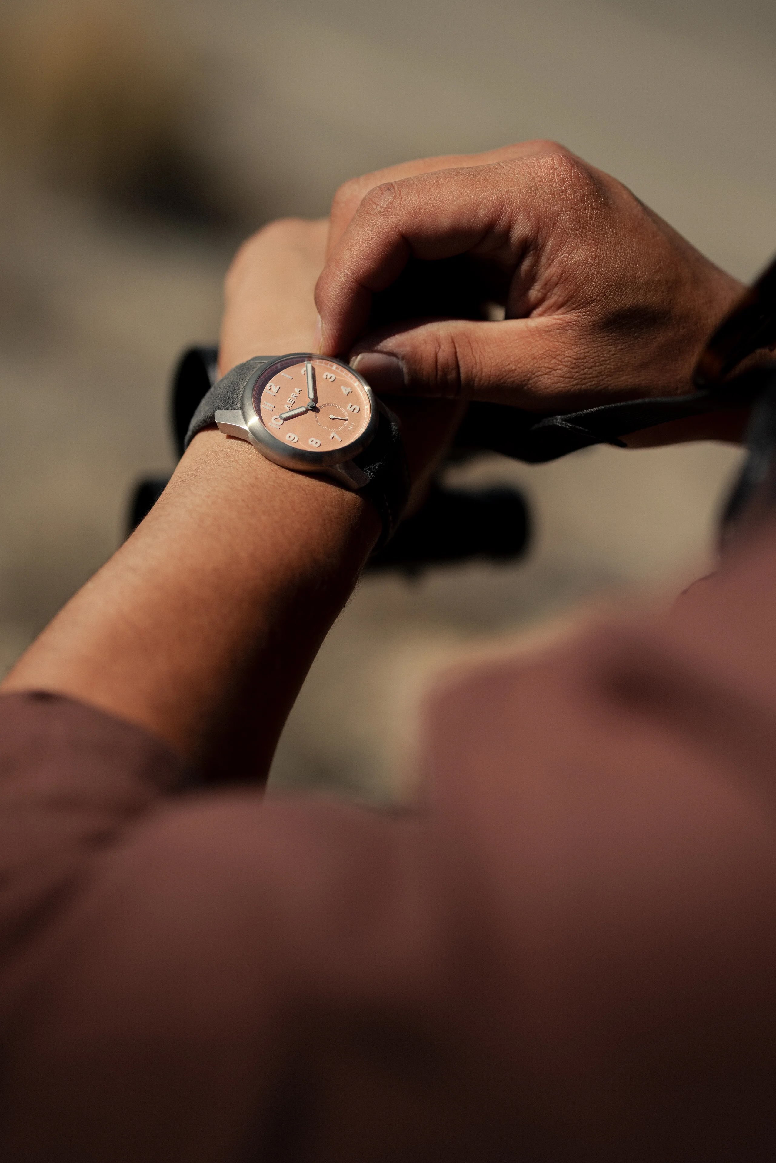 Nous avons également donné au modèle M-1 Field un nouveau look discret. Le cadran noir standard a été remplacé par une teinte rose poudré, le transformant en une montre de terrain adaptée au désert qui se fondrait parfaitement dans le sable. La M-1 Dune rend hommage aux Land Rover SAS de la fin des années 60, reprenant leurs tons uniques de coucher de soleil, et est produite en édition limitée à seulement 300 exemplaires. La couleur d'origine de la SAS n'était pas prête à l'emploi, les militaires devaient donc la créer eux-mêmes. Pour ce faire, ils mélangeaient un apprêt à l'oxyde rouge et de la peinture blanche mate avec une petite quantité de noir. Il n'y avait pas de proportion définie, les variations de rose d'un véhicule à l'autre étaient donc considérables. Pour la M-1 Dune, nous avons opté pour une teinte crépusculaire claire. Elle change subtilement en fonction du ciel et de la lumière. Sous un soleil éclatant, elle prend une teinte presque sableuse, tandis que dans une lumière plus chaude, au crépuscule et à l'aube, les tons roses ressortent. Nous aimons penser que c'est exactement ce que le SAS aurait voulu, servant de camouflage adaptable pour les habitants du désert. Cela donne une nouvelle profondeur au cadran bombé monobloc caractéristique de la M-1. La teinte rose pâle permet de voir facilement les bords incurvés du cadran, qui s'harmonisent parfaitement avec le verre saphir bombé qui le recouvre. La montre est ainsi facile à lire sous tous les angles, ce qui est renforcé par les grands chiffres, réalisés à la main en Super-LumiNova. Le logo Aera est quant à lui découpé dans du Globolight™ solide, qui brille d'un vert vif lorsque le soleil finit par se coucher. Le sous-cadran montre la trotteuse qui glisse, alimentée par le mouvement à remontage manuel Sellita SW216-1 Elabore et sa réserve de marche de 42 heures. La bague extérieure est une autre référence aux inspirations militaires de la M-1. Il s'agit d'une caractéristique des montres de terrain classiques uu milieu du siècle, ici subtilement placée autour du bord bombé du cadran, exagérant sa courbure.