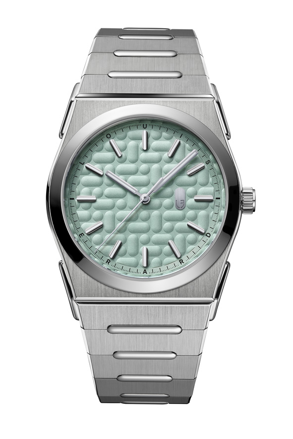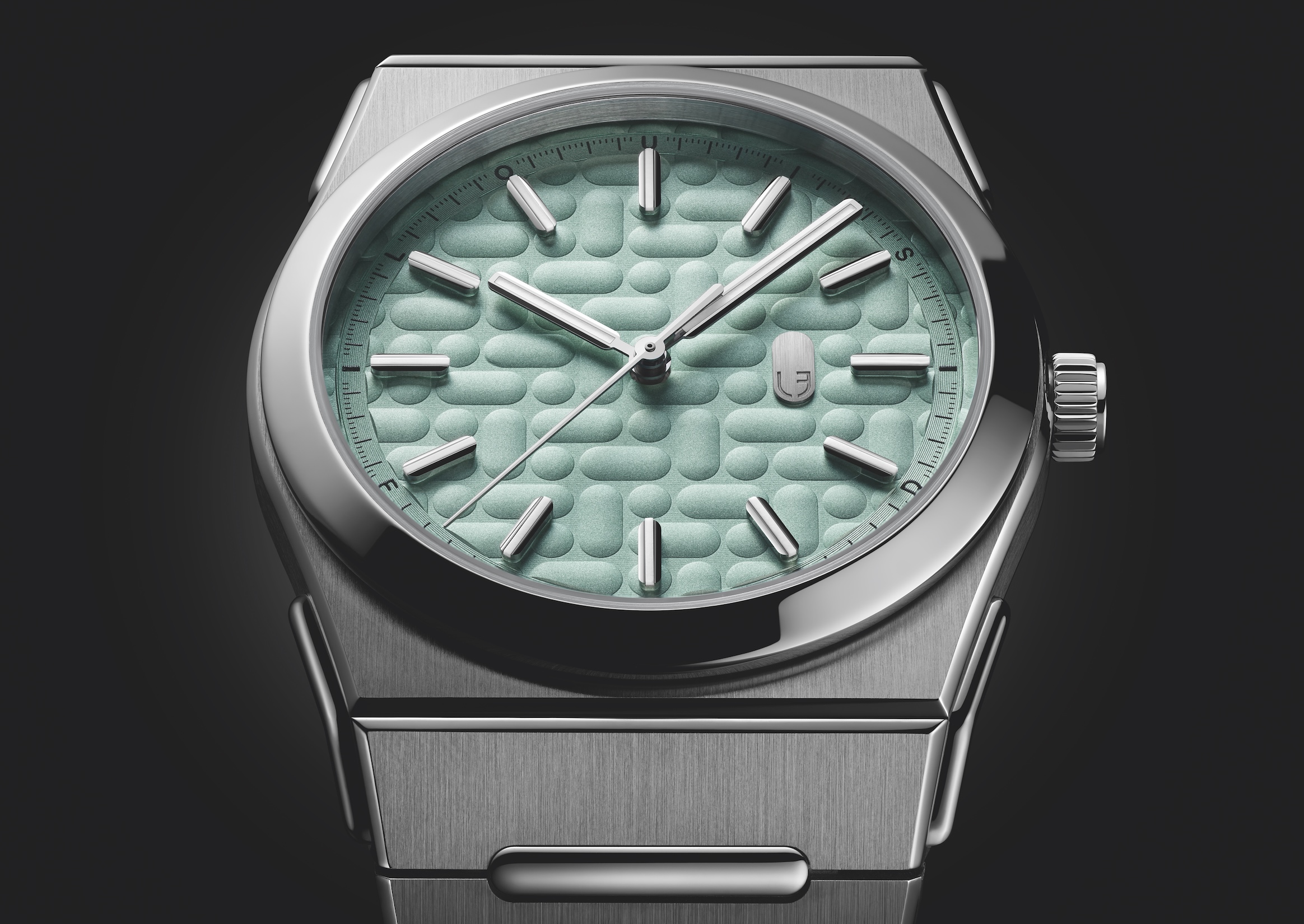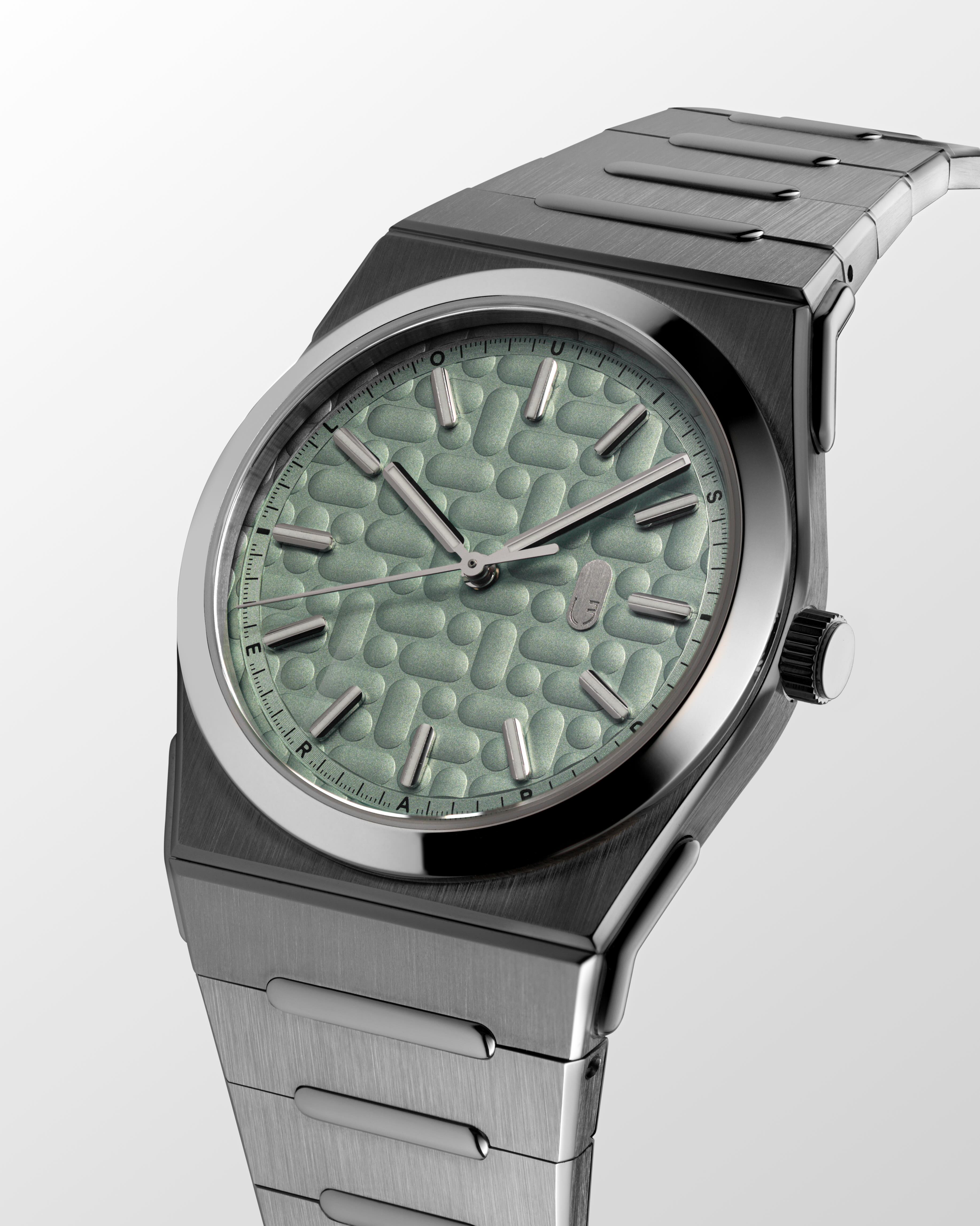 Cadran : chaque design est travaillé selon une technique de frappe spécifique. La version vert menthe affiche une base frappée oblong, Le motif composé de formes ovales répétées rappelle les contours stylistiques des pilules, un clin d’œil à la couleur de la montre et à son logo capsule à 6 heures. Les versions bleu acier et bleu profond présentent un frappé ligné. Le motif linéaire régulier fait écho aux lignes du bracelet intégré et crée une harmonie visuelle fluide. Tous les cadrans se distinguent par leurs index rehaussés comme flottants sur le cadran. Les aiguilles bâtons et les index sont anglés diamantés et satinés sur le dessus. Sur le pourtour, un chemin de fer satiné affiche les lettres du nom Louis Erard. La 2340 est animée par le calibre Sellita SW300-1, un mouvement suisse fiable, choisi pour sa finesse de 3,6 mm d’épaisseur. Nous y avons apporté notre propre touche : une masse oscillante décorée sur mesure et laquée noire, signée Louis Erard. Plus qu’une montre. Une étape clé dans notre histoire. Une réponse à la question : « Et après ? Au-delà des régulateurs et des collaborations ? » La 2340 marque notre entrée dans l’univers du sport-chic, à la manière Louis Erard. Oui, nous avons observé les meilleurs, étudié les références majeures… pour mieux tracer notre propre ligne. C’est notre modèle sport, guidé par la même obsession du détail qui nous anime depuis 1929 et plus que jamais depuis cinq ans.