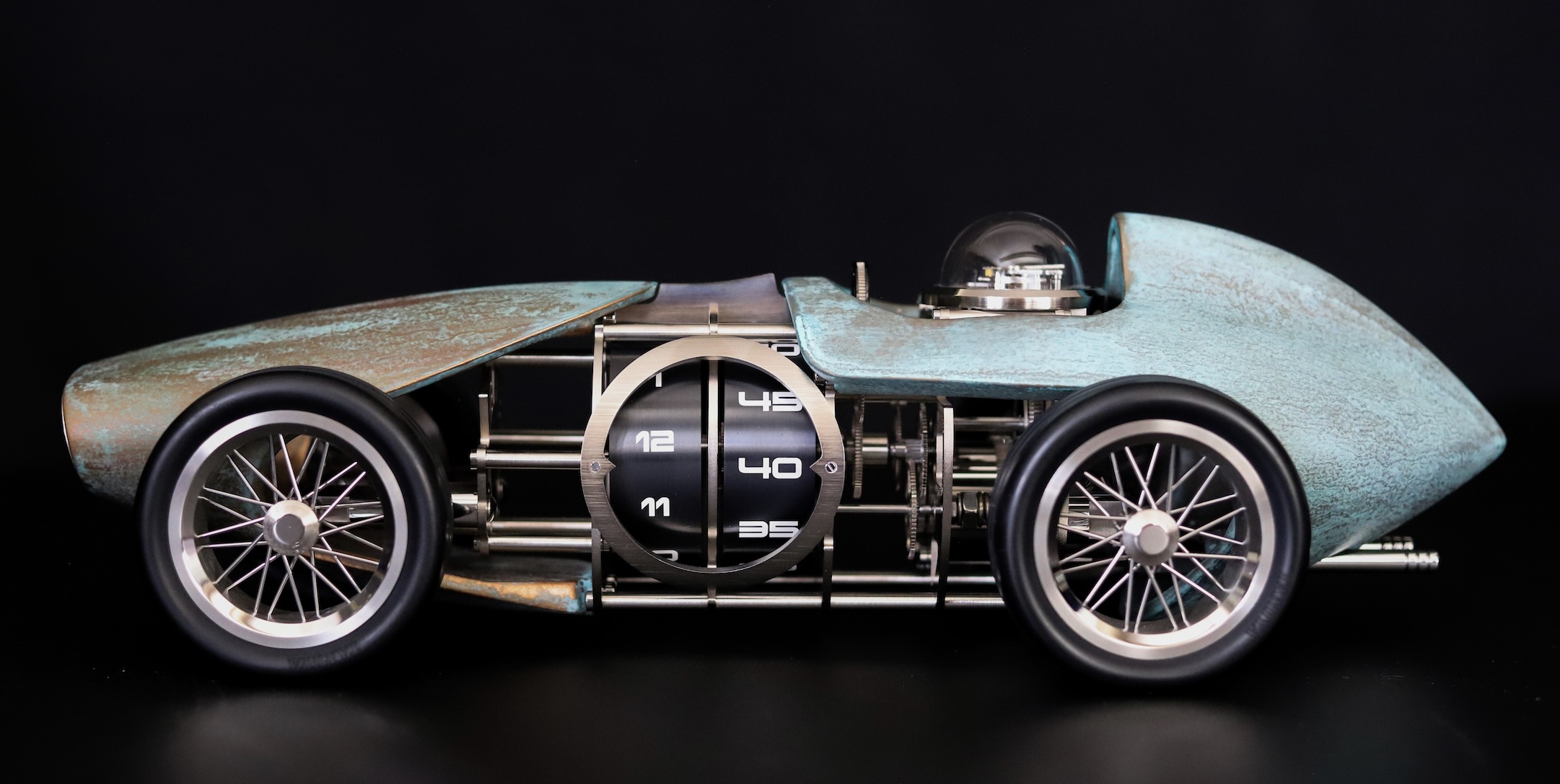 UN COMMENTAIRE ? Le rayon des « jouets de garçon » pour riches adulescents est le royaume de L’Épée 1839, dont aucune création ne laisse indifférent. Les passionnés de belles mécaniques du temps s’y délectent – entre autres merveilles – de belles automobiles horlogères, ici revues et corrigées par le créateur britannique Chris Alexander, qui a pris le nom de « The Dial Artist » pour fusionner son expression artistique et sa passion pour les montres. Ses horlo-bolides retracent le temps qui passe à toute vitesse : c’est conceptuel, mais intelligent ! Ces pièces sont uniquement, mais il faut compter dans les 40 000 euros à 50 000 euros (selon les modèles) pour des engins dont la longueur peut varier de 385 mm à 450 mm, pour afficher heures et minutes sur des disques rotatifs (réglage de l’heure via le volant : antihoraire pour régler, horaire pour repositionner ; remontage via les roues arrière : tirer la voiture vers l’arrière remonte les barillets ; levier de vitesse pour sélectionner le barillet à remonter, avance libre avant et arrière en mode neutre, clé sur le tableau de bord pour activer l’automate des pistons). Le mouvement mécanique possède huit jours de réserve de marche (laiton plaqué palladium, acier inoxydable, aluminium anodisé)…