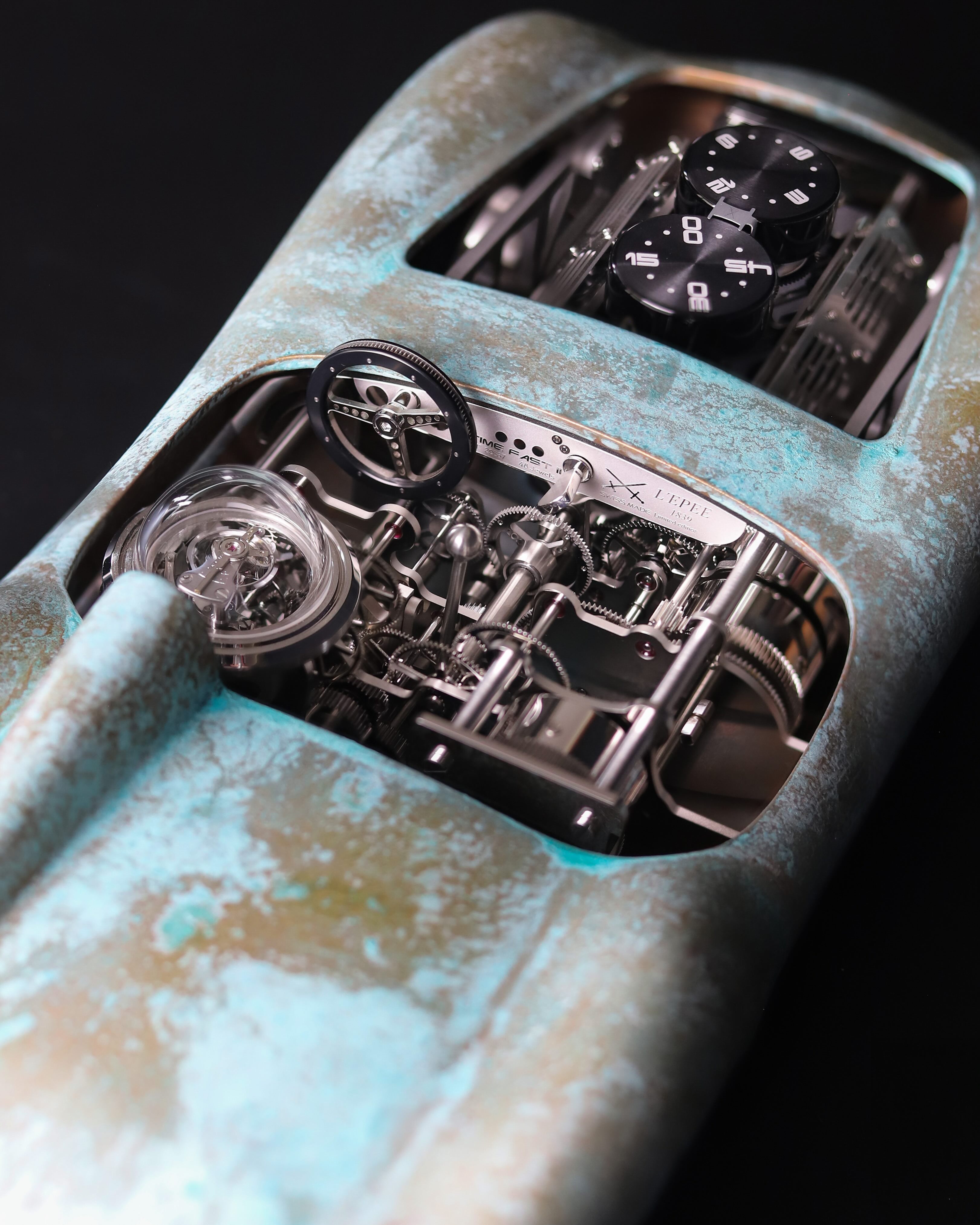 La série Time Fast « Marks of Time » regroupe des pièces uniques qui explorent les traces poétiques laissées par le temps — la manière dont il façonne les matériaux, nourrit les souvenirs et révèle de nouvelles couches de sens. Inspirée par le caractère des automobiles « barn find » patinées par les années, chaque création offre un aperçu singulier de fragments d’histoires automobiles oubliées. Chaque pièce marie le design distinctif et le mouvement manufacture de la Time Fast de L’Epée 1839 avec l’expressivité artistique de The Dial Artist. Grâce à un procédé naturel d’oxydation du cuivre, chaque élément de la carrosserie reçoit plusieurs couches de peinture à base de cuivre, puis est oxydé à la main pour former des motifs et nuances uniques. Cette technique méticuleuse garantit que chaque finition est véritablement exclusive. Là où chaque marque raconte une histoire d’endurance et d’émotion, la série Time Fast « Marks of Time » célèbre l’équilibre délicat entre mécanique de précision et transformation artistique — un hommage à l’individualité, à la créativité et à la beauté du temps qui passe. L’inspiration est née durant des vacances — ces moments privilégiés où l’esprit se libère et peut réimaginer. Lors d’un échange téléphonique spontané mais chargé de créativité avec l’équipe de L’Epée 1839, l’idée a pris forme, nourrie de souvenirs communs de modélisme et de peinture miniature. Grâce à son expérience dans la modélisation de voitures miniatures haut de gamme, Chris avait développé au fil des ans une maîtrise unique de techniques et de procédés. Alors que la conversation glissait vers la beauté des marques laissées par le temps sur les objets, le concept s’est imposé naturellement, avec une vision claire : réinterpréter la série Time Fast à travers la poésie visuelle d’une machine façonnée par la performance, le temps et l’endurance.