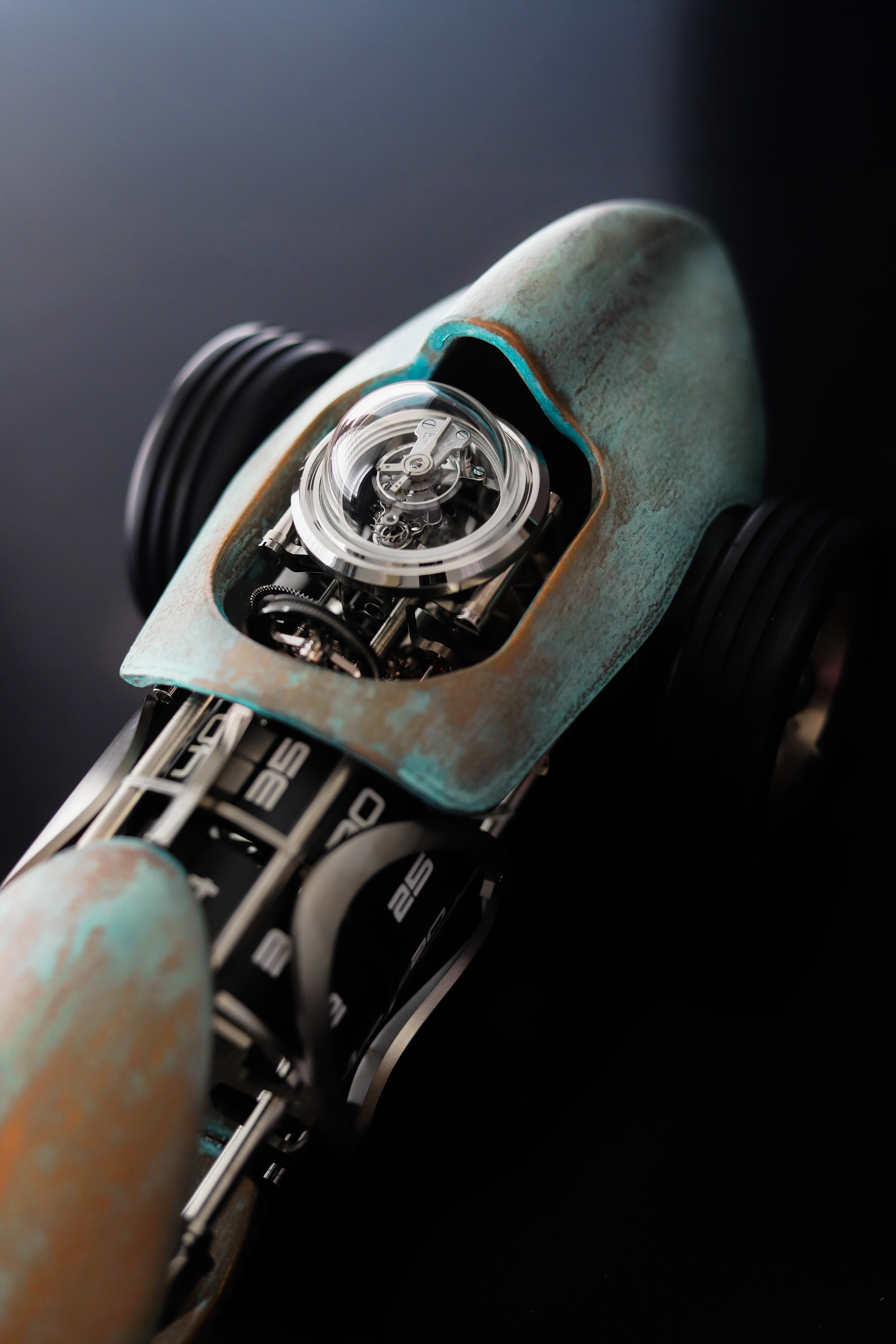 Inspirée de l’âge d’or du sport automobile, la collection Time Fast réinvente les légendaires voitures de course des années 1930 à 1960 en véritables sculptures cinétiques, mêlant design authentique et savoir-faire horloger. Construit sur un châssis en aluminium en forme de H (comme les voitures de l’époque), chaque modèle intègre un mouvement manufacture conçu pour suivre les lignes aérodynamiques de la carrosserie. Les détails authentiques : volant à trois branches pour le réglage de l’heure ; roues à rayons en acier inoxydable ; échappement visible sous le casque du pilote ; pneus en caoutchouc souple avec insert en mousse pour reproduire la sensation des vraies voitures. Les Time Fast prennent vie lorsque les roues arrière sont tirées vers l’arrière, rappelant avec émotion les voitures à rétrofriction de notre enfance. La Time Fast D8, premier modèle de la collection, est rapidement devenue un best-seller et une véritable icône de la marque. Admirée pour ses lignes épurées et intemporelles, elle incarne l’esprit de la course vintage dans une forme sculpturale pure — avec l’heure affichée comme un numéro de course. S’appuyant sur ce succès, Time Fast II pousse encore plus loin le concept avec une dimension technique plus riche et une mécanique ludique. Dotée de deux mouvements indépendants — un pour l’affichage du temps, un autre pour l’animation d’un moteur miniature V8 — elle offre une expérience encore plus immersive. Un levier de vitesse fonctionnel permet de sélectionner les modes, tandis qu’une clé sur le tableau de bord met en mouvement les pistons dans une fascinante chorégraphie mécanique.