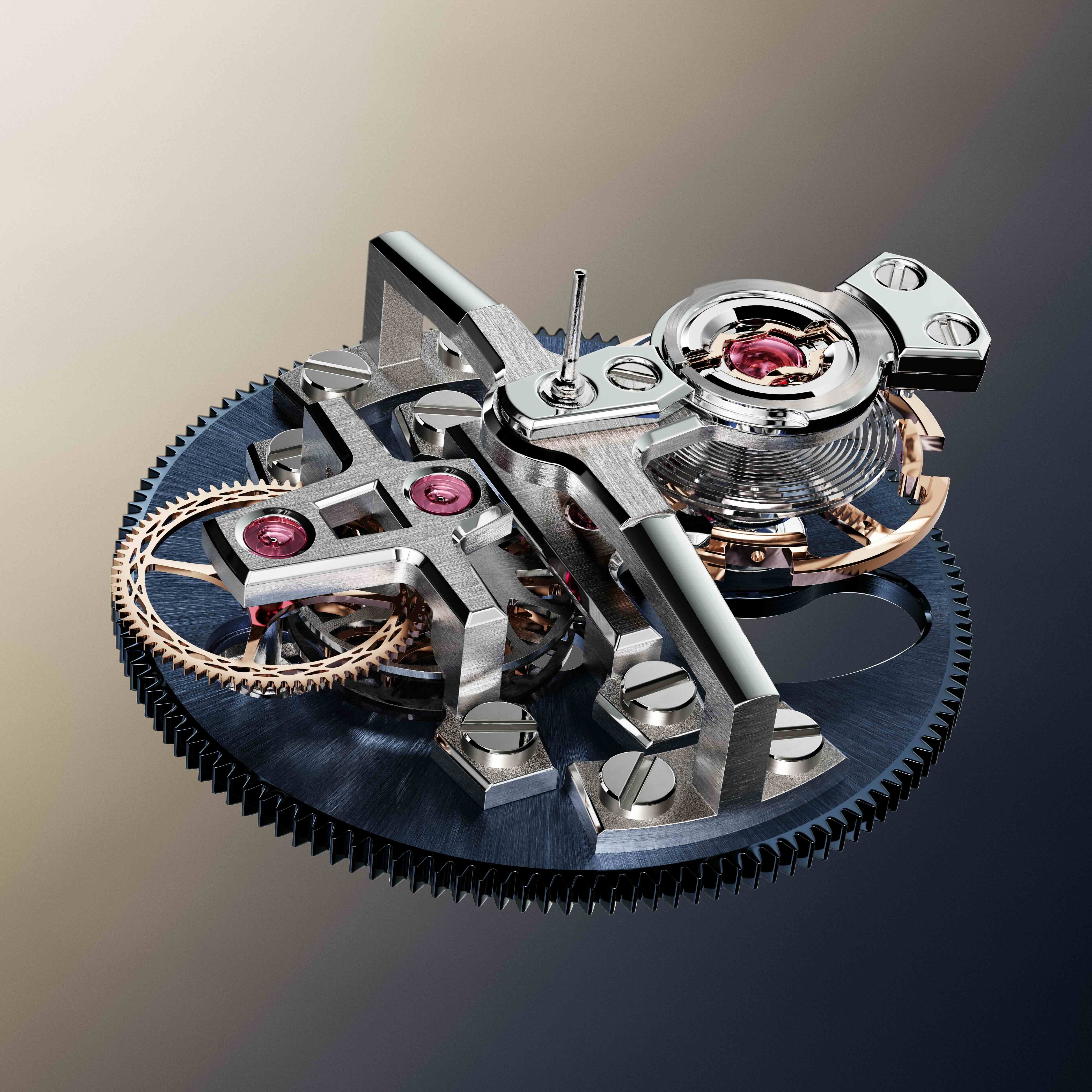 Depuis le début des années 2010, la manufacture n’a donc cesséde perfectionner sa maîtrise du champ magnétique. Il est au jourd’hui étendu à l’usage de l’échappement, mais son principe fondateur reste le même : créer un champ et des interactions magnétiques maitrisés. Il s’agit ici de deux roues d’échappement dotées chacune d’une piste magnétique, au centre desquelles bat une ancre avec palettes magnétiques également. L’idée est de s’inspirer des échappements à force constante. Au-dessous d’un certain couple de fonctionnement, le tourbillon s’arrête très rapidement. Au-dessus de ce seuil, le balancier oscille à son amplitude maximale. Ce nouvel échappement permet également de découpler les impulsions transmises au balancier, la rotation de la roue d’échappement et donc du reste du rouage. L’inertie de la cage de tourbillon n’a, contrairement à un mouvement à ancre suisse, presque plus aucune influence. C’est en découplant ces deux fonctions que Breguet a su réaliser un tourbillon doté d’un oscillateur à 10 Hz dans de telles dimensions, laissant également libre cours aux choix de design en plaçant par exemple son balancier déporté du centre de rotation de la cage. Grâce à cette fréquence élevée, la rotation de l’ensemble du tourbillon se fait avec une telle fluidité que les pas sont imperceptibles pour l’œil. Comparé à la plupart des tourbillons traditionnels cadencés à 2,5 Hz, c’est donc un saut d’un facteur 4. Cette fréquence, 10 Hz, est même très largement supérieure à la plupart des échappements à ancre suisse classiques, sans tourbillon, dont la quasi-totalité bat à 3 ou 4 Hz. Le tourbillon à échappement magnétique 10 Hz est ainsi plus stable et plus précis que la plupart des montres-bracelets contemporaines. La montre-bracelet Expérimentale 1 est d’ailleurs certifiée du poinçon Breguet, catégorie « Scientifique », soit avec une précision de marche garantie sur 24 heures de +/- 1 seconde. La construction du mobile d’échappement est également atypique. Entre ses deux roues d’échappement équipées d’une piste magnétique, une roue d’arrêtage intermédiaire assure en outre que le dispositif ne subisse aucun saut non désiré. Les autres composants du tourbillon sont, pour la plupart, amagnétiques, afin d’éviter toute interaction pouvant perturber le bon fonctionnement de celui-ci. Ainsi, le spiral est en silicium ; la roue de seconde fixe, en LIGA (NiP12) ; les autres composants, en titane (grade 2, grade 5) ou nivagauss.