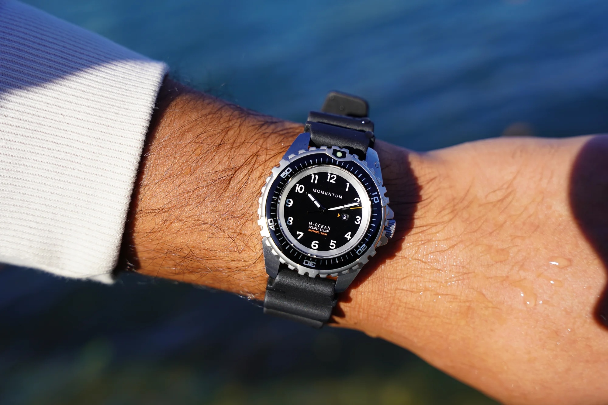 Conçu pour les poignets plus petits sans compromettre les performances, le M-Ocean Eclipse Solar intègre toutes les capacités de montre de plongée dans un boîtier élégant de 38 mm. Alimenté entièrement par la lumière, il n'a jamais besoin d'une batterie. Le verre saphir pratiquement anti-rayures et le cadran Super-LumiNova le rendent facile à lire dans n'importe quelle lumière, tandis que la lunette unidirectionnelle précise et la couronne vissée offrent une étanchéité fiable à l'eau de 200 m (660 pied)s. Assez résistant pour les plongées en eau libre, assez raffiné pour un usage quotidien. Soutenu par la garantie solaire simple de 6 ans de Momentum, l'Eclipse Solar est disponible avec un élégant bracelet en acier, un bracelet en caoutchouc classique ou un bracelet en caoutchouc Goma lisse de fabrication italienne pour un look élégant.