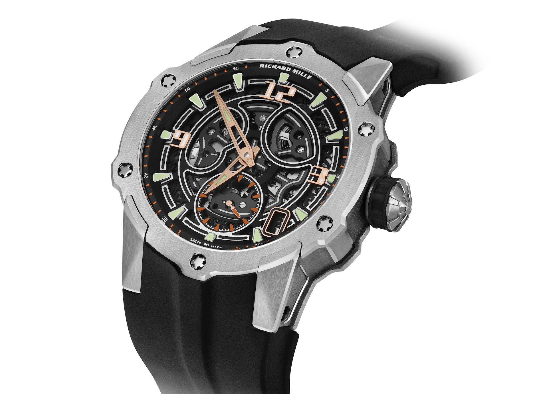 Autour du calibre prend place un disque de date en titane traité PVD noir. Semi-instantanée, la date apparaît au-dessus du guichet de couleur blanche situé à 5 heures. Fait rare chez Richard Mille, l’affichage de la petite seconde prend place à 6 heures – une complication traditionnelle qui, au-delà de son aspect esthétique, anime subtilement le cadran par son mouvement délicat. Cette mécanique s’anime grâce à un balancier à inertie variable oscillant à une fréquence de 3 Hz. Quatre petites masses disposées autour du balancier permettent l’ajustage très précis de la fréquence d’oscillation sans modifier la longueur du spiral. Cet organe régulateur contrôle avec précision l’énergie délivrée par le barillet à rotation rapide, assurant une réserve de marche de plus de 40 heures. Bien sûr, chaque montre Richard Mille conserve les techniques traditionnelles de Haute Horlogerie telles que le sablage, le microbillage, le satinage ou encore l’anglage, toutes réalisées à la main par des artisans. « L’idée est de mettre en valeur les volumes du calibre, précise Cécile Guenat. Par ailleurs, les pleins et les vides créés par l’importante squelettisation du mouvement participent à un jeu d’ombre et de lumière. » Soulignant l’architecture tridimensionnelle du calibre, les chiffres en or rouge 5N 18 carats montés sur des rails en titane positionnés entre le rehaut et le mouvement donnent l’illusion de flotter au-dessus du calibre. Véritable prouesse technique par sa finesse, ce cadran, à l’image des ponts, allie technicité et fonctionnalité. Déployé sur l’ensemble du calibre, il guide naturellement le regard vers le compteur de petite seconde.