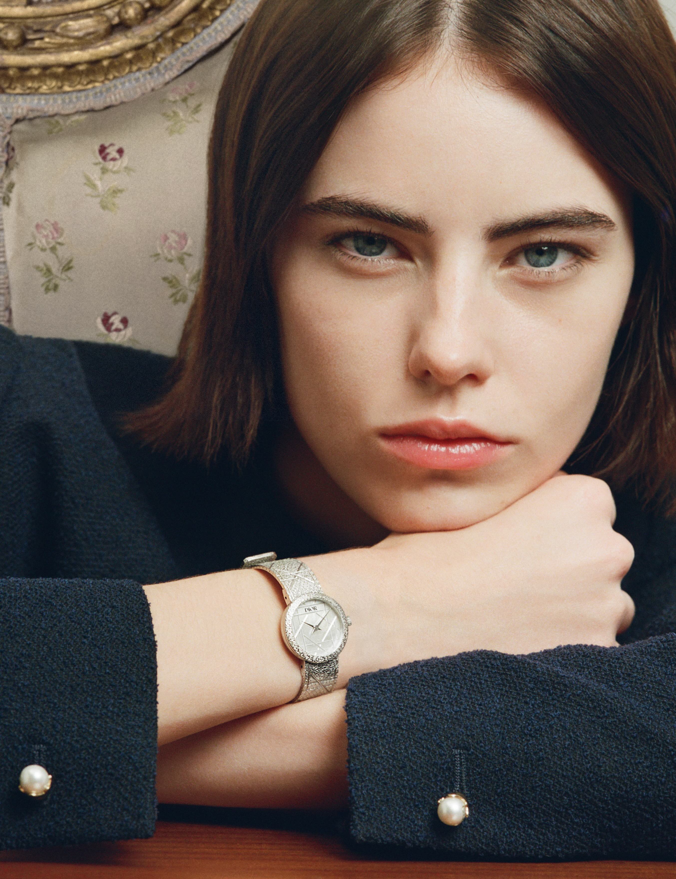 Reconnaissable au premier coup d'œil grâce à ses courbes raffinées et ses deux aiguilles épurées, La D de Dior, lancée en 2003, est devenue une icône. Première montre-bijou imaginée par Victoire de Castellane, directrice artistique de Dior Joaillerie, elle célèbre la féminité plurielle et la liberté de jouer avec les matières, les couleurs et les proportions. Cette saison, le design s'amuse avec les codes, adoptant des variations résolument modernes. Le Cannage, signature historique et intemporelle de Dior, devient un motif graphique, presque hypnotique. En or ou en acier, ponctuées de diamants, ces pièces exceptionnelles allient virtuosité et élégance. À la fois talisman secret et objet de collection, elles arborent un cadran en nacre irisée qui donne vie à l'abstraction géométrique du motif emblématique. Hommage à la réinvention, ce garde-temps se décline également dans une version arc-en-ciel aux reflets changeants, telle un ruban en mouvement capturant la lumière (édition limitée de 30 montres). Associé à un bracelet en satin rose, il scintille de pierres précieuses : saphirs, améthystes, tsavorites, tourmalines et émeraudes. Icône extraordinaire, il affirme plus que jamais l'excellence et l'audace de la Maison.