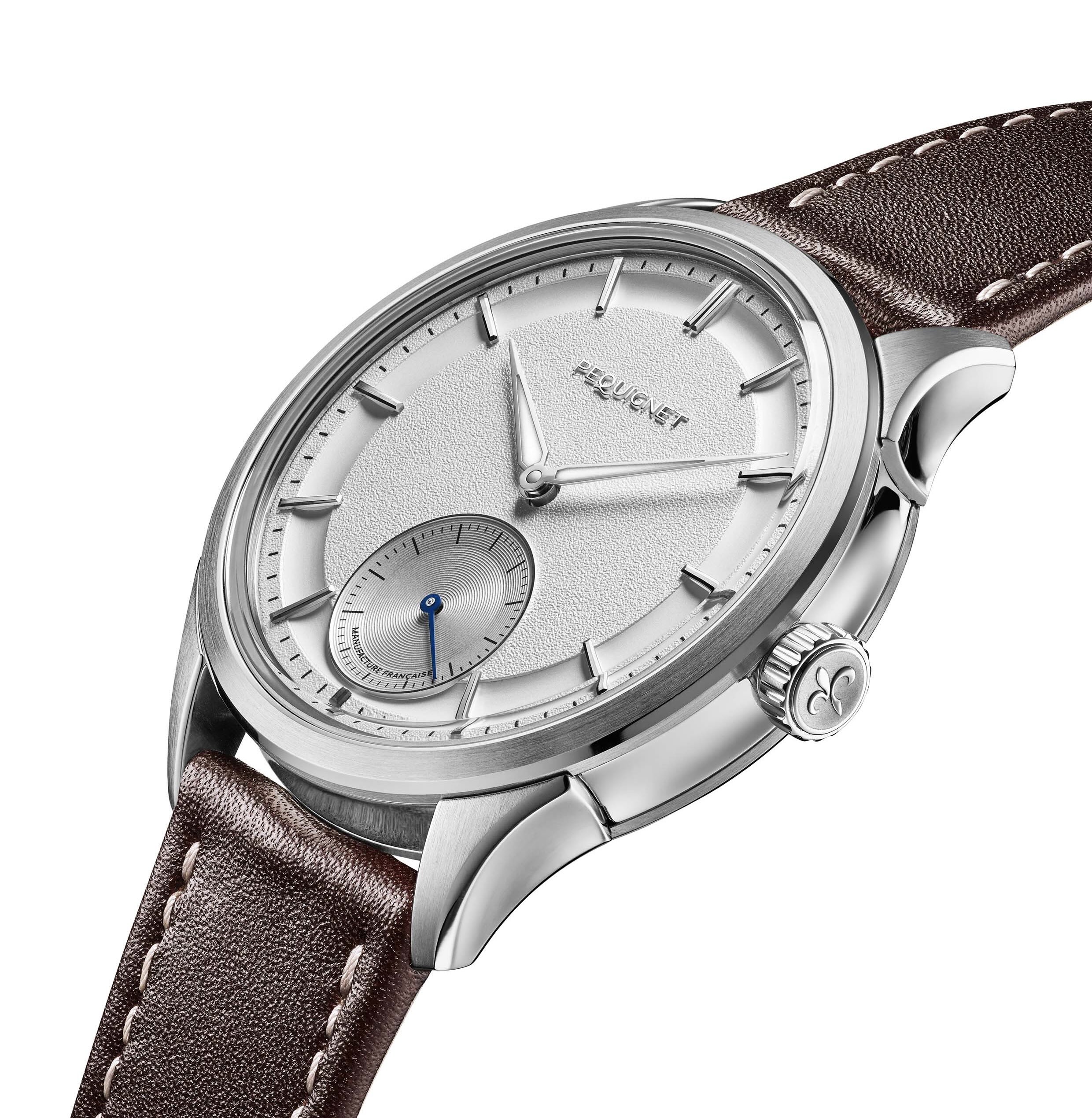 UN COMMENTAIRE ? Une bien jolie montre, très française d’esprit par la mesure de son architecture néo-classique, très hivernale avec son style givré et très raisonnable compte tenu d’un prix annoncé à partir de 3 900 euros (boîtier en acier de 39,5 mm x 11,5 mm d’épaisseur, étanche à 50 m et animé par un mouvement « manufacture » à remontage manuel pour 100 heures de réserve de marche). On pourra admirer la qualité de réalisation du cadran argenté/gréné, bien équilibré dans sa géométrie et cerné par une élégante creusure que rythment les index biseautés…