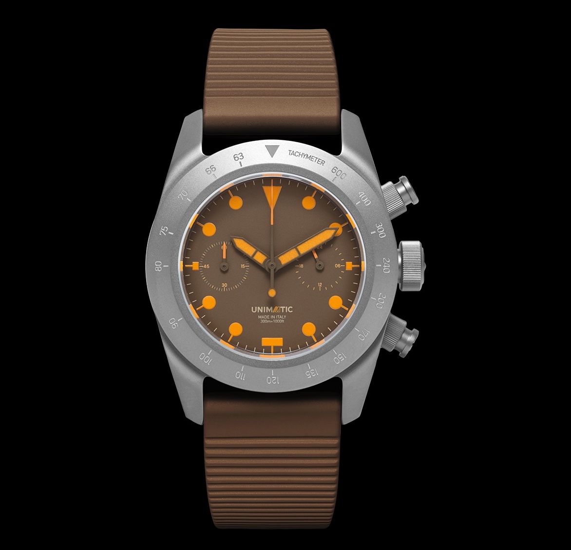 UN COMMENTAIRE ? Peu importe que cette montre soit dédiée à l’atelier automobile italien Automobili Amos, qui voulait une édition limitée pour sa participation au rallye d’endurance East African Classic Safari : ce qui est important, c’est qu’elle soit plus Unimatic et italienne que jamais dans son identité ! Et ce chronographe l’est dans son boîtier en acier satiné/sablé de 40 mm x 12,9 mm d’épaisseur sans le dôme, étanche à 300 m, avec sa lunette tachymétrique fixe, son cadran Safari Dust deux compteurs aux accents orangés [un intéressant « style safari »] sous un épais verre en dôme et son mouvement mécaquartz VK64 – la référence du genre, avec une précision de l’ordre de vingt secondes par mois pendant au moins trois ans ! Au poignet, l’allure de cette Modello Tre Fixed Bezel Rally (U3FB-AAS) est à la fois très classique, mais on devine très vite qu’il y a quelque chose de plus dans cette montre : question de couleur, question de sobriété, question de grande classe horlogère. La preuve de cette originalité : l’aiguille « sucette Lolipop » des secondes est inversée – pointe en avant ! Avec ce parti-pris orangé, qui est exactement la couleur du soleil qui se couche sur la savane, une montre qu’on a tout de suite très envie de tester dans la poussière des pistes africaines : Heia Safari !