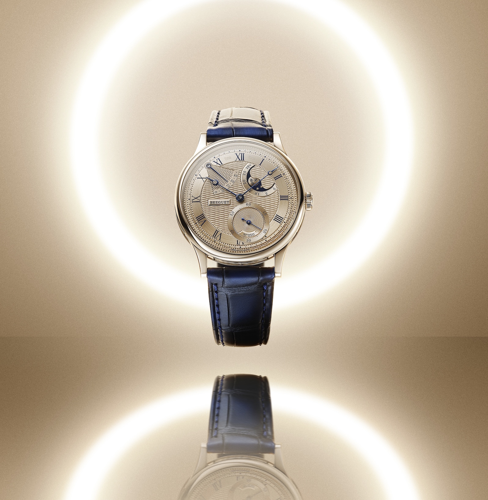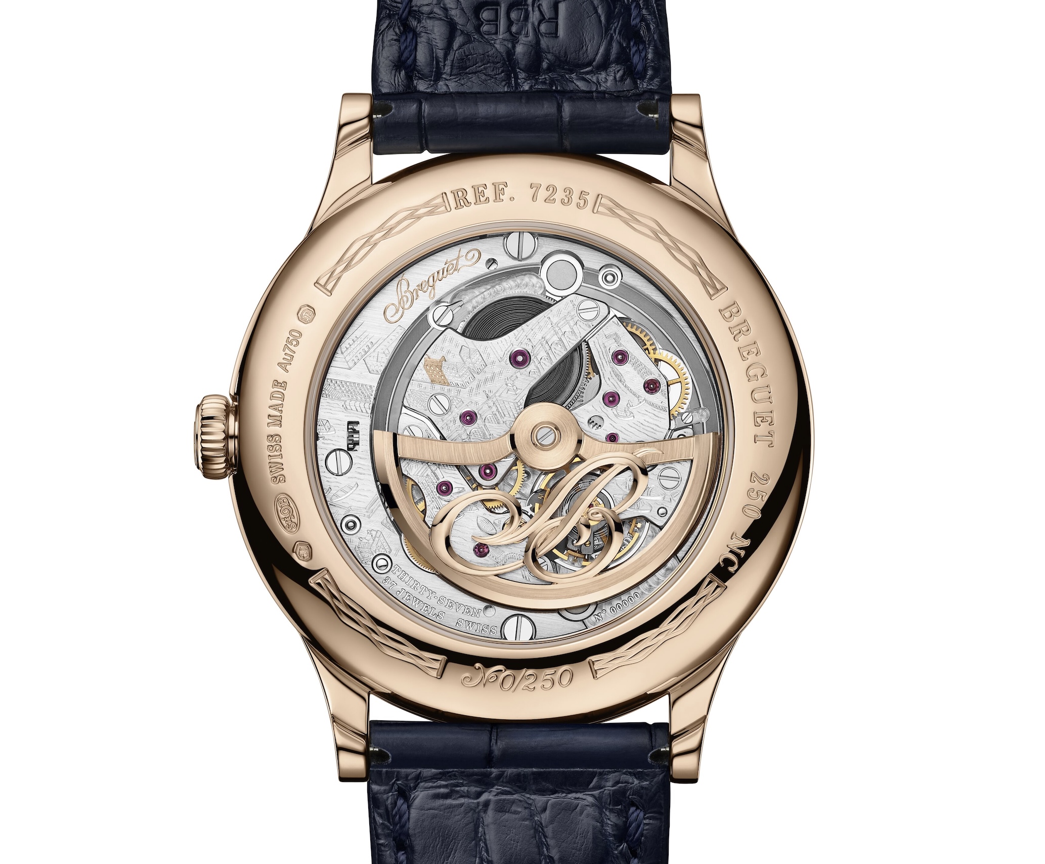 C’est ce style que la montre N°5, livrée le 14 mars 1794, saisit sur l’instant. Une pièce d’exception, vendue en son temps à François Jourgnac Saint-Méard, homme de lettres redouté pour la finesse de sa plume et contemporain de Breguet. La Classique 7235 puise son inspiration dans la montre N°5, actuellement au Musée Breguet, place Vendôme à Paris. Il ne s’agit pas d’une reproduction stricto sensu, puisque la N°5 était une montre de poche. Il a donc fallu en adapter les proportions et, surtout, lui créer un mouvement dédié. C’est une création limitée à 250 exemplaires. Côté cadran, la pièce reprend les complications de la montre N°5, ainsi que leur disposition générale : deux aiguilles centrales, réserve de marche à 10h30, phase de Lune à 2h, et petite seconde à 5h. Ses complications se distribuaient avec grâce sur des cadrans sans cesse réinventés - tous uniques, mais unis par ce sens inné de l’équilibre et de la justesse. La petite seconde placée entre V et VI heures est un clin d’oeil à de nombreuses montresanciennes de la maison sur lesquelles la petite seconde était rarement placée à VI heures. Sobriété et clarté n’excluait pas fantaisie ! Côté mouvement, Breguet a créé en 2025 un nouveau calibre pour animer la Classique 7235. Il s’agit du 502.3.DRL, avec spiral en silicium. Avant même ces complications, notons qu’il est automatique. La mention peut sembler anodine. Elle ne l’est pas : la montre N°5 de 1794 l’était également. C’était, pour l’époque, une révolution technique. A.-L. Breguet est véritablement le père de la montre dite « perpétuelle », aïeule de la montre automatique contemporaine. En 1790, le grand horloger mentionne en effet « y travailler depuis 25 ans », ce qui laisse entendre qu’il l’imaginait déjà vers 1775. Le musée Breguet est d’ailleurs à l’heure actuelle détenteur de la « montre perpétuelle » la plus ancienne connue de nos jours, la Breguet 1/8/82, terminée en août 1782 – la seule à pouvoir attester formellement de l’antériorité de Breguet à l’exercice. La Classique 7235 lui rend aujourd’hui l’hommage qui lui est dû. Le calibre 502.3.DRL est remarquable par sa finesse. Malgré ses trois complications additionnelles aux heures et minutes, ilreste sous la barre des 4 mm d’épaisseur, à 3,95 mm (pour 32,4 mm de diamètre). Cette finesse est notamment possible par une masse oscillante décentrée. Elle ouvre l’espace à une distribution optimisée des organes de la montre contribuant, au final, à un boîtier qui reste lui-même sous la barre des 10 mm, à précisément 9,9 mm.