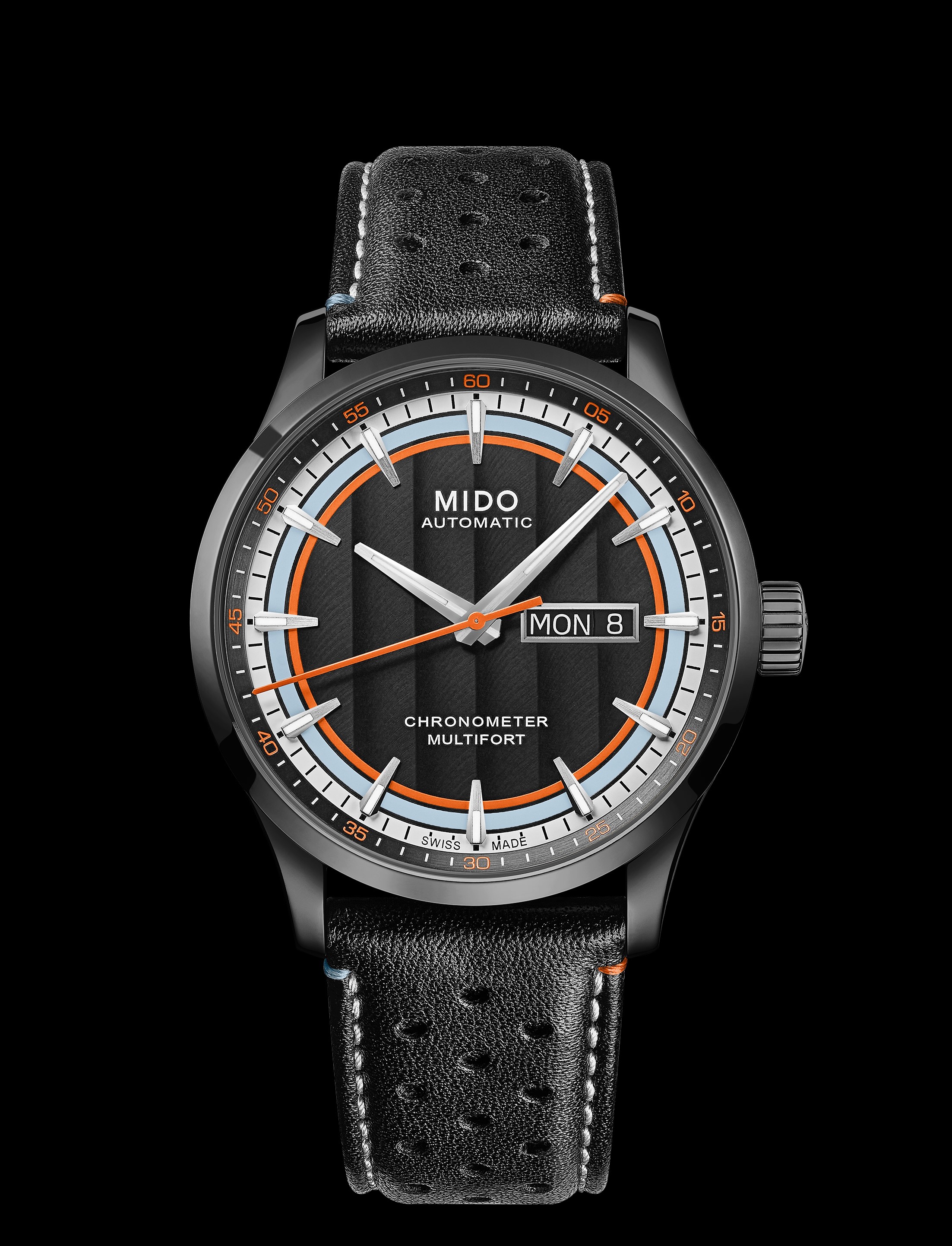 La Multifort Chronometer Racer affiche d’emblée son tempérament : son cadran noir, décoré de caractéristiques Côtes de Genève verticales, est entouré d’orange, de bleu ciel et de blanc. Une lunette polie, traitée PVD noir, fait ressortir ces teintes. Le rehaut affiche une minuterie contrastée en blanc, avec des chiffres orange aux intervalles de cinq minutes. Les index facettés et les aiguilles diamantées, garnis de Super-LumiNova®, assurent une lecture optimale – tout comme le verre saphir bombé avec traitement antireflets sur les deux faces. L’aiguille des secondes, orange, rappelle l’esprit de précision ultime de ce chronomètre redoutable. Enfin, dans un guichet à 3 heures apparaissent le jour et la date, en blanc sur fond noir. Chaque détail de la Multifort Chronometer Racer évoque l’univers des circuits. La solidité de son boîtier en acier inoxydable satiné est prolongée par deux bracelets facilement interchangeables en cuir, pour personnaliser la montre au rythme du pilote. Sont livrés avec chaque montre un bracelet bleu clair avec lignes orange et surpiqûres ton sur ton et un bracelet en cuir noir perforé souligné de coutures orange et bleues. La Multifort Chronometer Racer puise sa force dans son excellent mouvement automatique : le Calibre 80 Si. Son spiral en silicium, matériau amagnétique et résistant aux chocs, assure une précision exceptionnelle, certifiée par le Contrôle Officiel Suisse des Chronomètres (COSC). Cette mécanique suisse délivre jusqu’à 80 heures de réserve de marche, pour une fiabilité hors normes. Finement décoré, avec ses vis bleuies et sa masse oscillante ornée de Côtes de Genève gravées du logo Mido, ce calibre s’admire à travers le fond transparent. Étanche jusqu’à une pression de 10 bars (100 m / 330 ft), elle allie performance mécanique et robustesse pour accompagner les esprits aventuriers. Avec son emblématique allure de sportive et sa précision certifiée, la Multifort Chronometer Racer incarne la montre des pilotes du quotidien – un chronomètre pour ceux qui aiment prendre de l’avance !