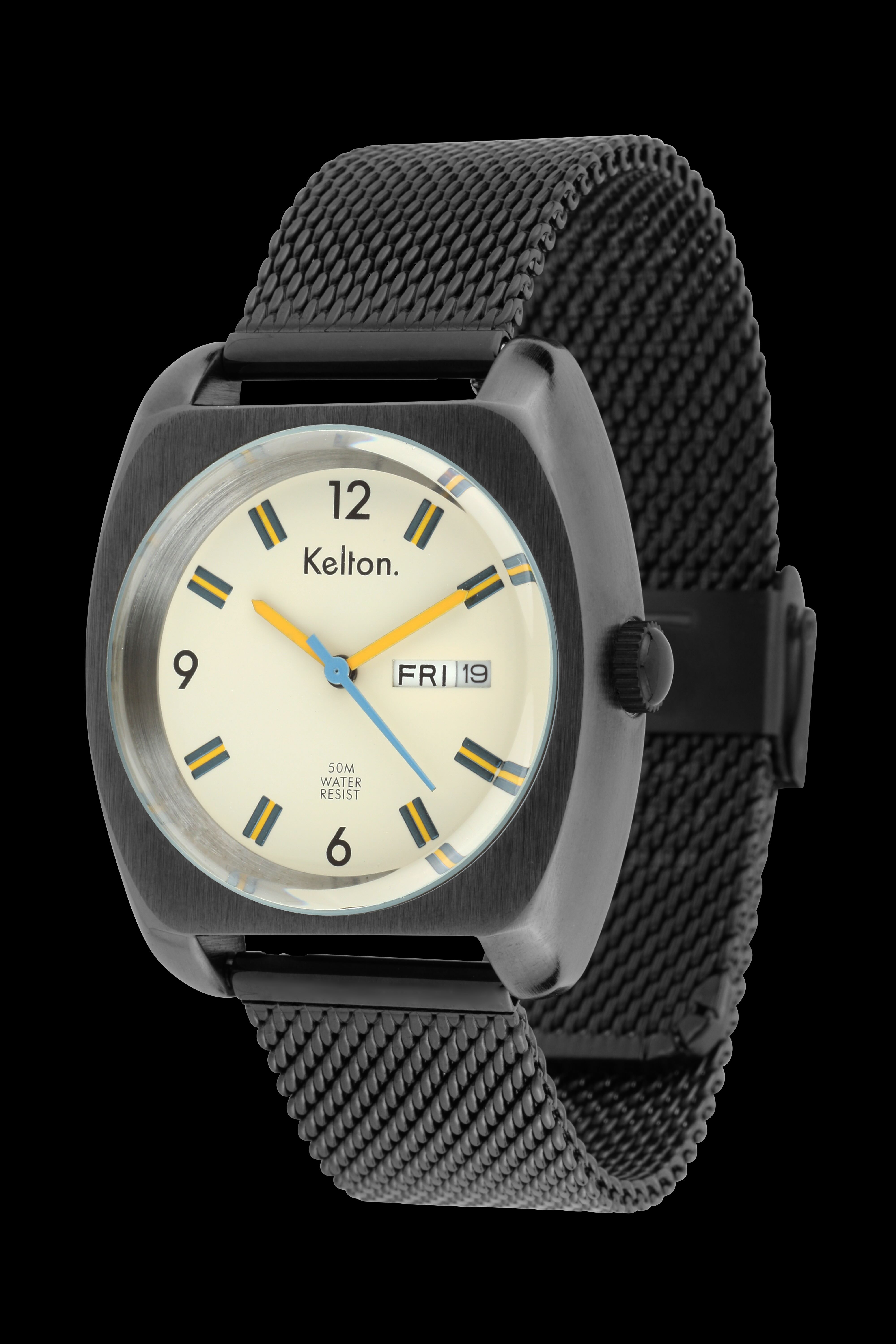 UN COMMENTAIRE ? On ne voit pa trop en quoi un bracelet en maille, même en « acier inox » [il ne manquerait plus qu’il ne soit pas inoxydable !], apporte à une montre « un peu plus de légitimité dans l’univers du racing », mais on ne va pas faire d’histoires pour une montre sympathique qui ,n’est jamais facturée que 145 euros (boîtier en acier de 38 mm x 11 mm, étanche à 50 m et motorisé par un mouvement électronique Miyota qui affiche et le jour et la date !). Pour ce qui est du retour de Kelton sur le marché, une citation : « Des années après sa disparition, le pilier de la culture pop entend prolonger son règne » – bizarre, cette histoire de pilier qui avait disparu et qui revient(d’où ?) pour raffermir sa couronne…