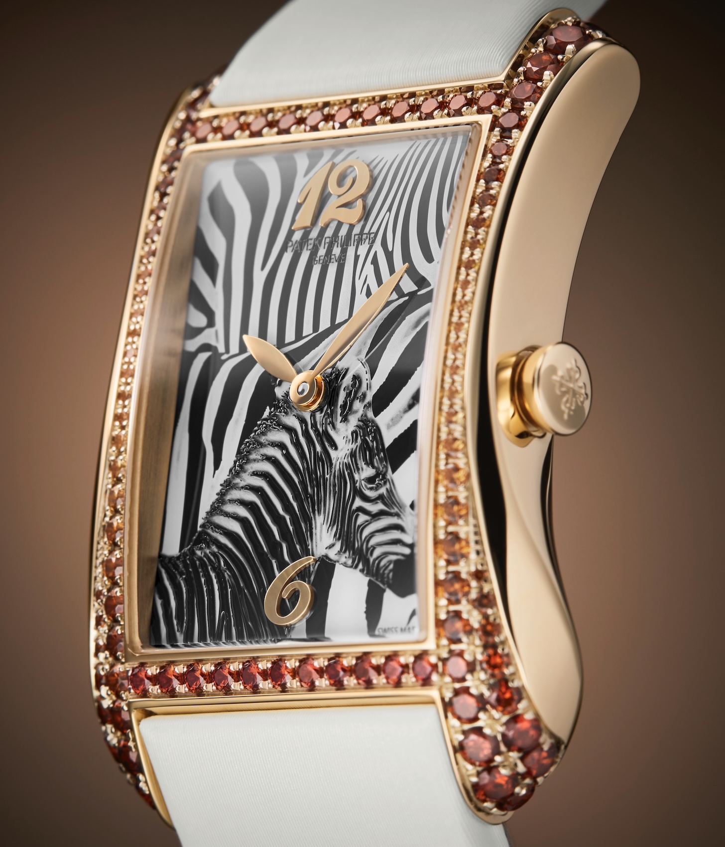 Un nouveau modèle avec sertissage de spessartites et cadran original en verre saphir orné d’un décor « Zèbres » : lancée en 2006, la Gondolo Serata se démarque par ses courbes originales, inspirées de l’Art déco. Avec son design très typé, elle offre une réinterprétation contemporaine de la montre de soirée qui saura souligner une allure chic en journée. Elle a pris son envol dans des versions en or gris serties de diamants, avec cadrans en nacre guillochée, dont la production s’est arrêtée en 2021 (références 4972G-001 et 4972/1G-001). En 2023, cette montre-bijou au style inédit et à l’élégance intemporelle a fait son retour au sein de la collection courante Patek Philippe dans une version en or rose légèrement agrandie, avec boîtier serti de spessartites et cadran laqué brun orné d’un décor floral (référence 4962/200R-001). Patek Philippe réinterprète ce modèle avec un cadran au décor original de zèbres – un motif inspiré de la montre-bracelet Golden Ellipse référence 5738/50G-023 en émail cloisonné, l’un des fleurons de la collection Haut Artisanat 2022.