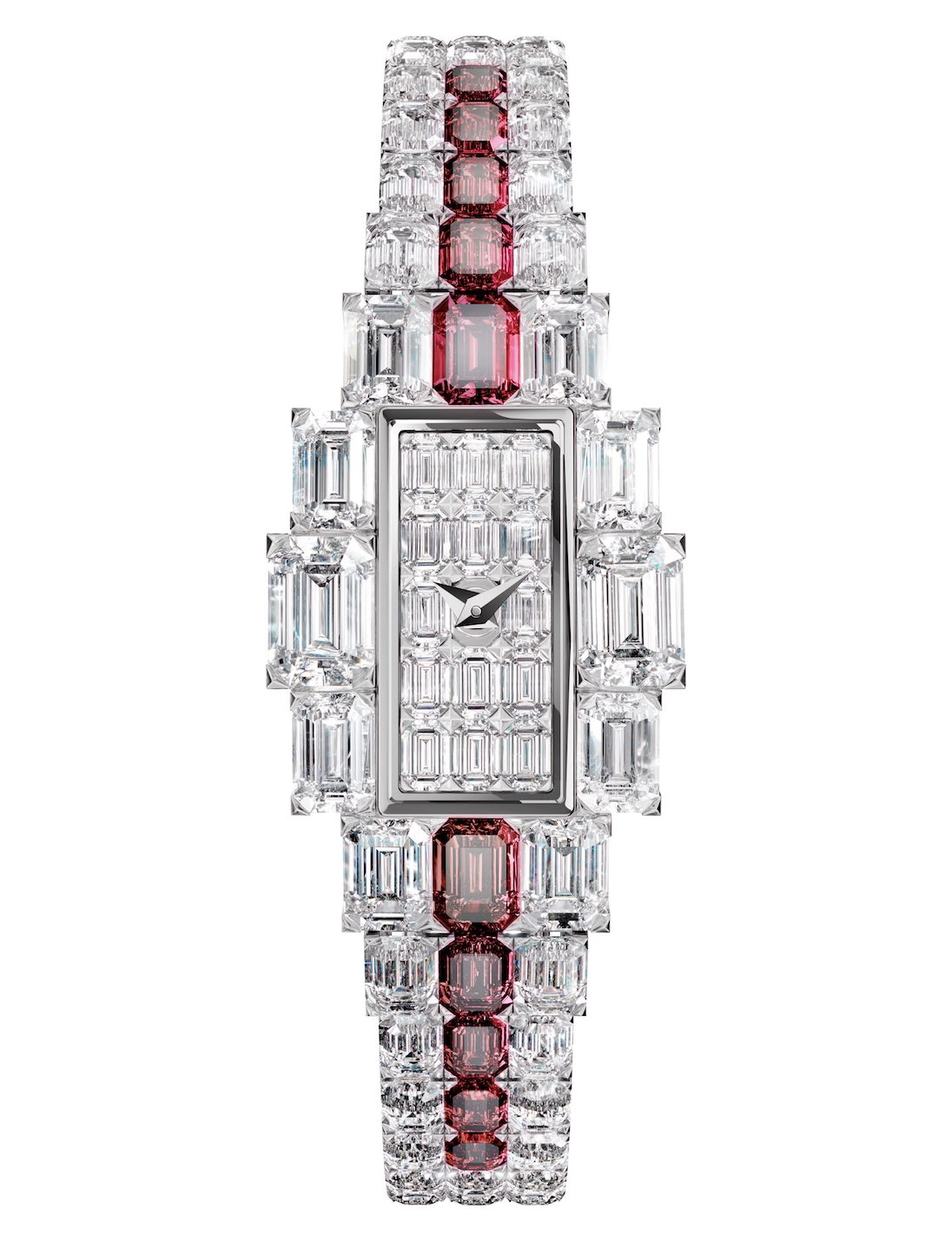 UN COMMENTAIRE ? Avec une telle profusion de diamants et de pierres précieuses, face à une telle virtuosité dans la taille de ces pierres, face à une modularité joaillière aussi intelligemment conçue, il est évident que le prix s’établira dans les sept chiffres, en fonction des fluctuations du marché pour ces gemmes, mais le prix n’est pas l’élément déterminant pour ces montres en or de 19,4 mm x 30,1 mm x 8,3 mm d’épaisseur, qui sont animées par un mouvement à quartz, au milieu de dizaines de carats de toutes tailles qui se disputent le moindre espace. Mieux que le prix, l’effet saisissant de telles pièces de joaillerie !
