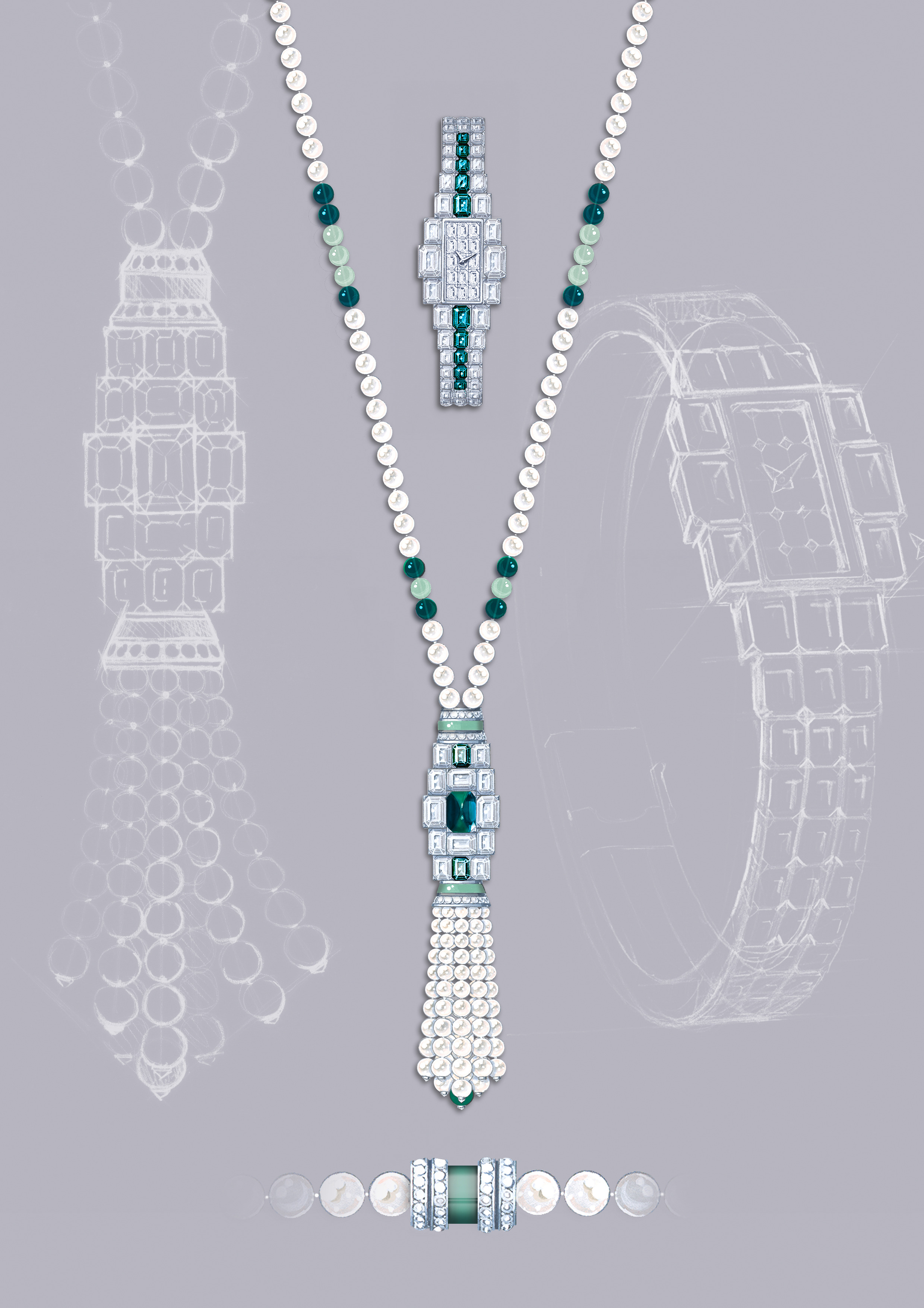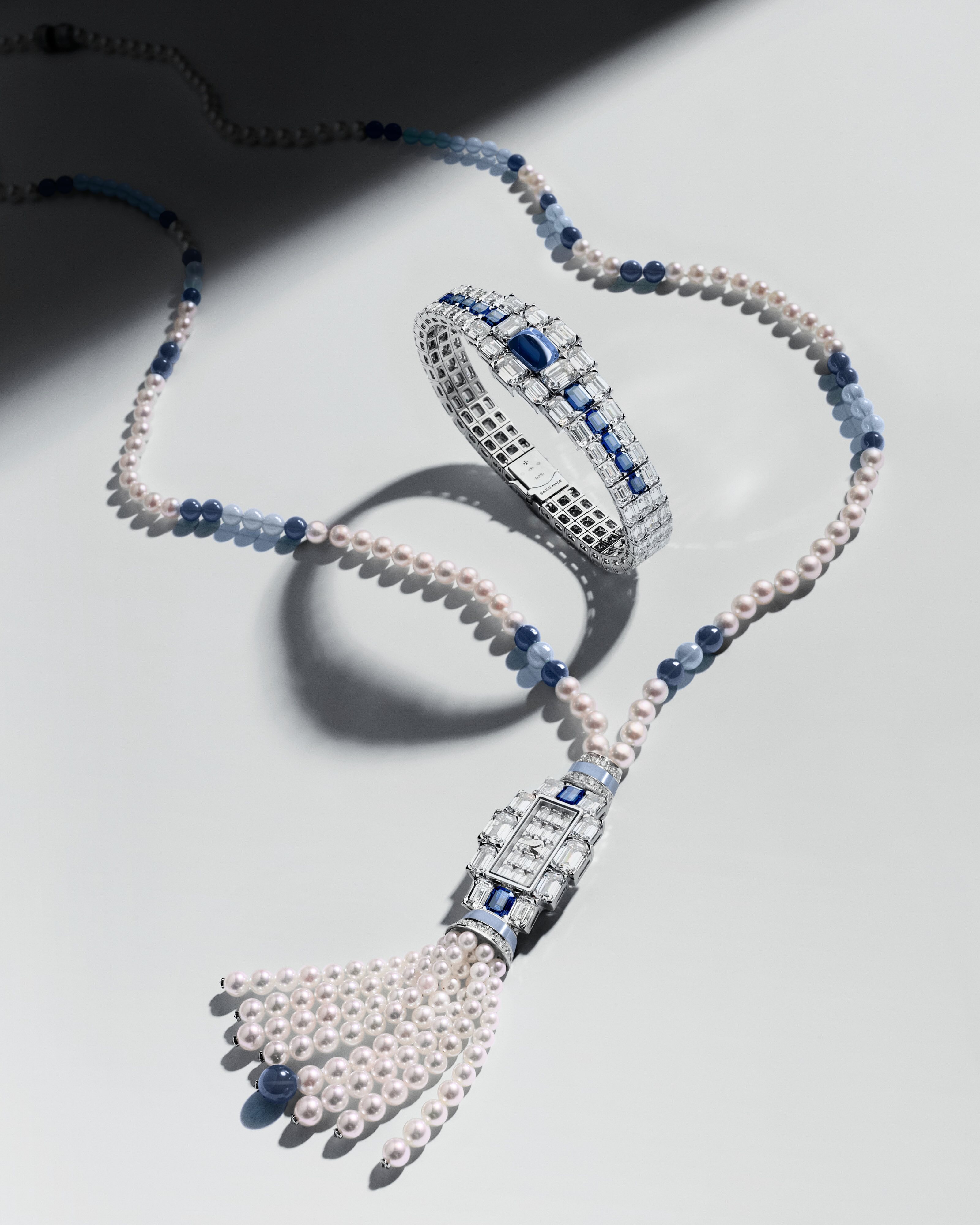 Repoussant les frontières de la créativité, cette nouvelle pièce se compose d’une montre et d’un sautoir à pampille pouvant être portés de quatre façons. Par son esthétique mêlant la géométrie rectiligne du bracelet, de la montre et de la pièce joaillière à la grâce sinueuse du sautoir, la Grand Lady Kalla résonne avec le style Art déco. Chacun des trois modèles présente un total de 45,66 carats de diamants et se compose de quatre éléments interchangeables. Le bracelet rivière à trois rangs compte 103 diamants, dont une rangée centrale ornée de huit pierres précieuses – saphirs, rubis ou émeraudes selon la version. La pièce joaillière, sertie de 12 diamants, est rehaussé en son centre d’un cabochon taille pain de sucre en saphir, rubis ou émeraude. Toutes les pierres de couleur sont certifiées SSEF (Swiss Foundation for the Research of Gemstones). Sur la montre au cadran entièrement serti de diamants, deux gemmes de même couleur taille émeraude contrastent avec l’éclat des 10 diamants taille émeraude pour former une corolle précieuse et délicate. La montre et la pièce joaillière sont toutes deux conçues pour s’adapter parfaitement au bracelet ou au sautoir. Long de 85 cm, le sautoir marie la rondeur de 112 perles Akoya – choisies pour leur lustre profond et leur éclat soyeux – à des perles de pierres précieuses et ornementales. L’extrémité du collier s’achève par une pampille de perles comprenant une perle de la pierre précieuse correspondante.