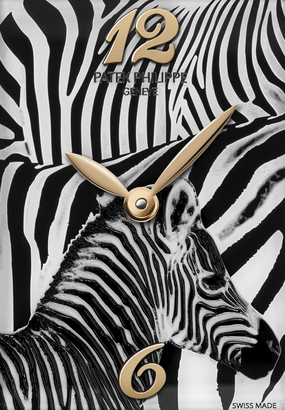 UN COMMENTAIRE ? Une « grande » référence Patek Philippe, non seulement par son format un peu inhabituel dans l’univers féminin (boîtier en or rose délicatement galbé de 18,6 mm x 40,8 mm x 7,3 mm, étanche à 30 m) ou par son prix (situé aux alentours des 50 000 euros, ce qui n’est pas rien pour une montre à quartz dont la batterie devrait durer trois ans), mais surtout par sa décoration figurative spectaculaire : il est vrai que le zèbre est un animal particulièrement « graphique » et que le regain d’intérêt pour l’Art déco nous réserve sans doute beaucoup d’autres zèbreries horlogères. Parés pour le grand carpo-safari qui nous est annoncé pour les poignets chics ?