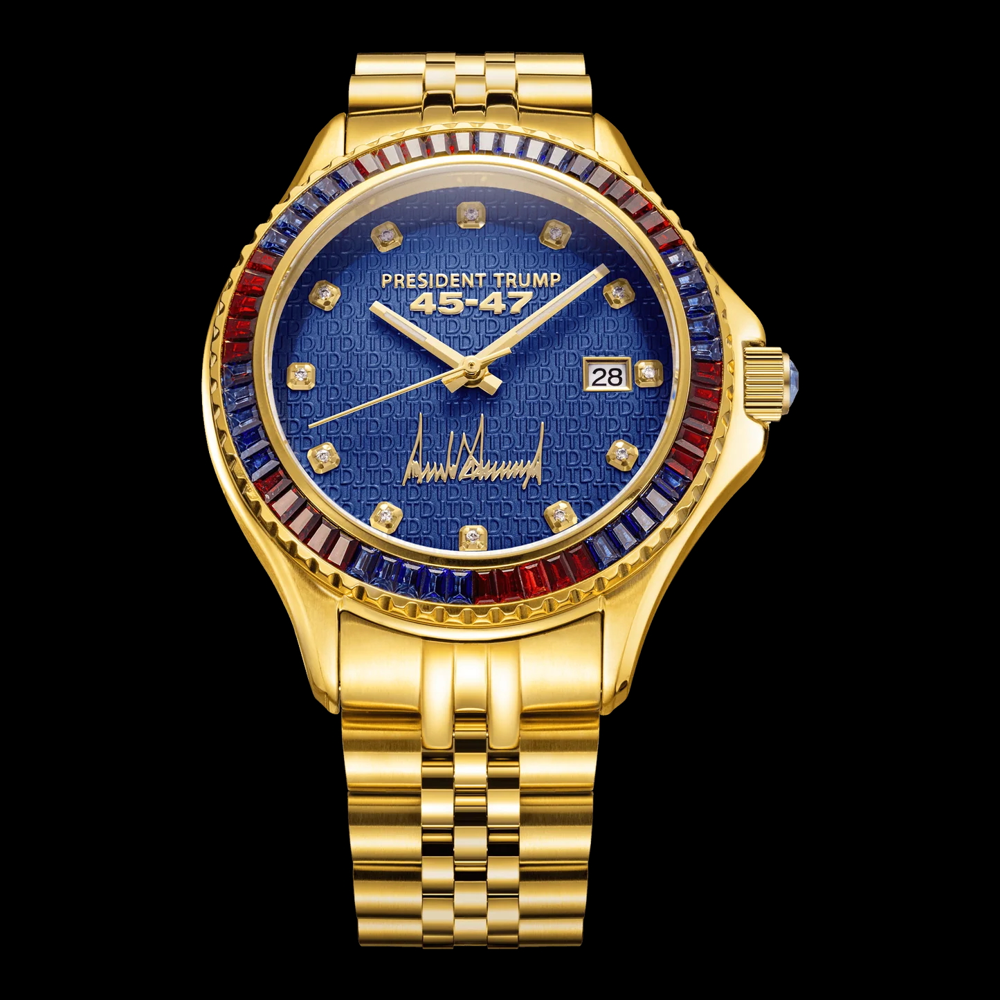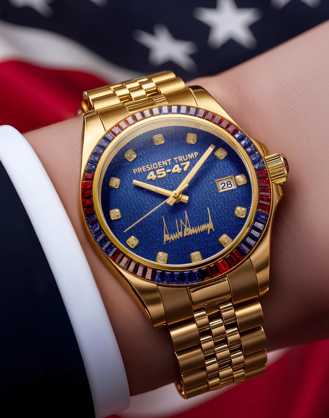 UN COMMENTAIRE ? Vendue avec les bonnes grosses ficelles du hard selling comme on l’aime aux États-Unis, les montres Trump – qui sont parfois Swiss Made – changent de nom assez fréquemment : les voici à présent « President Trump 45-47 » en mode bleu-rouge, ruisselantes de dorures et de diamants pour à peine moins de 1 200 dollars, dans une offre taillée sur mesures pour « pour les vrais patriotes et collectionneurs qui veulent le meilleur ». Espérons que les commandes pourront être servies à temps pour une série limitée qu’on nous annonce déjà quasiment sold out – ce qui demande à être vérifié…
