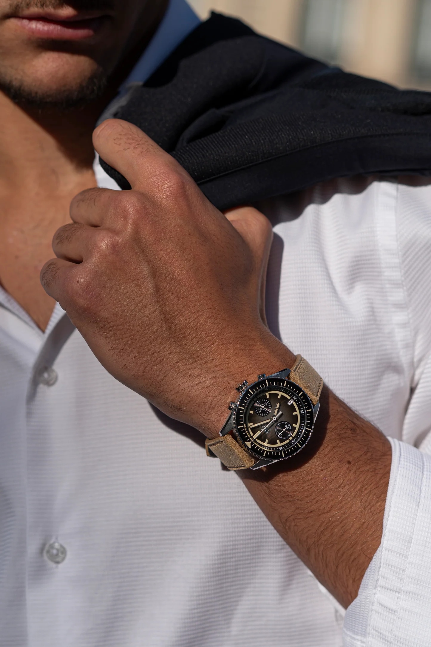 UN COMMENTAIRE ? Sacrifions donc à ce nouveau « renouveau néo-rétro », qui a au moins le mérite de nous proposer une montre d’inspiration « militaire » sans trop de concessions aux tendances horlogères du moment. Résultat : un bon vieux chronographe deux compteurs, qui semble être resté au congélateur depuis l’âge d’or des belles montres d’aviateur, dans une belle symphonie de gris et de noirs sougnés par l’ivoire du Super-LumiNova et proposé à 720 euros, ce qui est plutôt sympathique (boîtier en acier de 39,5 mm étanche à 200 m et animé par un mouvement méca-quartz, avec trois bracelets par montre : cuir sable, toile noire et « Tropic » noir)….