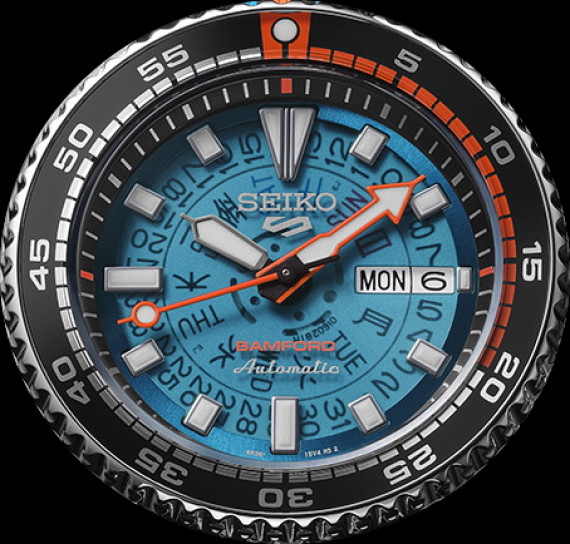 Doté d’un cadran squelette bleu, ce modèle reprend les index et aiguilles emblématiques de la série SKX des années 1980. Inspiré par l’océan, le cadran translucide incarne la vision de la dualité selon George Bamford : ce qui se révèle et ce qui demeure caché, l’instant présent et l’intemporel — deux univers réunis en une seule création.Inspiré par l’océan, le cadran translucide incarne la vision de la dualité selon George Bamford : ce qui se révèle et ce qui demeure caché, l’instant présent et l’intemporel — deux univers réunis en une seule création. L’insert de lunette réinterprète un design d’archives Seiko emblématique, réalisé dans une matière aux reflets précieux qui marie subtilement la nostalgie à une esthétique futuriste. Le logo « Bamford » s’inscrit avec discrétion à 6 heures sur le cadran ainsi que sur la boucle du bracelet en nylon, apportant une signature raffinée et subtile. Les index et aiguilles sont revêtus de Lumibrite. Grâce à des touches fluorescentes disséminées sur la lunette, les aiguilles et le bracelet en nylon, la montre dévoile une expression totalement nouvelle sous la lumière noire. Le fond de boîte est gravé de la mention « Limited Edition » et d’un numéro de série, attestant de son exclusivité, ainsi que du logo BWD imprimé, emblème du Bamford Watch Department. Le coffret de présentation, hommage aux packagings des années 1960, se distingue par un design unique sur lequel le logo Bamford est imprimé.