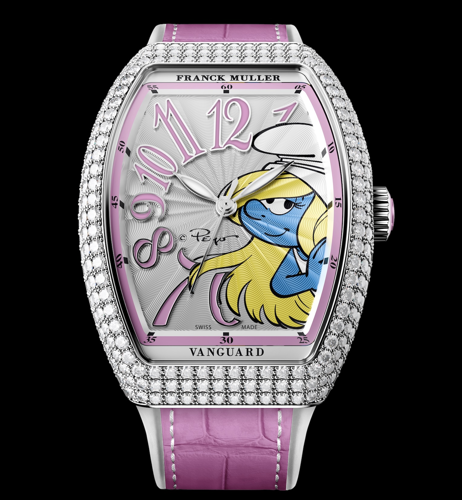 UN COMMENTAIRE ? Si les super-héros américains et les personnages des mangas japonais mobilisent régulièrement l’énergie créative des horlogers suisses, la bande dessinée européenne – notamment belge – les intéresse nettement mois, qu’on parle d’icônes internationales comme Tintin ou de créations originales comme les Schtroumpfs – devenus Smurfettes en anglais. C’est pourquoi on ne peut que saluer l’initiative Schtroumpfette de la manufacture suisse Franck Muller, qui rend hommage à l’univers des petits lutins bleus chaussés de blanc imaginés par le créateur belge Peyo (1928-1992) en 1958. Cette Schtroumpfette aux longs cheveux blonds est apparue dans la série de bandes dessinées en 1967 : comme les Schtroumpfs, elle porte un bonnet phrygien blanc, mais aussi une robe blanche et des talons hauts blancs – il faut se souvenir qu’elle avait été inspirée à Peyo par… Brigitte Bardot ! La voici immortalisée sur un cadran de Vanguard Franck Muller, avec trois variantes pleines de couleurs et de bonne humeur, dans l’esprit du film The Smurfs de Chris Miller (2025), avec Rihanna dans le rôle de la Smurfette. Avec ou sans fleurs, avec ou sans diamants, ces Vanguard ont toujours des couleurs et elles sont annoncées autour des 22 000 euros en version sertie et à 11 000 euros en version non sertie (boîtier tonneau en acier rhodié de 32 mm x 42,3 mm x 9,9 mm d’épaisseur, étanche à 30 m et animé par un mouvement automatique suisse qui dispose de 38 heures de réserve de marche : achat en ligne sur le site de Watchespedia et dans certaines boutiques Franck Muller). Une horlogerie très soignée pour une héroïne qui ne se prend pas au sérieux : vive la Schtroumpfette aux charmants caprices ! – Atlantic-Tac/Business Montres pour Atlantico du 21 novembre