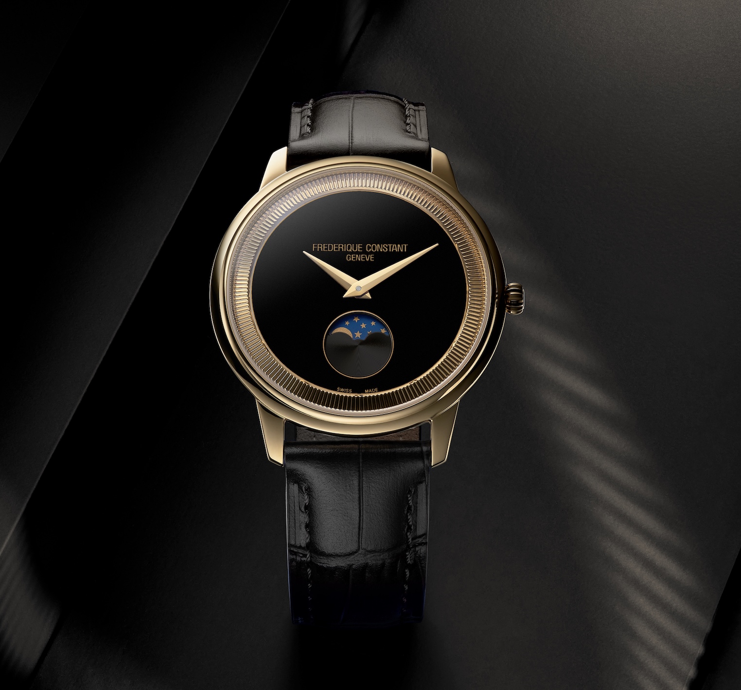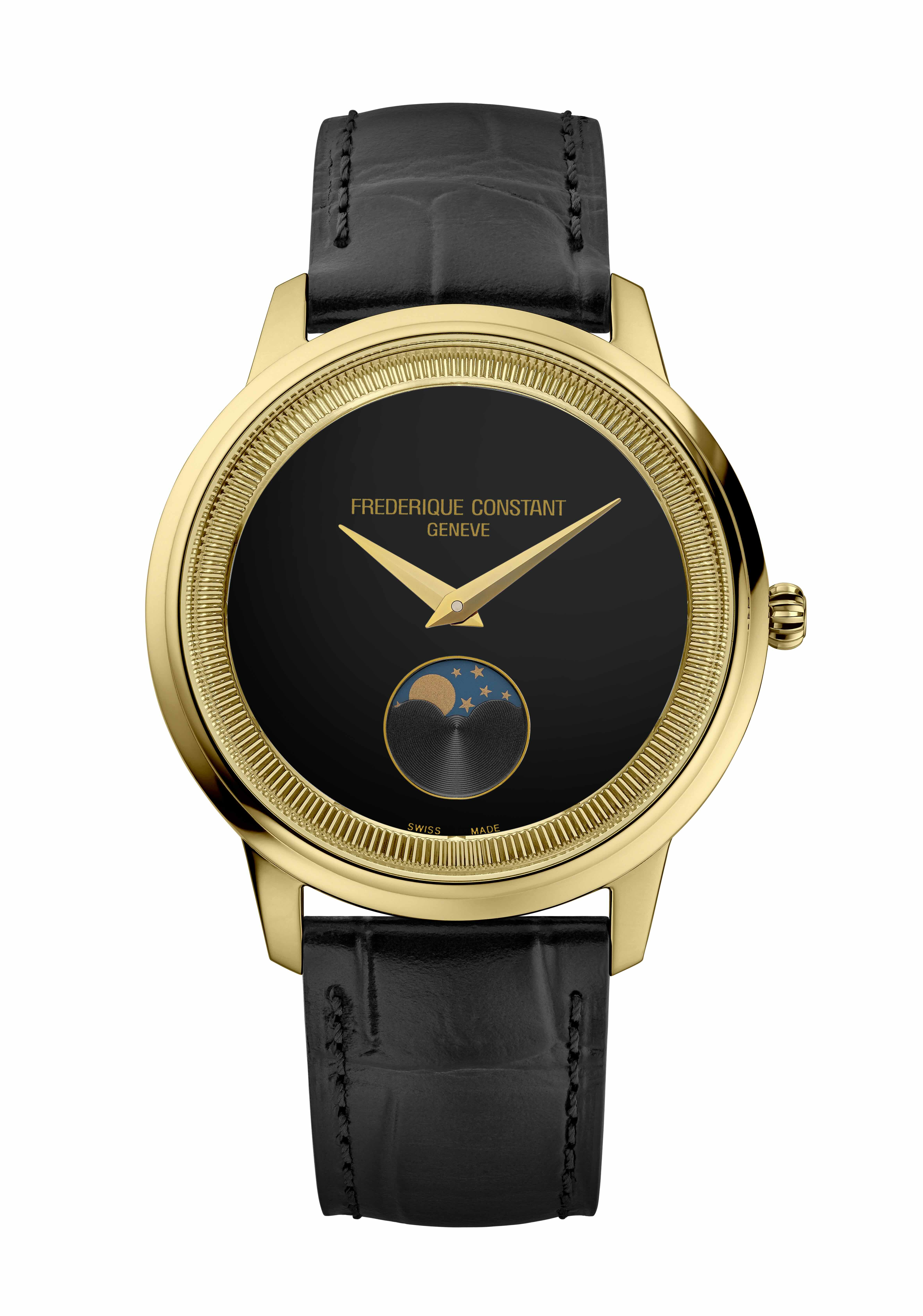 Frédérique Constant préserve les codes de la belle horlogerie genevoise, mais se les approprie pour les conjuguer à sa jeunesse et à son indépendance revendiquée. Le cadran est d’un noir absolu, parfait, intense et profond. La phase de lune à 6 heures, toujours sur fond bleu avec étoiles et lune de couleur or, n’en ressort que plus astrale. Il en va de même pour les deux aiguilles centrales. Adoptant le design vintage dauphine, elles sont finement polies. Dépourvue d’aiguille des secondes, la Classics Moneta Moonphase avance de manière douce et imperceptible, au même rythme que la phase de Lune progresse insensiblement. Un temps qui s’égrène au rythme d’un mouvement à quartz doté de 60 mois d’autonomie, soit 5 années complètes.Mystérieuse, la nouvelle Classics Moneta Moonphase n’en est pas moins resplendissante au poignet. Son habillage se pare à présent d’un boîtier doré. Vif et éclatant, il pousse au maximum le curseur du contraste avec le cadran noir, mais aussi avec le bracelet. Également noir, il révèle un dernier twist cher à la Classics Moneta : frappé de motifs d’écailles d’alligator, il est en réalité en veau, terminé par une boucle ardillon souple et légère, idéale pour une pièce de seulement 37 mm de diamètre.