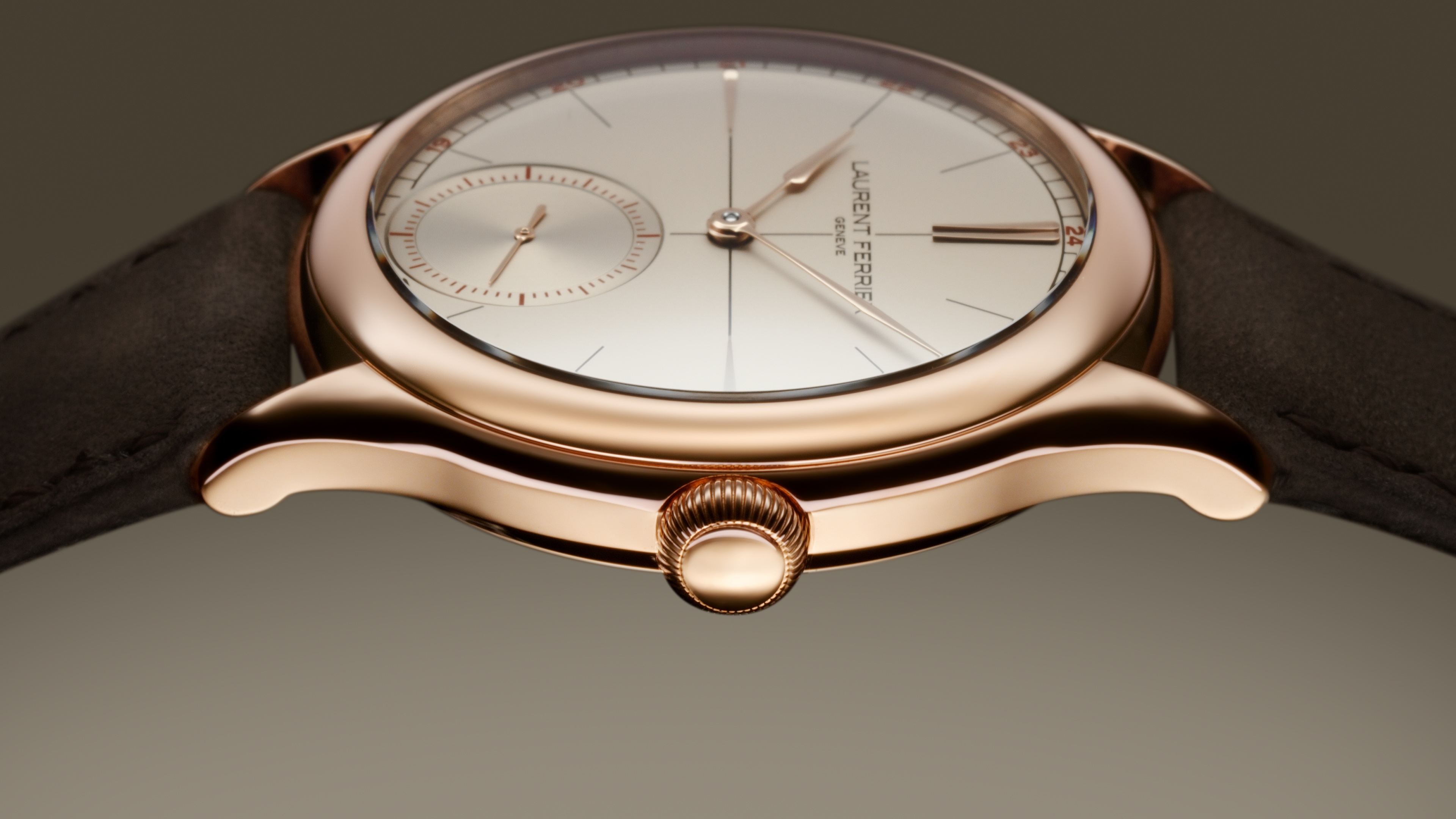 Cinq ans plus tôt, pour célébrer sa première décennie, Laurent Ferrier donnait naissance à la Classic Origin. Une pièce pensée comme une évidence, symbole d’un style qui ne cherche jamais à séduire par l’excès, mais par la justesse. Aujourd’hui, pour ses quinze ans, la Maison dévoile une nouvelle variation de ce modèle fondateur : la Classic Origin Beige. On y retrouve les courbes familières, celles du boîtier Classic emblématique de 40 mm, dont les lignes rappellent un galet poli par les rivières. Dans la collection LF, c’est la première fois que la Classic Origin se pare d’un éclat inattendu : l’or rouge 5N. Ce métal noble et chaleureux, associé à un cadran beige inédit, donne naissance à une montre qui respire à la fois le souvenir et la modernité. Comme un écho discret au passé, ses tons chauds et délicatement accordés dégagent une douceur qui traverse les époques sans jamais se figer, un équilibre subtil entre héritage et présent. La Classic Origin Beige incarne mieux que toute autre le minimalisme cher à Laurent Ferrier. Son cadran beige, teinté de nuances chaudes, vibre au rythme des décalques brunes du chemin de fer, de la croix centrale et des marqueurs d’heures. La lisibilité, essentielle, s’affirme à travers la minuterie ponctuée de chiffres rouges, répondant aux marqueurs de la petite seconde à six heures. Au centre, les fameuses aiguilles Sagaie en or 18k glissent sur la surface opaline avec une élégance tranquille comme si elles connaissaient déjà le récit du temps qu’elles indiquent.Et puis, il y a la couronne. Ce détail que l’on croit secondaire, mais qui ne l’est jamais. Sa forme de boule en dit long : plus qu’une signature, elle est une intention. Laurent l’a voulue ainsi, charnue et accueillante, pour que le remontage ne soit pas un simple geste mécanique, mais un instant de plaisir authentique.