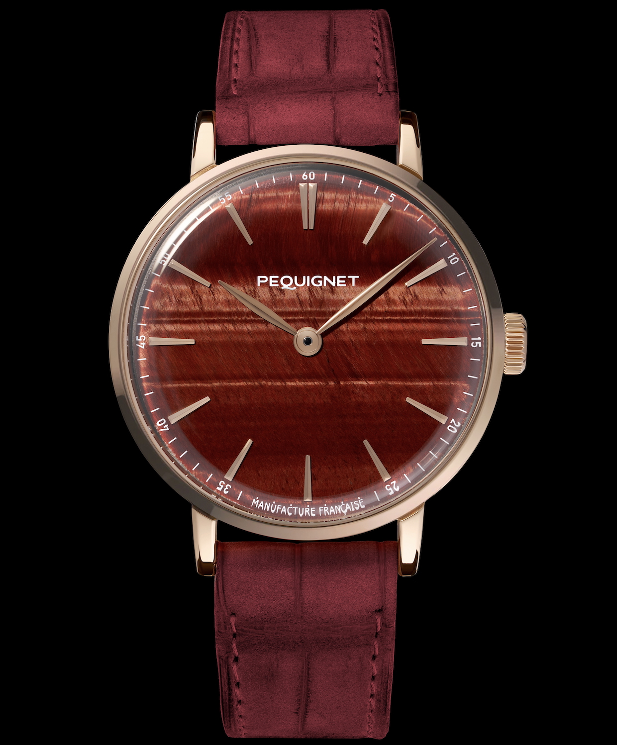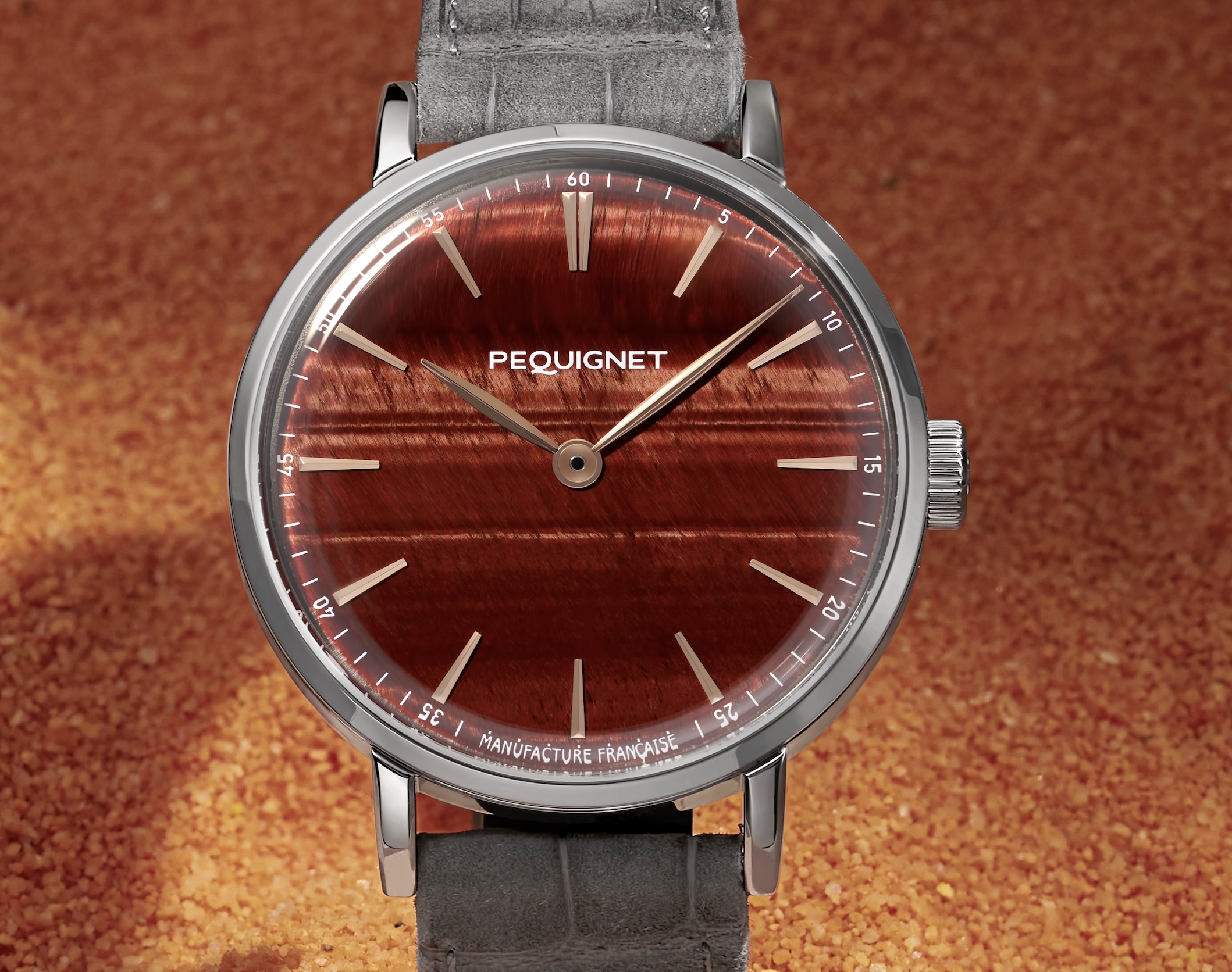 Les bracelets s’habillent de peau d’alligator « cachemire ». Ils ont été créés spécifiquement par la Maison Jean Rousseau pour s’harmoniser parfaitement avec le boîtier. Cette entreprise familiale, spécialiste du sur-mesure et labellisée Entreprise du Patrimoine Vivant, incarne l'artisanat d'excellence français près de Besançon depuis 1954. La version à boîtier en or reçoit un bracelet bois de rose à la teinte bordeaux, et la version à boîtier acier, un bracelet gris clair. Les élégantes doublures se parent d’alligator à écailles rondes. L’Attitude Œil de Tigre est conçue et assemblée à Morteau, en Franche-Comté. Comme toutes les montres de la collection Attitude, Œil de Tigre est animée par le Calibre Initial, troisième mouvement de la Maison Pequignet. Il offre une réserve de marche de 65 heures et une superbe masse oscillante ajourée en relief, visible à travers son fond saphir. Résolument local et durable, le Calibre Initial conjugue technicité, précision et fiabilité. L’ensemble de ses composants est approvisionné à moins de 80km du siège de la Manufacture, et 72 % sont d’origine française. L’Attitude Œil de Tigre illustre, une nouvelle fois, l’engagement de la Manufacture Pequignet au service d’un savoir-faire d’excellence horlogère française.