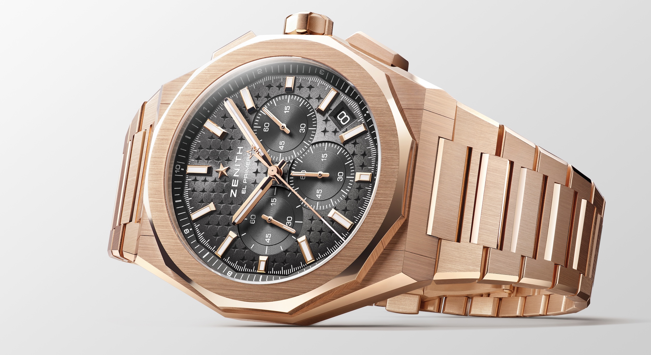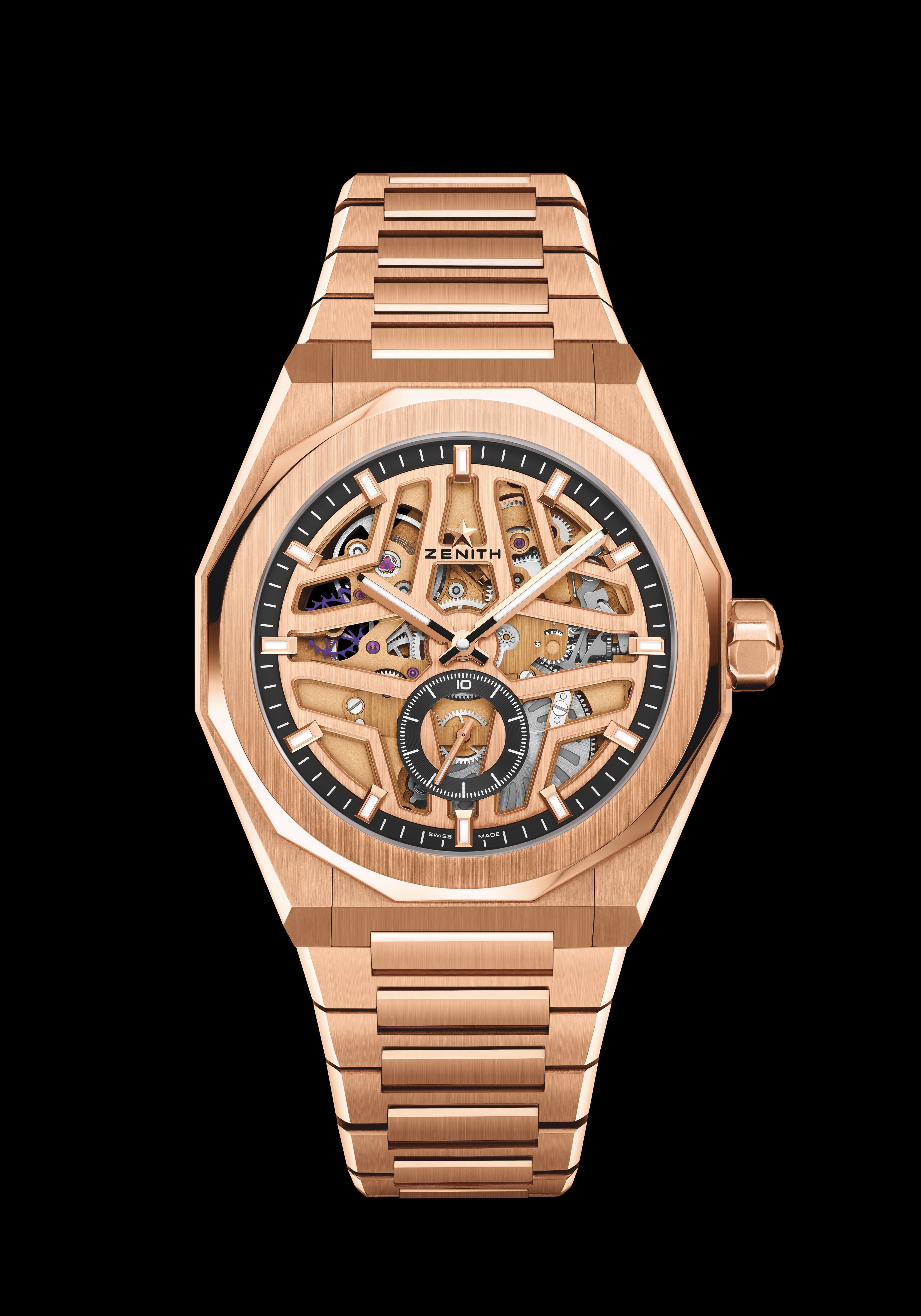 Pour la première fois proposée en or rose, la Defy Skyline Chronograph (42 mm) associe chaleur métallique et élégance contemporaine. Son cadran dégradé gris ardoise, orné du motif « ciel étoilé » de Zenith, s’anime sous les variations de lumière et vient magnifiquement contraster avec l’intensité de l’or. Au cœur de la montre, le calibre El Primero 3600 — dernière génération dumouvement chronographe haute fréquence de la Manufacture — bat à 5 Hz et offre une lecture authentique du 1/10e de seconde. La grande trotteuse du chronographe effectue une rotation complète en dix secondes, créant une mise en scène dynamique de la mesure du temps. Le fond saphir dévoile le mécanisme : roue à colonnes, embrayage horizontal et masse oscillante en or 22K ajouré, un ensemble d’un raffinement technique remarquable. La Defy Skyline Skeleton de 41 mm en or rose réinterprète le squelettage sous un angle résolument contemporain. Son cadran ouvert, tout comme son mouvement ajouré teinté d’or rose, joue sur les profondeurs, les ombres et les transparences pour offrir une véritable architecture horlogère. À travers le cadran et le fond saphir, le calibre El Primero 3620 SK dévoile son battement haute fréquence, entraînant directement l’indicateur du 1/10e de seconde pour une lecture vivante et rythmée. Le boîtier et le bracelet intégré alternent finitions satinées et polies, réfléchissant la lumière avec une finesse particulière qui confère au garde-temps une présence éclatante.