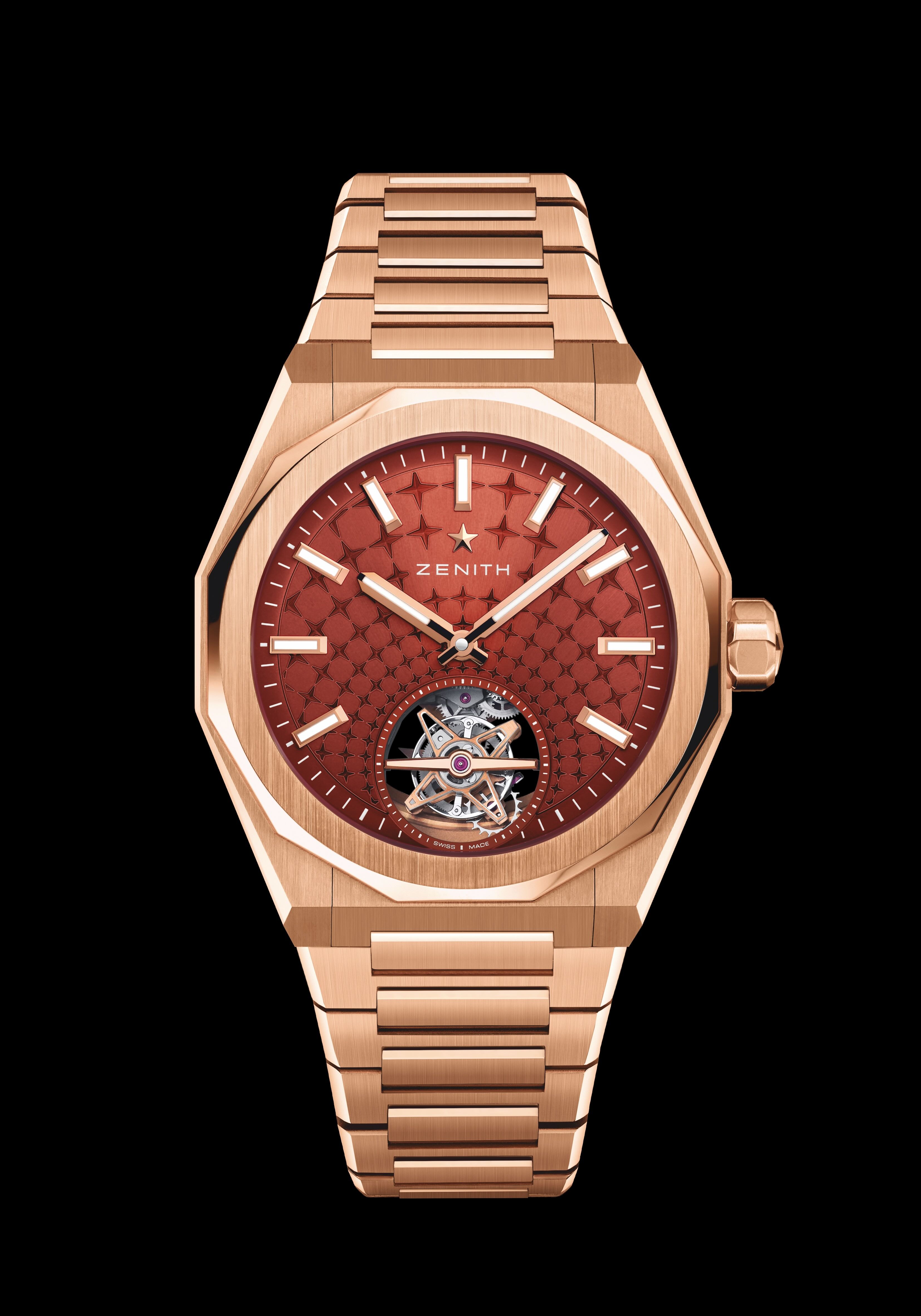 Point culminant de cette nouvelle collection, la Defy Skyline Tourbillon est le premier modèle de la ligne à être entièrement réalisé en or rose. Son cadran rouge brique à décor rayons de soleil, ponctué de petites étoiles gravées convergeant vers la cage de tourbillon à 6 heures, rend hommage à l’architecture historique de la Manufacture à Locle. Le calibre El Primero 3630, visible au dos, intègre une cage de tourbillon en forme de double étoile Zenith qui effectue une rotation par minute — une expression hypnotique de précision en mouvement. La pièce est livrée avec un bracelet en or rose à maillons en H ainsi qu’un bracelet en caoutchouc rouge brique accompagné d’une boucle déployante assortie, soulignant l’allure contemporaine et lumineuse du modèle. Chaque modèle est équipé du système de changement rapide de Zenith, permettant de passer du bracelet en or au bracelet en caoutchouc en quelques secondes, sans outil. Ce mécanisme intuitif permet d’adapter la montre au style ou à l’occasion, offrant une polyvalence appréciable pour ces pièces d’exception. Les éditions Defy Skyline Gold sont désormais disponibles dans les boutiques Zenith, en ligne et chez les détaillants agréés dans le monde entier.