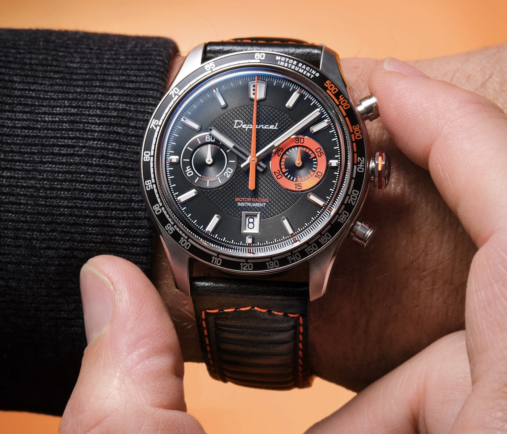 UN COMMENTAIRE ? Si l’inspiration vintage est indéniable dans ce boîtier en acier de 43 mm x 15 mm d’épaisseur, étanche à 100 m et animé par un mouvement automatique suisse (ETA 7753) qui promet 54 heures de réserve de marche, ce chronographe n’en affiche pas moins une série de touches contemporaines bienvenues (compter dans les 2 400 euros pour cette série limitée de 50 pièces,imaginée, conçue et assemblée en France : la montre est livrée avec deux bracelets, cuir et métal).
