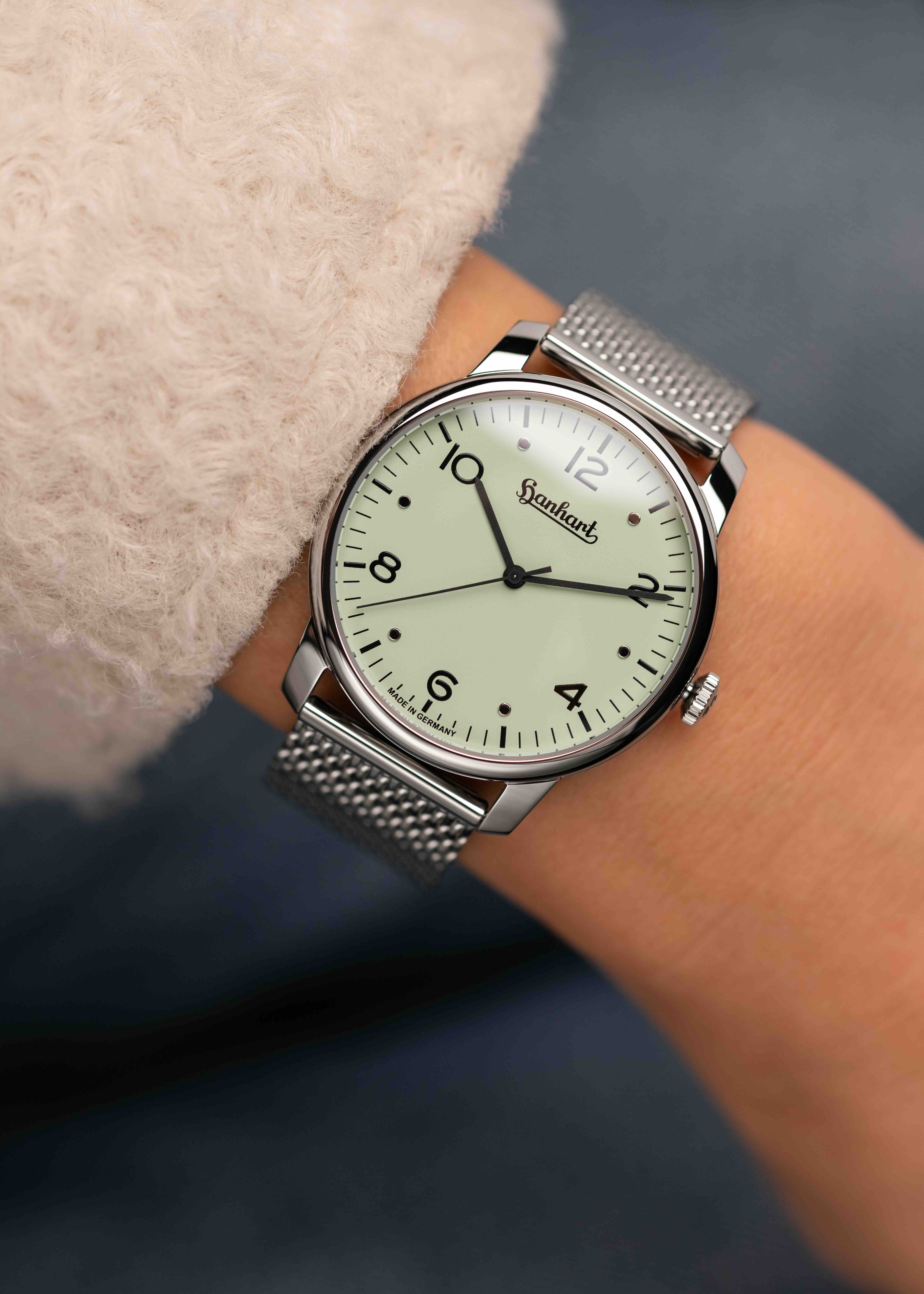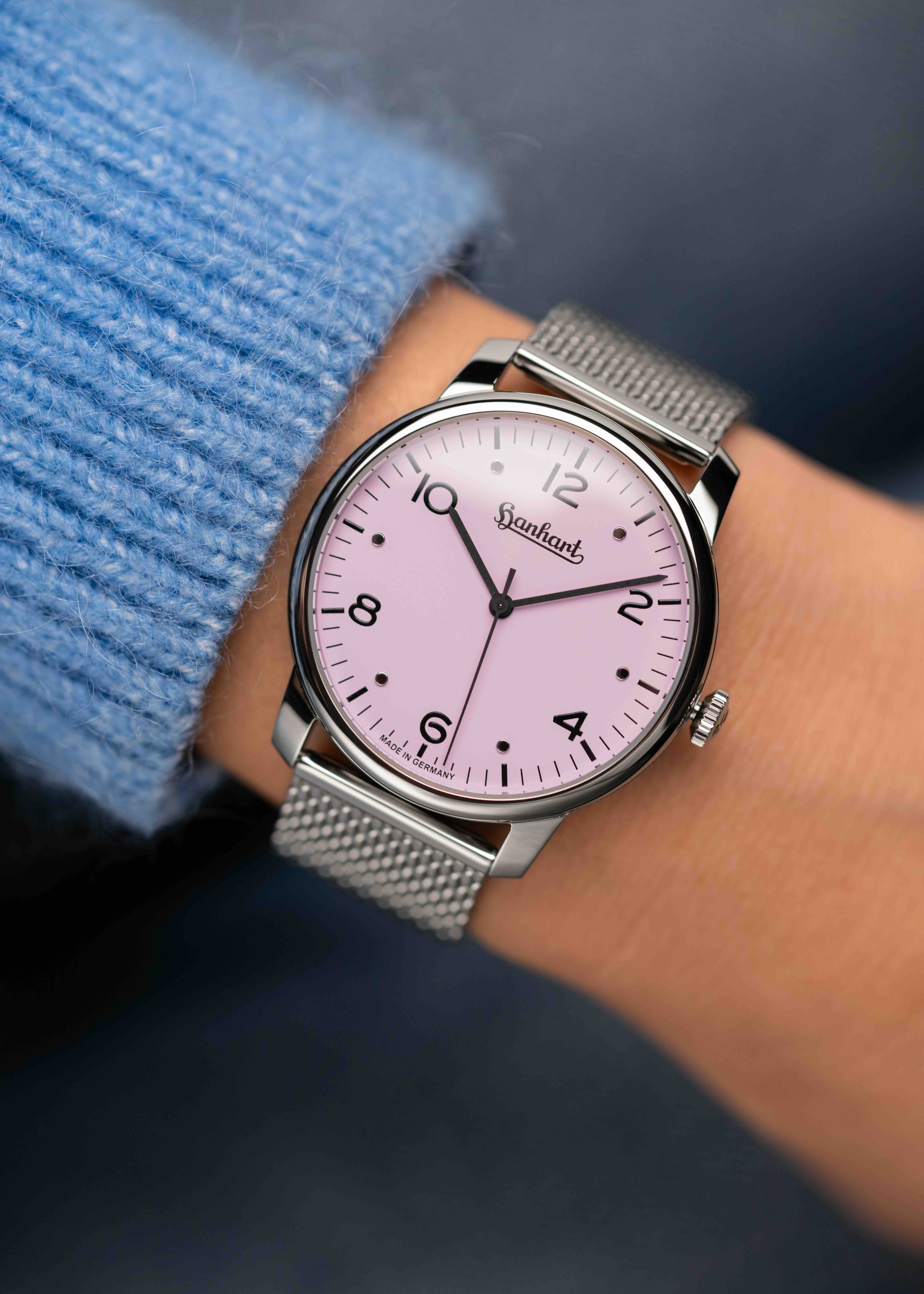 Légèreté et joie de vivre pour des journées qui raccourcissent : pour faire fi de la morosité de l'hiver qui approche, Hanhart ajoute deux nouvelles couleurs à la gamme Silva : rose pastel et vert pistache. Les deux modèles se caractérisent par des lignes épurées, des proportions équilibrées et une esthétique intemporelle délibérément unisexe. Le nom « Silva », qui signifie « forêt » en latin, fait référence à l'origine de cette montre : elle est fabriquée dans la Forêt-Noire, à Gütenbach, où Hanhart est synonyme de précision et de savoir-faire depuis 1882. La Silva allie un design puriste à l'ADN classique de Hanhart. Le boîtier en acier inoxydable de 38,5 mm et d'une hauteur de seulement 10 mm garantit des proportions parfaites et un grand confort au porter, idéal pour tous les poignets. Le cadran vert pistache ou rose pastel combine des aiguilles claires et contrastées avec des points marquants et le logo historique de Hanhart. Le look : moderne, épuré, fonctionnel. Le design de la nouvelle Silva s'inspire d'un modèle Hanhart des années 1930, le Calibre 36/39, connu pour son design épuré. Cette inspiration a été réinterprétée et modernisée sur le plan technique. Le boîtier en acier inoxydable poli, le verre saphir bombé avec traitement antireflet à l'intérieur et le fond vissé en verre saphir avec vue sur le mouvement créent un lien entre le passé et le présent : un style classique, un design moderne. La Silva renferme le fiable Soprod SOP P024, un mouvement automatique de haute qualité en version TOP, synonyme de précision et de longévité. Ce mouvement robuste à trois aiguilles sans affichage de la date bat à une fréquence de 28 800 alternances par heure (4 Hz) et compte 25 rubis. Un balancier Glucydur et le système de protection contre les chocs Incabloc garantissent une stabilité maximale et une protection optimale dans le cadre d'une utilisation quotidienne. Avec une réserve de marche d'au moins 38 heures, le mouvement offre une durée de fonctionnement fiable, tandis que la fonction d'arrêt des secondes permet de régler l'heure avec précision. Le rotor squeletté avec le logo Hanhart souligne le haut niveau de savoir-faire artisanal et est visible à travers le fond vissé en verre saphir.