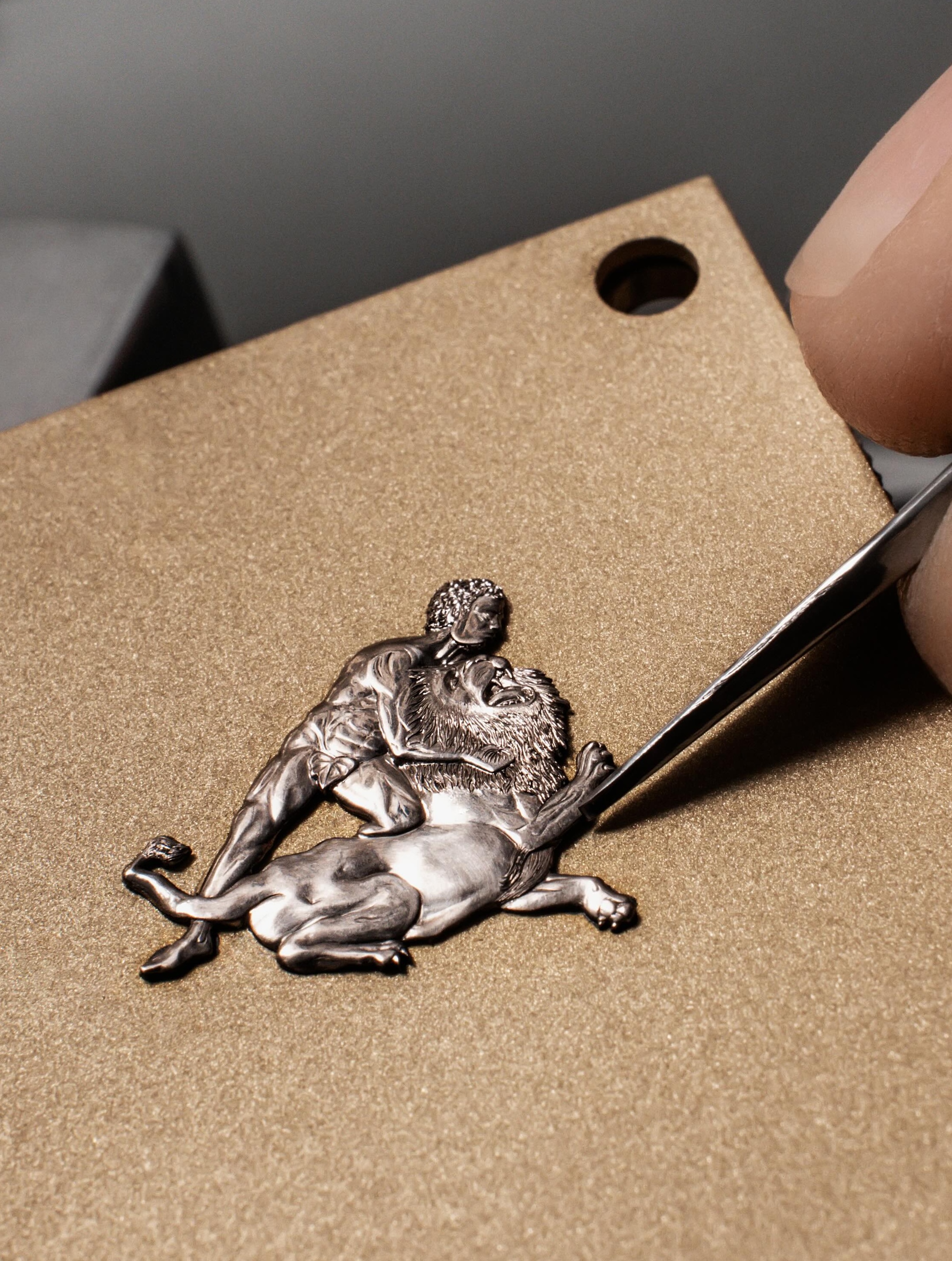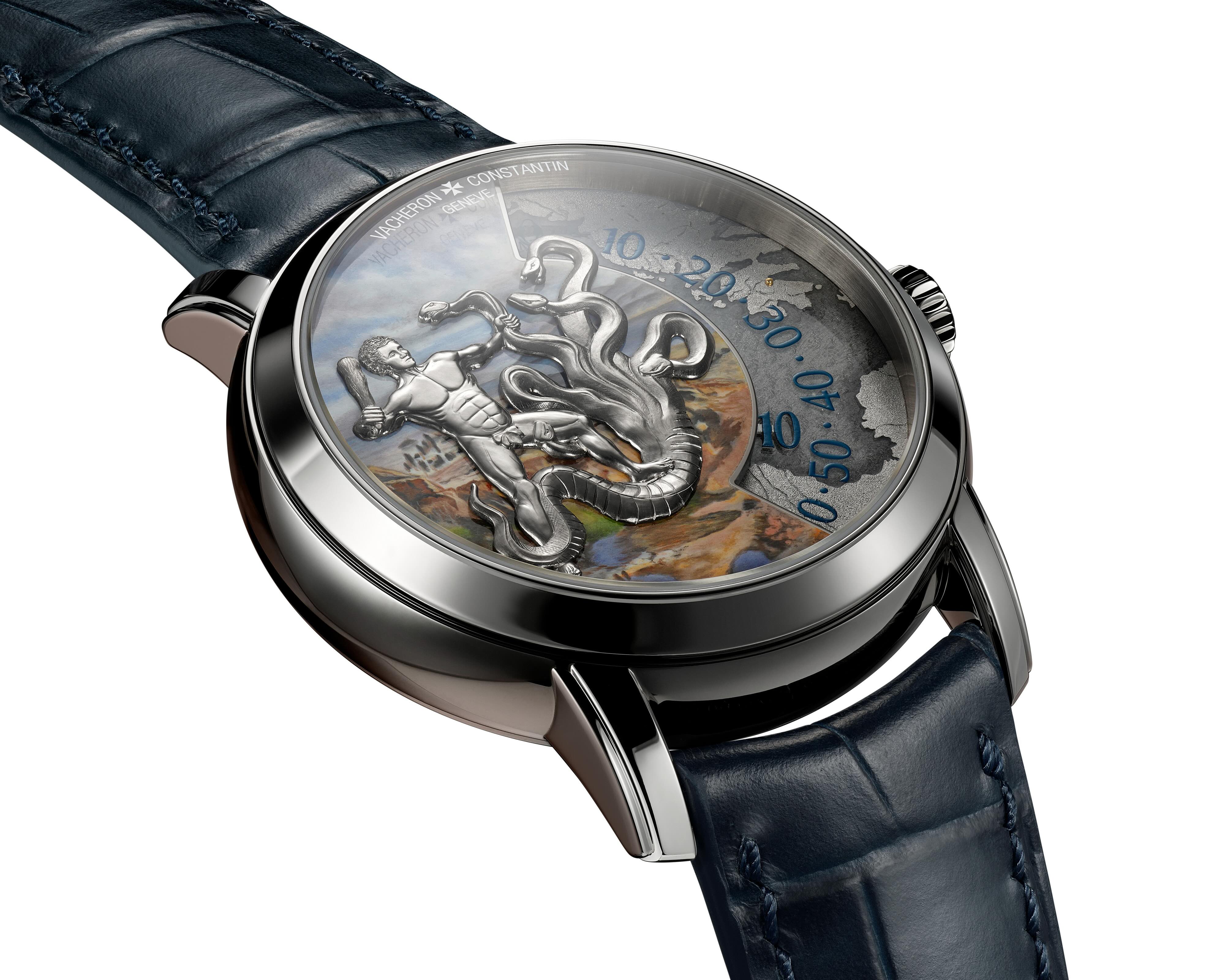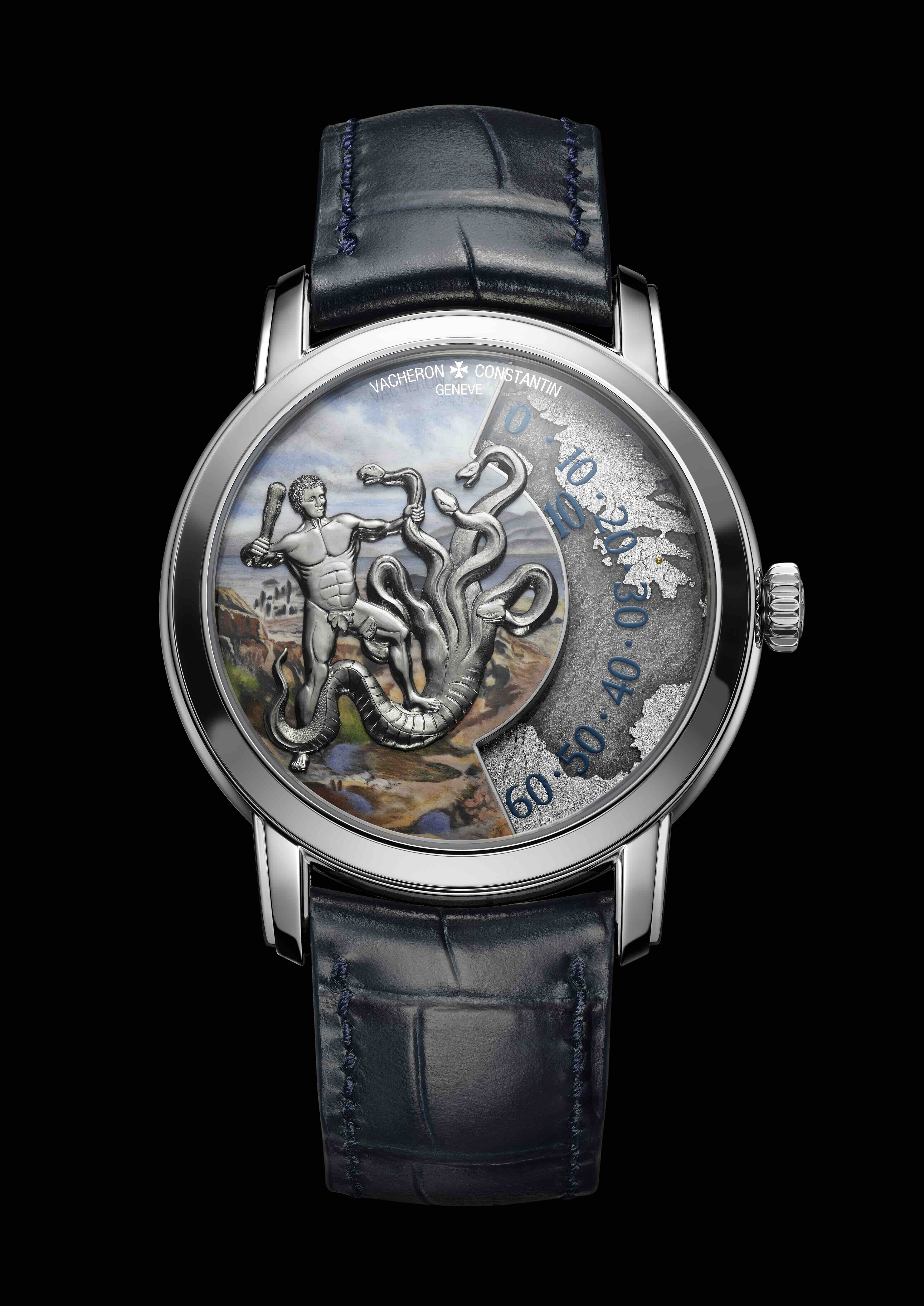 De leur côté, les cadrans Les Travaux d’Héraclès signés Vacheron Constantin constituent une réinterprétation contemporaine de ce thème, puisant leur inspiration dans la sculpture grecque classique et la peinture des maîtres européens anciens. Le héros, une micro-sculpture tridimensionnelle en or blanc, se détache sur fond de peinture miniature de couleur, réalisée en en émail grand feu, évoquant le paysage où se déroule chacun des travaux. La réalisation du fond émaillé peint à la main a nécessité au total 50 heures d’un travail d’une très grande précision. Celui-ci débute par l’application de cinq couches d’émail blanc opalescent sur la base en or blanc 18K afin de créer un effet chatoyant sur lequel sont ensuite ajouté le ciel, l’eau et la terre. Chaque couche doit être cuite à très haute température avant l’application de la suivante. S’ensuit la peinture du paysage avec de subtiles variations de couleurs et une grande minutie dans la représentation des roches, de la végétation et des formations nuageuses. Un travail qui requiert dix couches d’émail successives. Gravée main en micro-sculpture, la figure d’Héraclès en or blanc 18K, engagé dans un combat à mort contre une redoutable créature mythologique, respire la force et la puissance. Bien qu’elle mesure seulement 0,5 mm d’épaisseur, elle dégage une impression d’un grand dynamisme grâce au soin apporté par le graveur aux détails de la musculature, des traits du visage et de la chevelure d’Héraclès. Un même soin du détail est apporté à la fourrure, aux écailles ou aux plumes des différentes créatures qu’il affronte. Chaque applique requiert environ 40 heures de micro-sculpture.