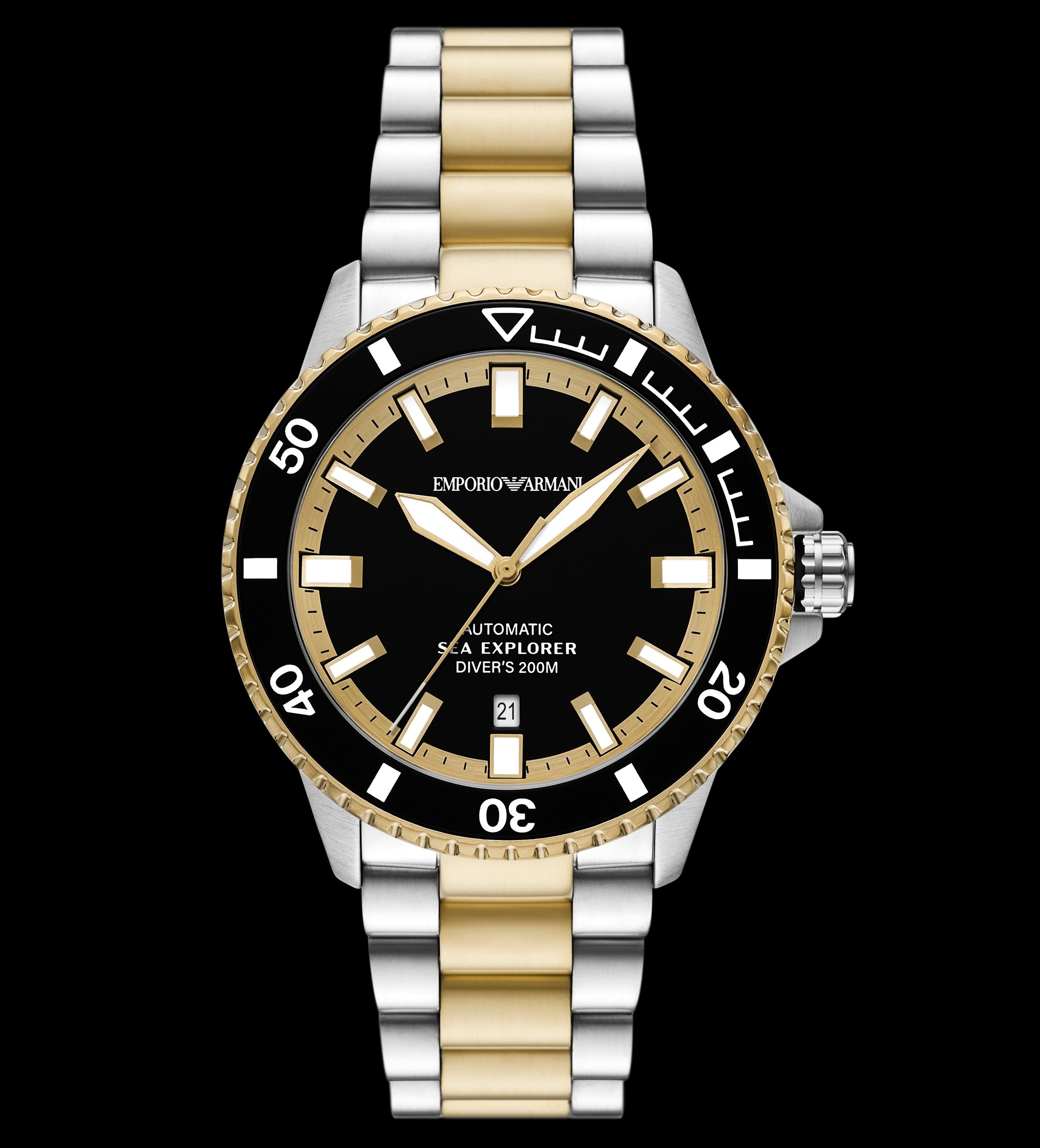 La Sea Explorer est une montre de plongée automatique de 42,5 mm avec aiguilles, index et marquages sur la lunette en Super-LumiNova et verre saphir, pour une visibilité optimale. La montre Emporio Armani Sea Explorer est conçue pour ceux qui recherchent fiabilité et précision sans renoncer au style. Conforme à la norme ISO 6425 et étanche jusqu’à 20 ATM (200 mètres), elle est équipée d’un mouvement automatique, d’une lunette unidirectionnelle, d’une couronne vissée et d’un cadran avec des index et des aiguilles en Super-LumiNova garantissant une bonne lisibilité même en faible luminosité. Parmi les caractéristiques techniques, on compte également un verre saphir anti-rayures et un fond de boîte fermé.