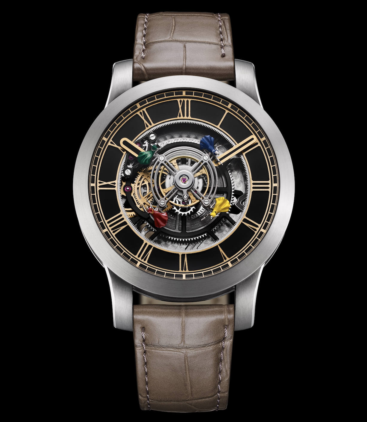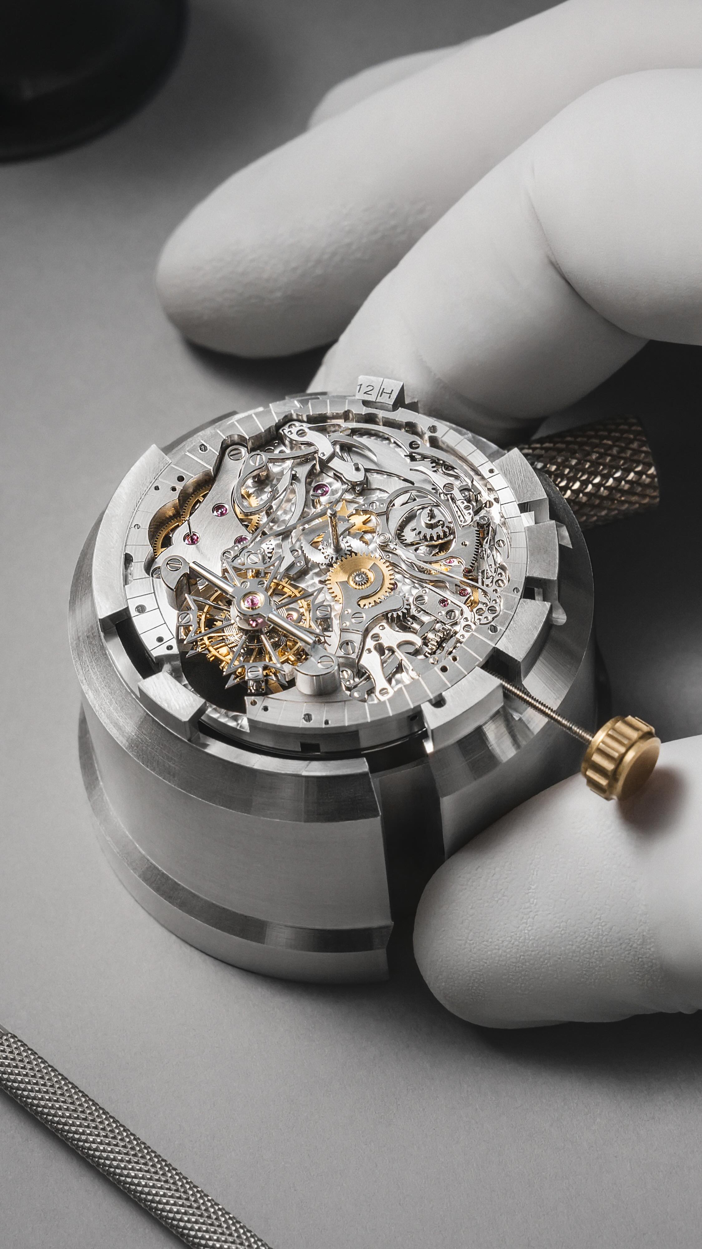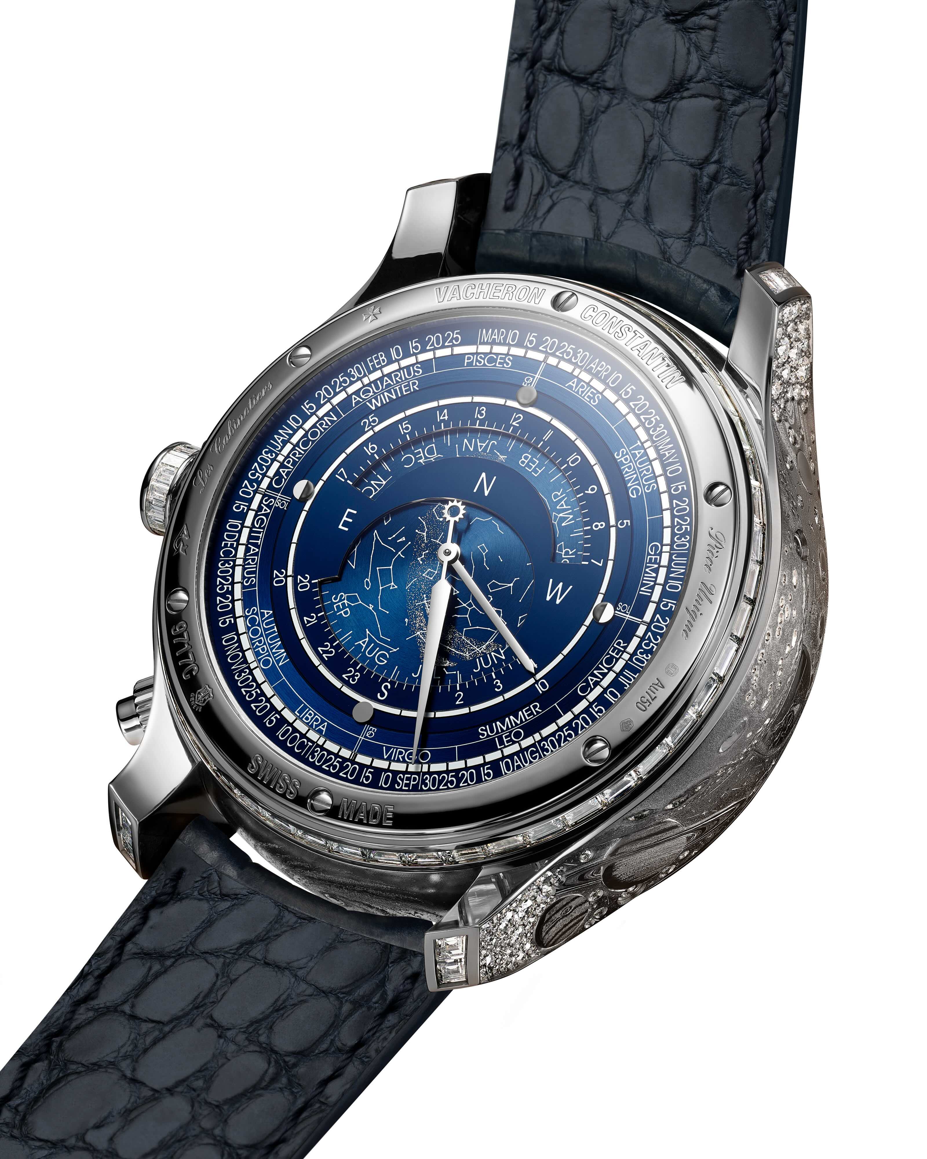 La mécanique complexe de cette pièce donne une lecture astronomique du temps. Les premières fonctions prennent également place au recto, à commencer par l’équation du temps à 10h30. Comme la course de la Terre autour du Soleil décrit une trajectoire non pas circulaire mais elliptique et comme l’axe de la Terre est incliné à 24° par rapport au plan de son orbite, la durée entre deux passages du Soleil au zénith n’est pas la même tout au long de l’année. Cette différence entre le jour solaire (vrai) et le jour civil (moyen) de 24 heures, va de -16 à +14 minutes selon les époques de l’année pour ne coïncider que quatre fois par an aux solstices et équinoxes. Appelée équation du temps, ce différentiel est affiché par aiguille. De part et d’autre du tourbillon, on découvre encore les heures de lever et de coucher du soleil selon une ville de référence. Au verso de la montre, le temps sidéral se révèle grâce à un disque rotatif représentant la voûte céleste et les constellations observables depuis l’hémisphère nord. Le temps que met la Terre à effectuer un tour complet de 360°, ou jour sidéral, est d’exactement de 23 heures, 56 minutes et 4 secondes en prenant comme point de référence une étoile fixe de la voûte céleste. Comme la Terre effectue à la fois une rotation sur elle-même et une révolution autour du soleil, il lui faut en effet environ quatre minutes de moins qu’un jour civil pour retrouver son point d’origine par rapport à l’étoile donnée. Sur cette pièce, un disque « céleste » gravé des constellations effectue une rotation quotidienne « accélérée » de 4 minutes, selon le temps sidéral. L’heure est affichée sur un cadran ajouré fixe, gradué aux 15 minutes. La date se trouve sur le pourtour du disque mobile, en vis-à-vis de l’heure et est également indiquée sur le rehaut extérieur fixe, gradué de 5 en 5, grâce à la grande aiguille centrale. Celle-ci sert également à indiquer les quatre dates correspondant aux solstices et aux équinoxes, les signes du zodiaque et les saisons, indiqués en cercles concentriques sur le cadran fixe. La petite aiguille centrale renseigne quant à elle l’âge de la lune, soit le nombre de jours écoulés depuis la dernière nouvelle lune. Ce mouvement de 33,90 mm de diamètre et 12,15 mm d’épaisseur, assemblé de 839 composants minutieusement terminés, offre 58 heures de réserve de marche. Cadencé à 18’000 alternances/heure (2,5 Hz), il prend place dans un boîtier en or blanc 18k de 47 mm de diamètre, dont les caractéristiques ont été spécifiquement étudiées pour offrir la meilleure qualité sonore à la répétition minutes. Cette prouesse technique et de miniaturisation affiche toutes ses fonctions avec une lisibilité parfaite sur les deux faces.