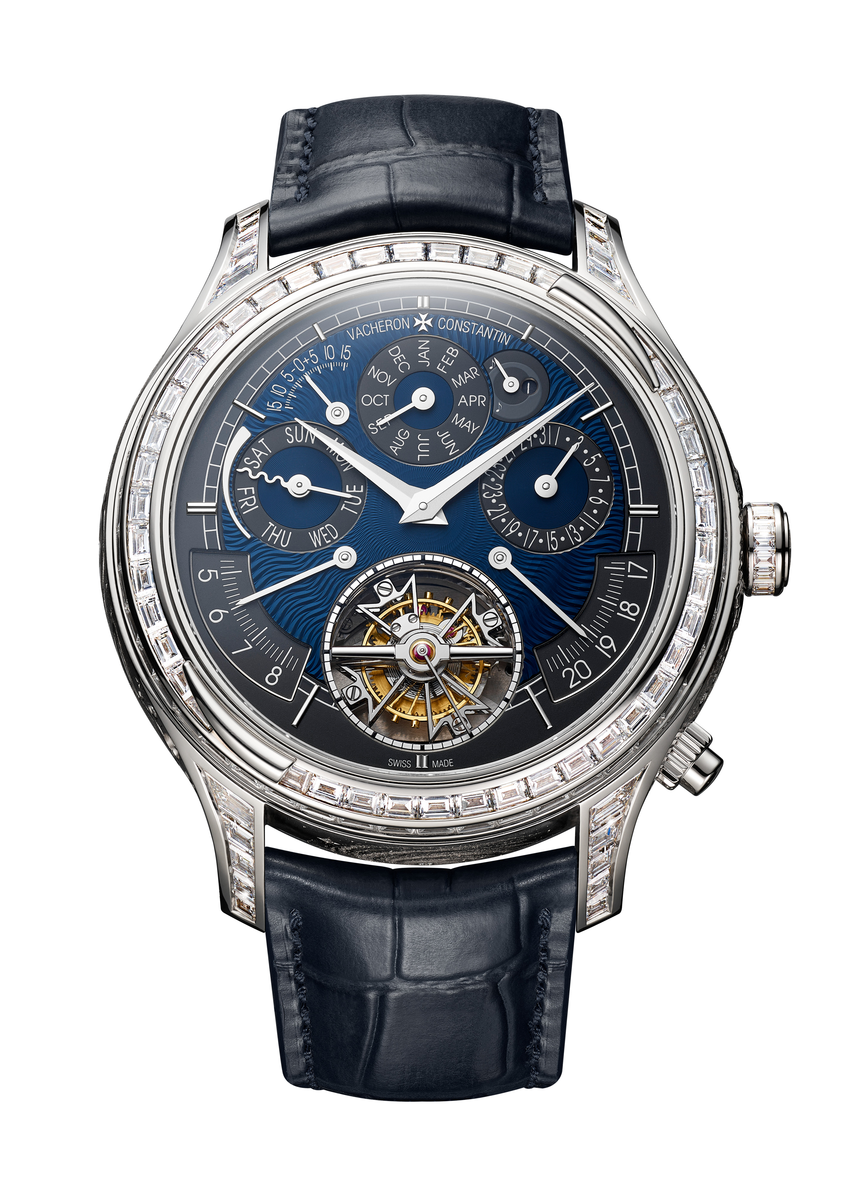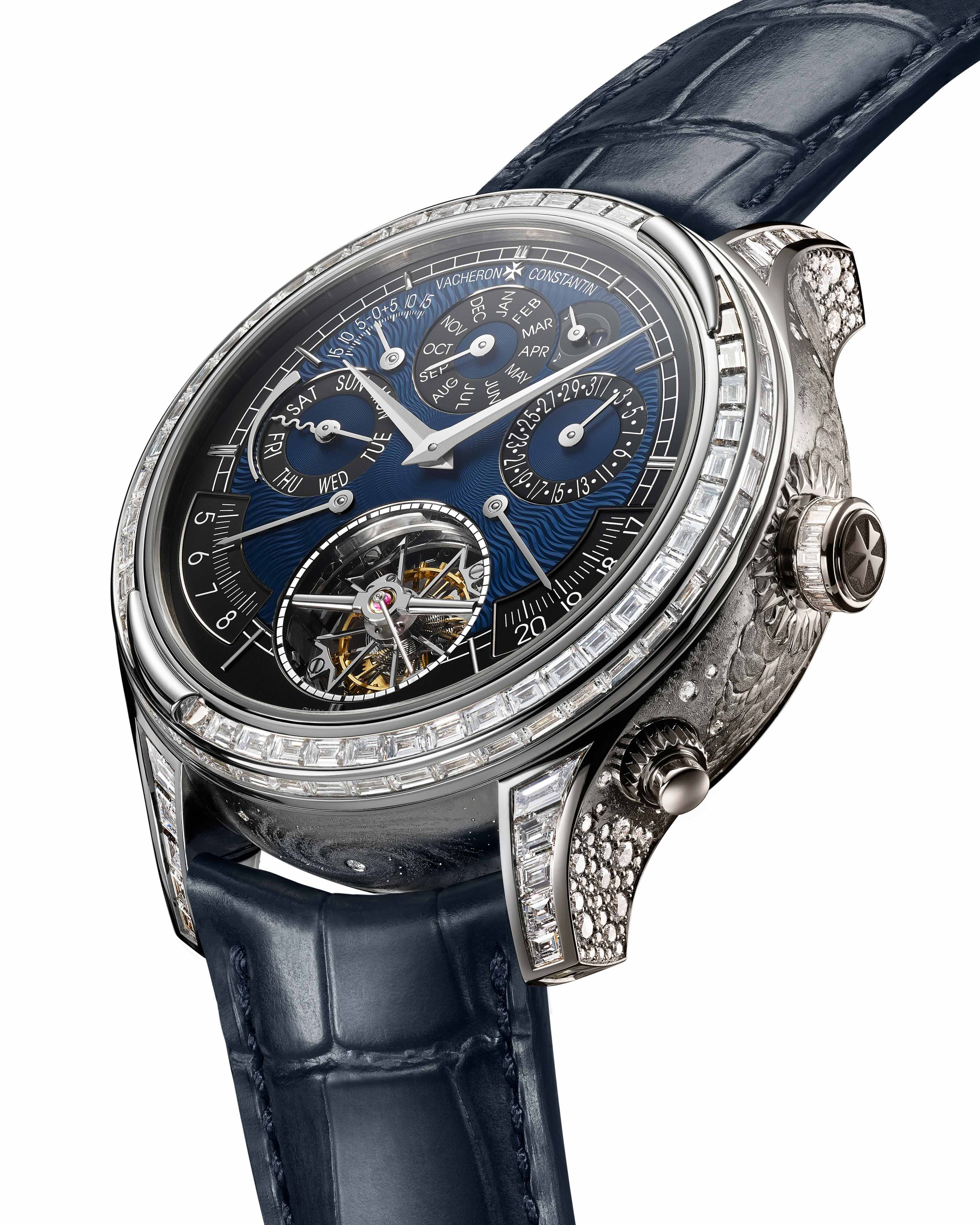 UN COMMENTAIRE ? Par définition, une pièce unique n’a pas d’autre prix que la demande d’un amateur quand elle est confrontée à la volonté d’une marque face à une montre qui représente des centaines d’heures de travail. On peut cependant estimer qu’une telle montre se négociera à sept chiffres, sans doute quelque part entre cinq et dix millions de francs. Un prix qui n’a rien paradoxalement d’exorbitant quand on considère le déploiement de compétences et de savoir-faire artisanaux qui ont été nécessaires pour sa réalisation (volumineux boîtier en or double face de 47 mm x 19,1 mm d’épaisseur, serti de 184 diamants baguette et de 163 diamants de taille brillant, animé par un mouvement à remontage manuel prévu pour 58 heures de réserve de marche et comptant 832 composants pour 16 complications (heures, minutes, tourbillon, petites secondes sur tourbillon, calendrier perpétuel, équation du temps, heure du lever et du coucher du soleil, répétition minutes, indication du couple de sonnerie, carte céleste de l’hémisphèrenord, phase de la lune, âge de la lune, heures et minutes du temps céleste, saisons et signes du zodiaque). Une pièce unique de qualité musée qui marque le 270e anniversaire de Vacheron Constantin…