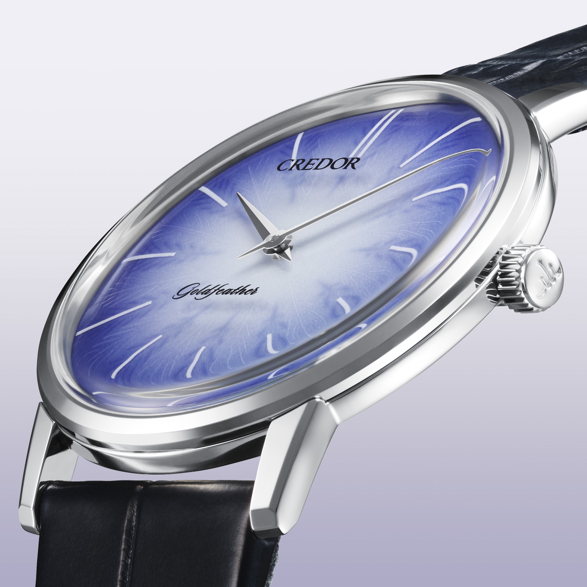 UN COMMENTAIRE ? Le nom de la pointe de diamant la mieux taillée de toute l’horlogerie japonaise (propriété du groupe Seiko) est, en fait, un nom français : « Credor » pour condenser « Crêtes d’or », nom qui fait référence aux sommets enneigés de vallées suisses illuminées par le soleil levant. En revanche, les montres témoignent d’un sens très japonais de la haute horlogerie, dans l’exécution du mouvement comme dans le soin apporté à la décoration du cadran. Cette montre Goldfeather est tout sauf banale, en dépit d’une allure ultra-classique : deux aiguilles, boîtier en acier assez mince de 43,2 mm x 8,3 mm d’épaisseur et mouvement « à l’ancienne » qui se remonte manuellement (37 heures de réserve de marche) avec une précision qui n’a rien d’exceptionnel [+25/-15 secondes par jour : ce n’est pas l’exploit, tout comme l’étanchéité à 30 m à peine suffisante pour se laver le mains – et encore !]. La vraie originalité, c’est le cadran en porcelaine de l’atelier Imari Nabeshima, d’une impeccable réputation locale dans un pays qui sait respecter et honorer les grands artisans : on admirera la délicatesse du bleu de cobalt « dégradé » et la finesse du motif de « plume » (positif et négatif) qui enrobe les index. Du grand art à la japonaise, de même que les lignes fluides mais très tendues et néanmoins sensuelles du boîtier relèvent du grand art de ce qui se fait de meilleur en termes de design horloger. Dernier plaisir : le prix, resté relativement modéré (comptez dans les 12 000 euros si vous parvenez à trouver une des soixante pièces de cette série limitée de Goldfeather, qui n’a rien de doré en dépit de son nom). En version Swiss Made, cette montre aurait aisément coûté le double. Moralité : les Suisses ont du souci à se faire, comme ils pourront le vérifier au printemps, puisque Credor exposera ses montres en même temps que Grand Seiko au salon genevois Watches & Wonders…