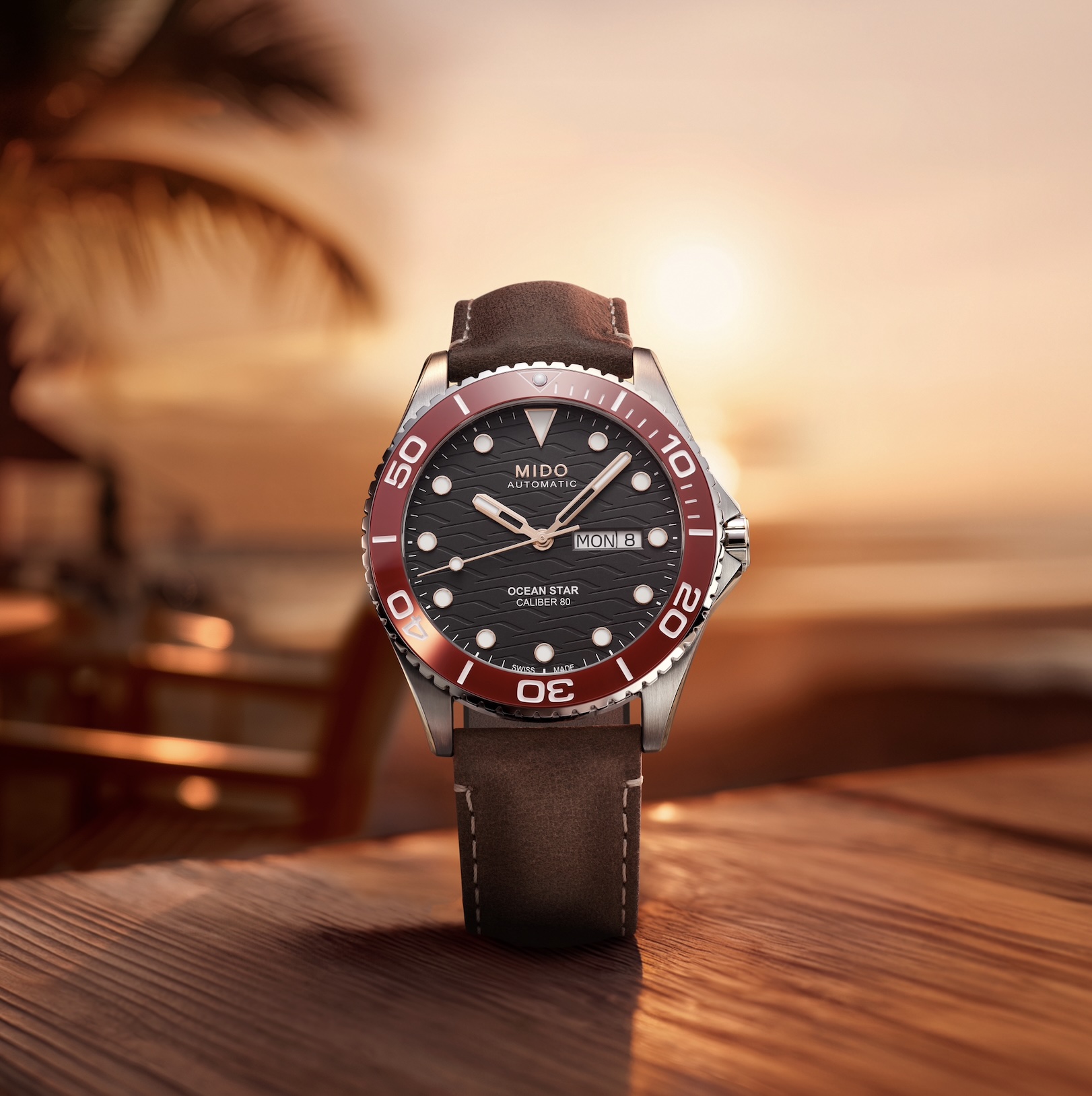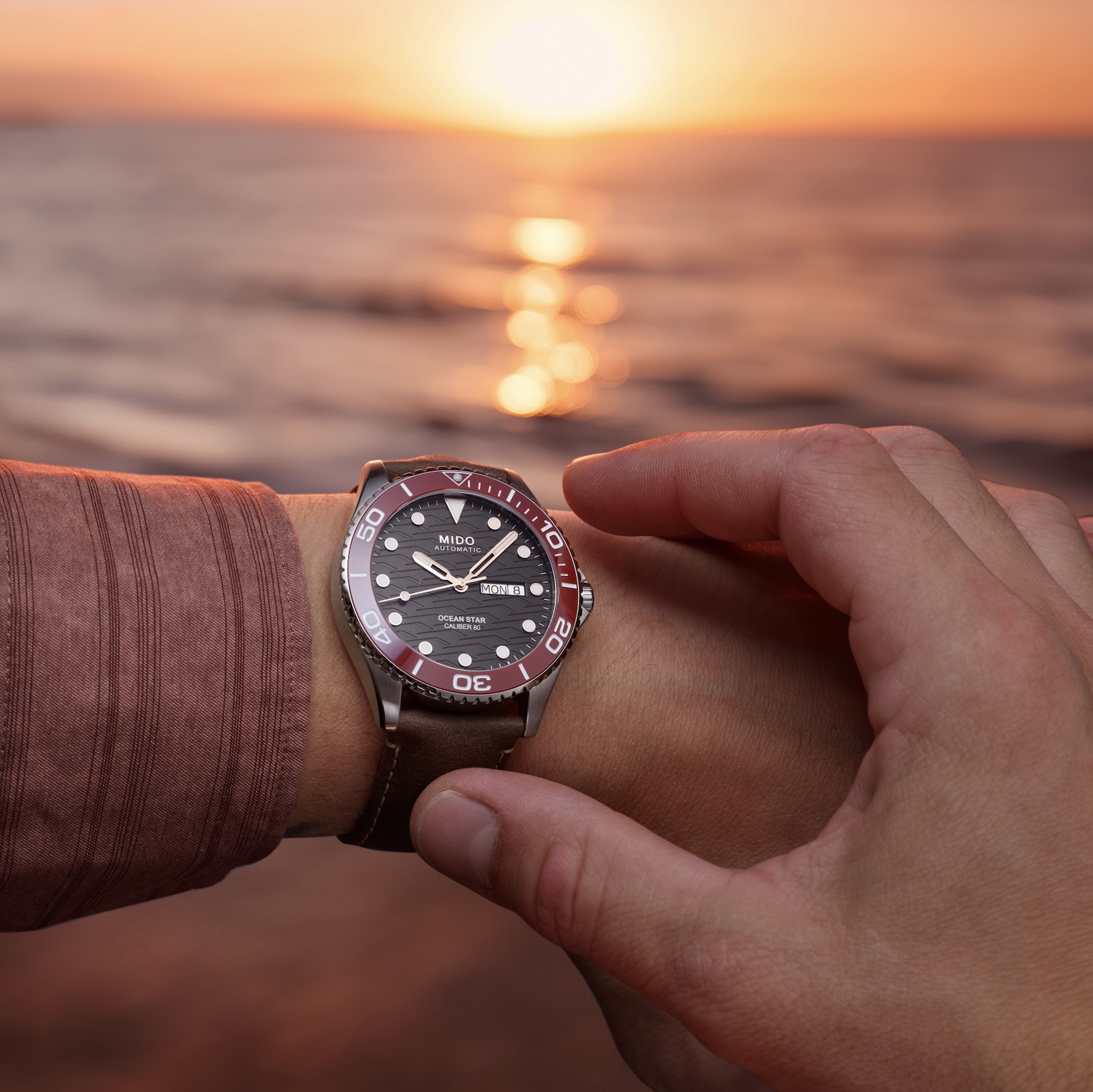 Noir crépuscule, rouge incandescent : la nouvelle Ocean Star 200C de Mido évoque les couchers de soleil tropicaux. Elle se distingue par une combinaison de couleurs unique, tout en offrant la fiabilité inébranlable d’une montre sportive ultra-performante — étanche jusqu’à 200 mètres, standard minimum chez Mido pour sa collection Ocean Star. La nouvelle Ocean Star 200C capture l’émotion du crépuscule. Les flots miroitent, le soleil disparaît, rougeoyant. Son cadran noir mat est décoré des vaguelettes signature de la collection. Tout autour, une lunette en céramique écarlate – à rotation unidirectionnelle – renforce son ADN marin. Depuis 1930, année de l’invention du système Aquadura, Mido maîtrise la résistance à l’eau. Surnommée à l’époque le « King of Waterproof Watches », la marque suisse a depuis continué à enrichir son savoir-faire historique en étanchéité, notamment grâce à des matériaux innovants. Ainsi Mido utilise de l’acier inoxydable pour le boîtier, de la céramique d’une dureté extrême pour la lunette. Du Super-LumiNova blanc sur les indications d’affichage la rend adaptée à toutes les situations, même après le tomber du jour. Pour une touche plus sophistiquée, Mido pare cette Ocean Star 200C d’aiguilles de couleur or rose et d’un bracelet en cuir brun aux surpiqûres blanches.