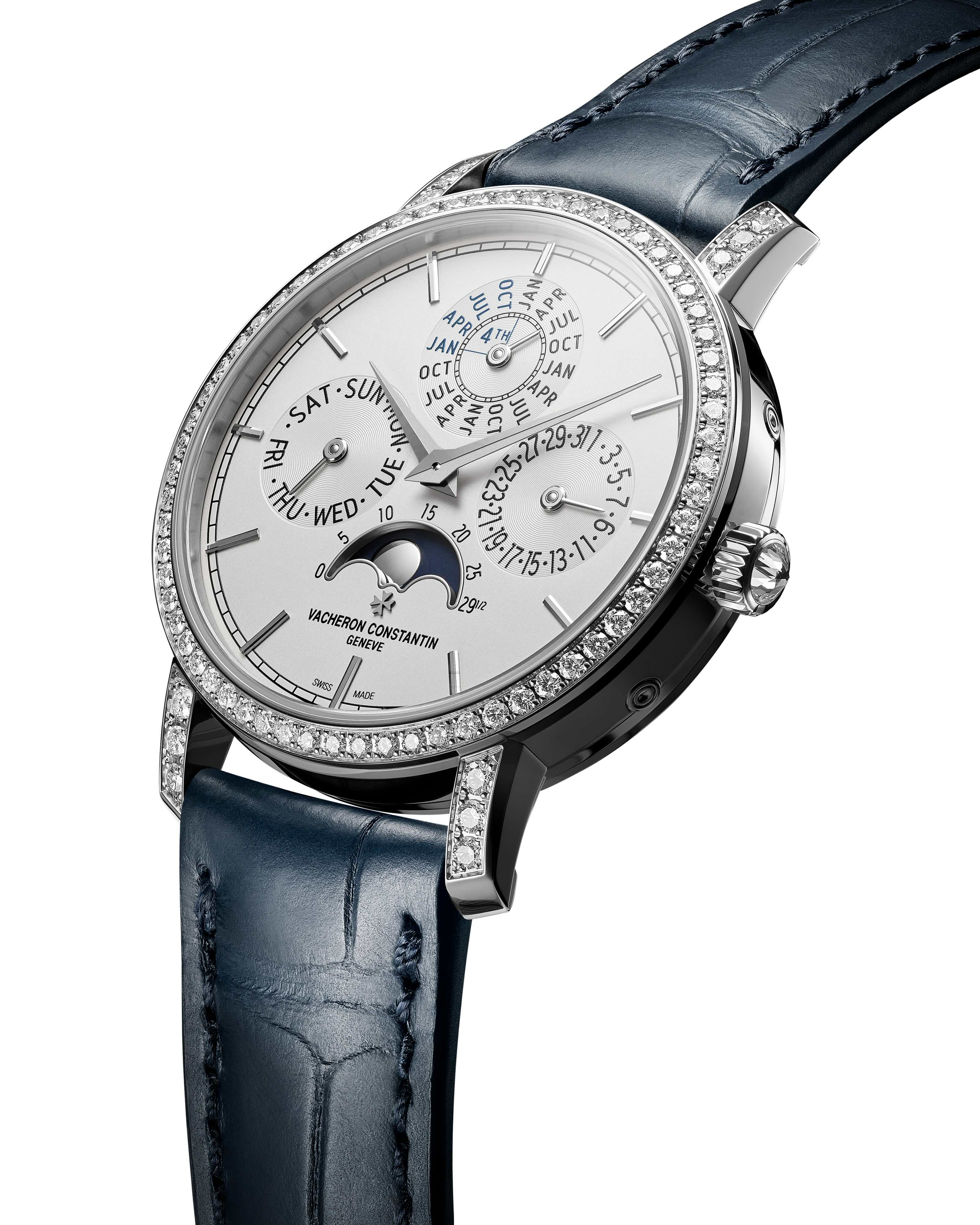 Son boîtier de 36,5 mm de diamètre, idéalement proportionné pour les poignets masculins comme féminins, s’inspire des dimensions de la référence 43031 créée en 1983. Lors de son lancement, au plus fort de la « crise du quartz » marquée par un désintérêt croissant pour l’horlogerie mécanique, la référence 43031 a largement contribué à redonner ses lettres de noblesse à la Haute Horlogerie. Considérée comme le quantième perpétuel emblématique de Vacheron Constantin, elle est restée en production durant les deux décennies. Les proportions intemporelles et la silhouette tranchée du boîtier de la Traditionnelle quantième perpétuel ultra-plate sont soulignées par l’esthétique rigoureuse du cadran, en écho à celui de référence 43031. L’accent est mis sur l’équilibre des formes et la lisibilité des compteurs sur le fond opalin argenté traditionnel du modèle. La date, le jour de la semaine et le mois sont indiqués par aiguilles sur trois compteurs circulaires disposés en pyramide symétrique dans la partie supérieure du cadran, tandis que l’affichage combiné de l’âge et des phases de lune prend place à 6h. Le modèle en or rose met l’accent sur la cohérence et l’harmonie entre le boîtier, les aiguilles Dauphine facettées et les index bâton, tous façonnés en or rose 18K 5N. Le contraste provient du disque des phases de lune bleu foncé, assorti au bracelet en cuir d’alligator avec surpiqûres ton sur ton. Le modèle en or blanc joue subtilement sur les couleurs classiques avec des aiguilles et index en or rose 18K 5N, tandis que le disque des phases de lune affiche une teinte bleu clair. Le bracelet en cuir d’alligator d’une nouvelle nuance de brun clair, complète la composition. Le modèle en or blanc serti adopte une palette colorée minimaliste avec un boîtier, des aiguilles et des index en or blanc 18K. L’éclat froid des diamants en serti grain sur la lunette, les cornes et la couronne fait écho au ton argenté du cadran opalin. Le bleu foncé du disque des phases de lune est repris sur le bracelet en cuir d’alligator. En respectant les codes de la Haute Horlogerie traditionnelle dans une interprétation contemporaine, ces trois nouveaux modèles de la Traditionnelle quantième perpétuel ultra-plate de 36,5 mm incarnent la philosophie de la Maison consistant à trouver un équilibre harmonieux entre technique et esthétique, passé et présent.