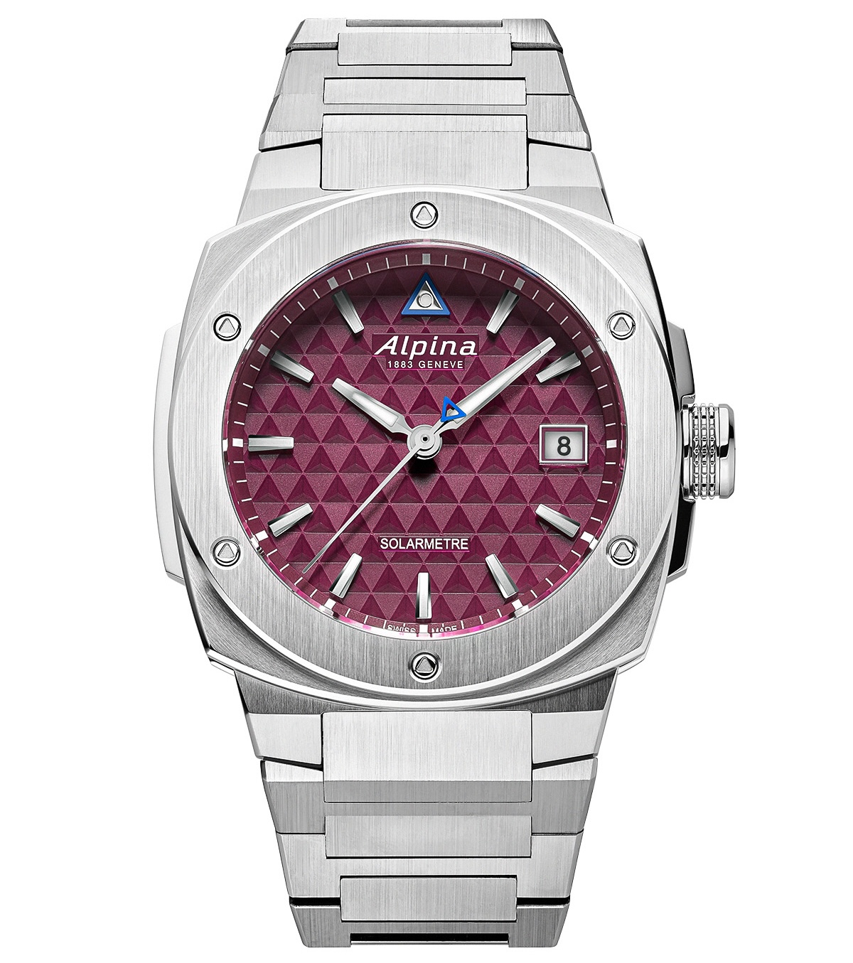 UN COMMENTAIRE ? Le quartz solaire est un excellent raccourci pour réconcilier respect de l’environnement et retour horloger à des prix accessibles – un double argument qui permet à cette Alpiner Extreme Solarmetre de ne pas dépasser les 1 200 euros pour une montre « sport chic » à bracelet métallique intégré (boîtier « coussin » en acier de 37,5 mm x 38,9 mm x 10,1 mm d’épaisseur, étanche à 100 m et animé par un mouvement à quartz solaire suisse (La Joux-Perret) dont la batterie propose dix mois d’autonomie (sans lumière). Joli cadran bordeaux à motifs triangulaires. C’est la première montre « solaire » d’Alpina et, avec son fonctionnement quasiment illimité, cette pionnière a tout pour nous pousser à l’aventure !