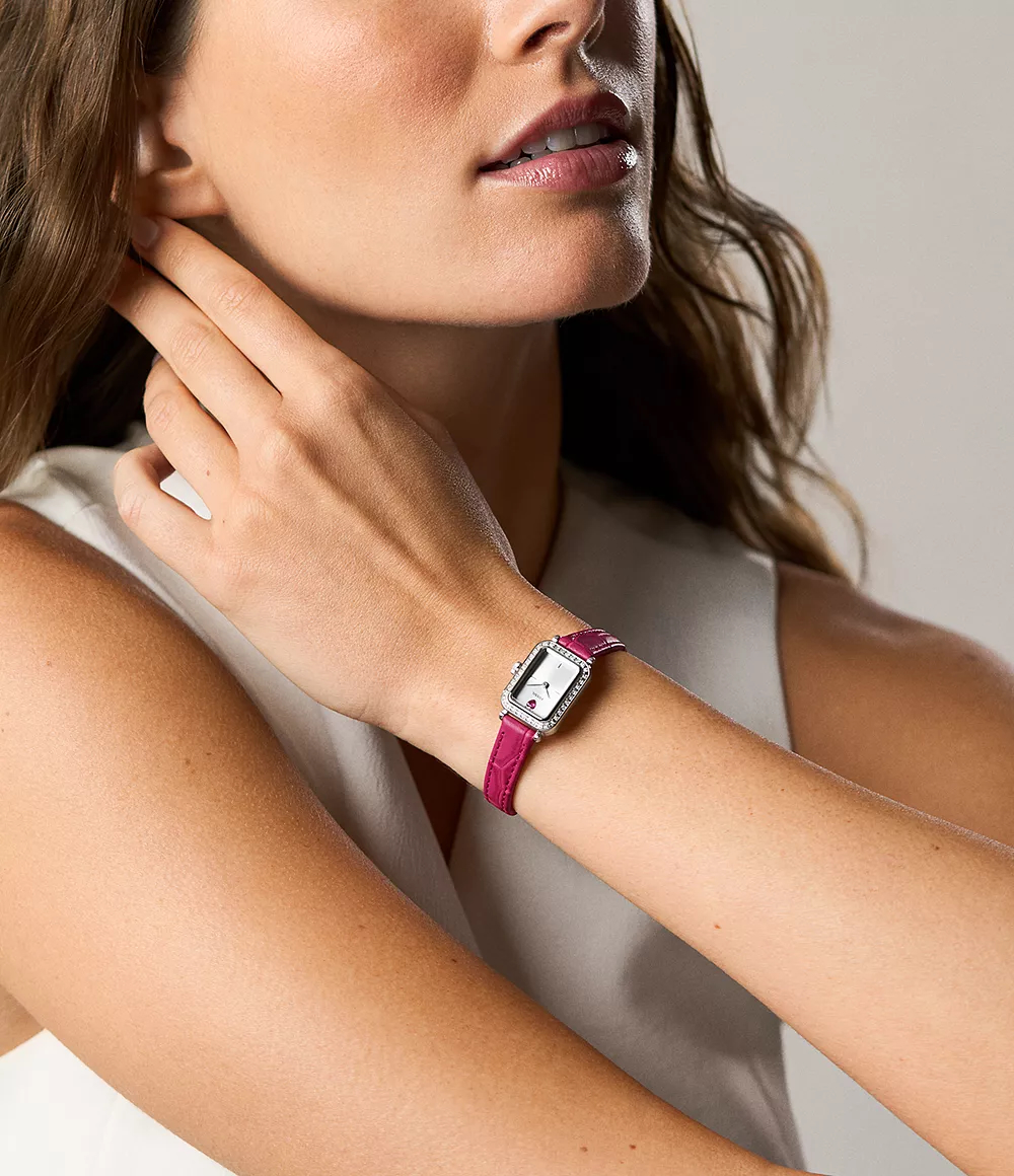 Cette montre présente un boîtier rectangulaire argenté et un élégant cadran soleillé assorti qui créent un équilibre raffiné entre texture et brillance. Une pierre rouge en forme de cœur sur le cadran ajoute une touche irrésistible qui rend cette montre vraiment unique. Le bracelet en cuir rose lisse apporte une finition douce et discrète, et se ferme par une boucle ardillon pour un ajustement facile. Petit format. Grande allure. La toute dernière manière d’adopter notre modèle le plus prisé. La collection Mini se dévoile Inspirée du charme des montres vintage, ce modèle délicat s’associe comme un bracelet. Faites de la place sur votre poignet. Emplacement dédié aux mantras. Gravez au dos du boîtier un message à votre image, plein d’assurance. La personnalisation est toujours offerte.