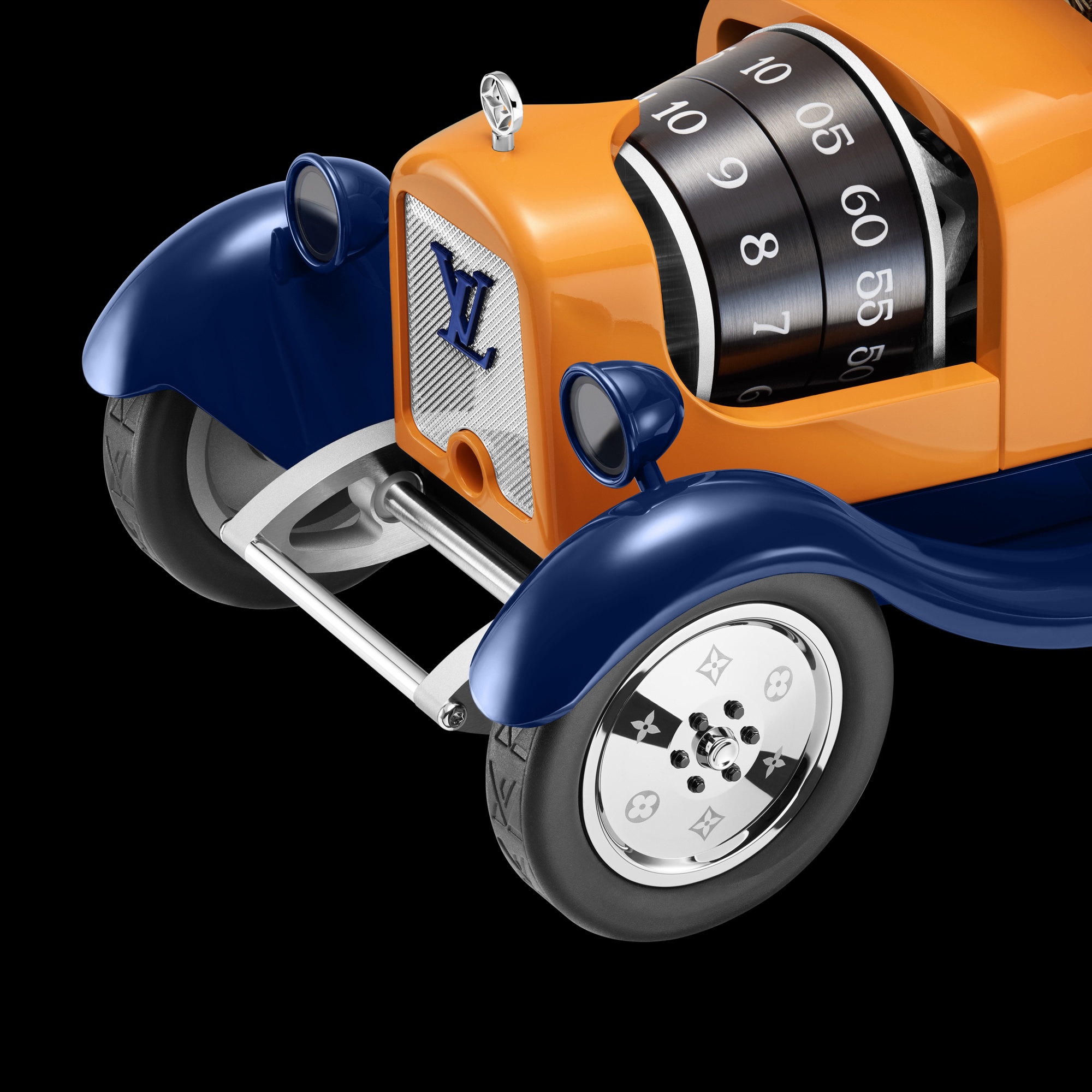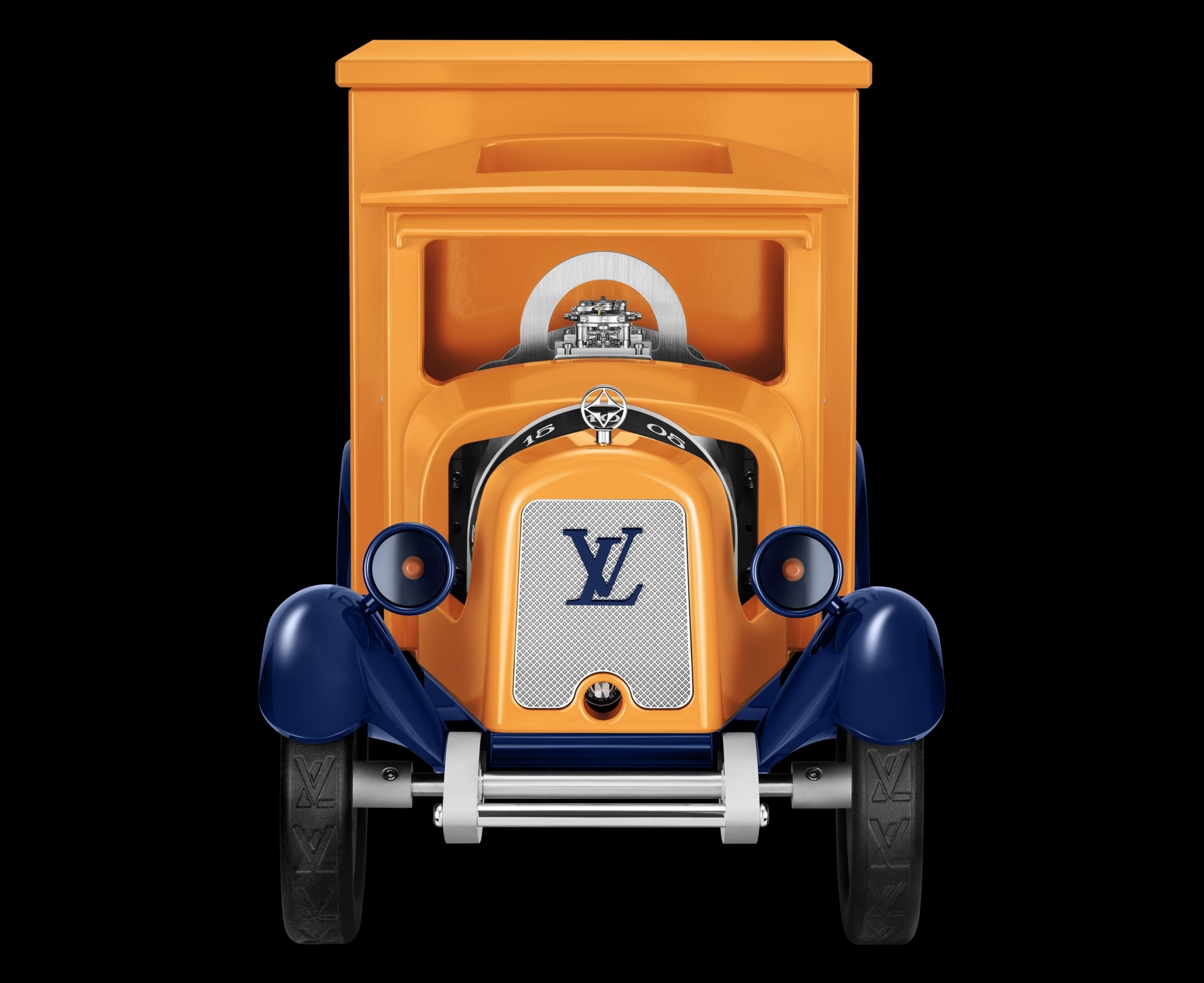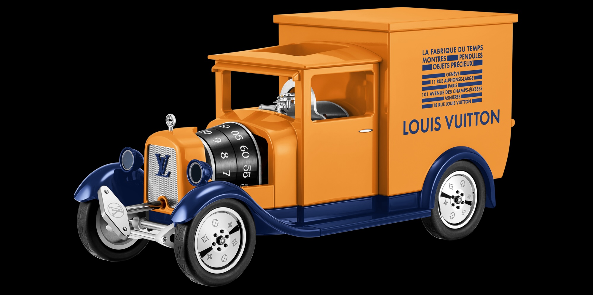 Façonnée dans un aluminium particulièrement léger et robuste, la camionette arbore les teintes safran et bleu sibyllin iconiques. Du capot orné d’une fleur de Monogram jusqu’au radiateur argenté où scintille le logo LV bleu flammé, jusqu’aux jantes délicatement parées de fleurs de Monogram, l’essence Louis Vuitton se révèle avec subtilité. Les pneus, quant à eux, sont estampillés du logo LV. A chaque déplacement, la Camionnette Louis Vuitton grave symboliquement son empreinte sur la route. La plaque d'immatriculation « LV 1854 » vient rappeler la date de fondation de la Maison, ancre intemporelle de cette épique aventure. Cette symphonie de savoir-faire trouve son expression la plus poétique dans l'intégration du mouvement au cœur de la Camionnette Louis Vuitton. Dans une rencontre inédite entre l'univers automobile et l'horlogerie, la place traditionnellement réservée au conducteur révèle ici le balancier du mouvement – un véritable cœur mécanique vibrant qui insuffle la vie à cet objet du temps, tissant un dialogue harmonieux entre puissance et précision. Depuis sa cabine revisitée, ce balancier invisible orchestre la lecture de l'heure. Les indications des heures et des minutes s’affichent par deux cylindres rotatifs aux chiffres tampographiés, tournant chacun à son rythme. Astucieusement intégrés sous le capot de la Camionnette, là où se logerait habituellement le moteur. L’échappement centré dans la cabine s’offre, quand à lui au regard par ses quatre parois transparentes : les vitres et le dôme. Le mouvement mécanique suisse, fruit d’une collaboration d’excellence, a été minutieusement conçu et fabriqué par L’Epée 1839 pour La Fabrique du Temps Louis Vuitton. Doté d’une réserve de marche de 8 jours et de ses 218 composants, il a été développé spécifiquement pour ce modèle.